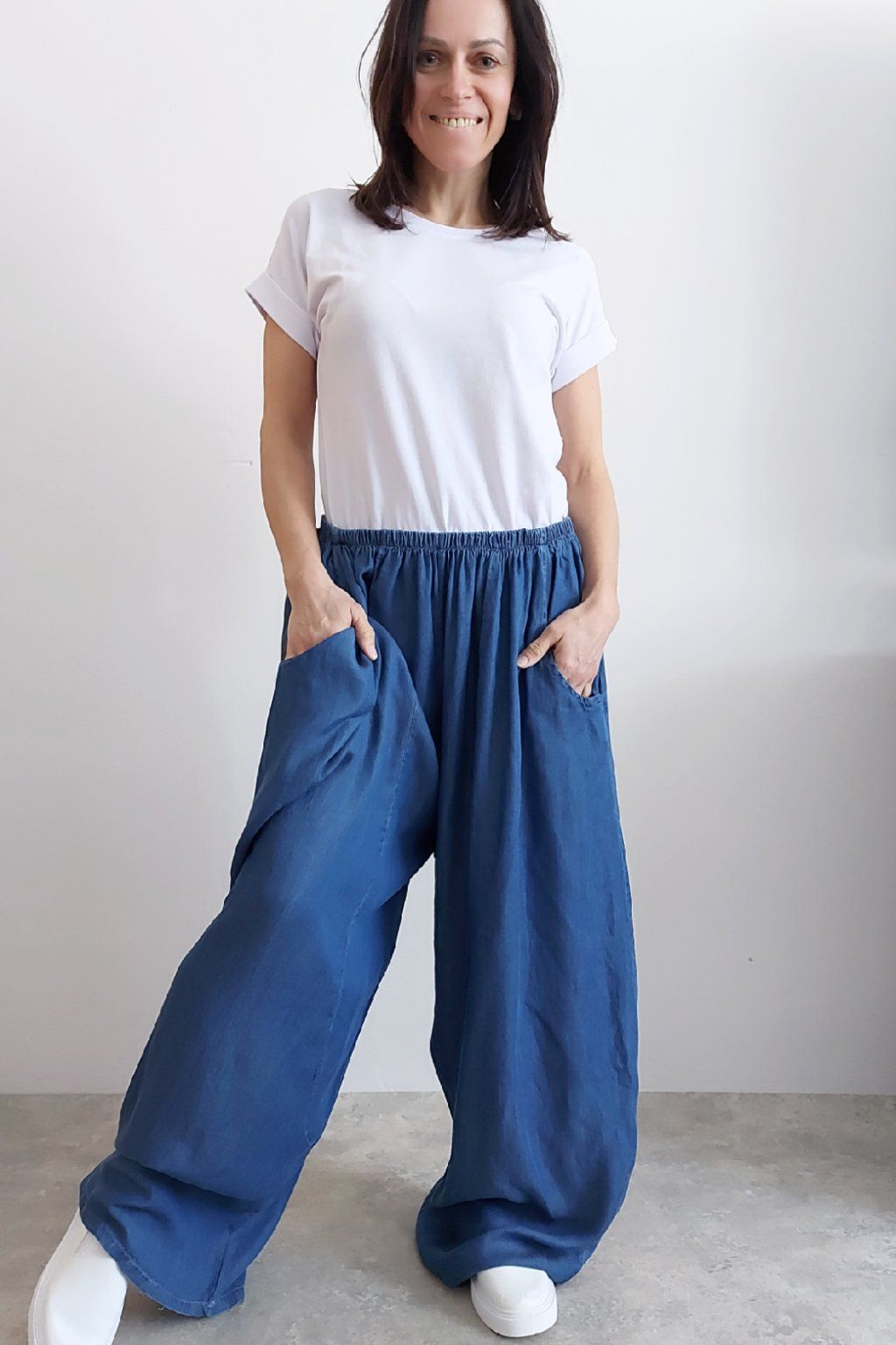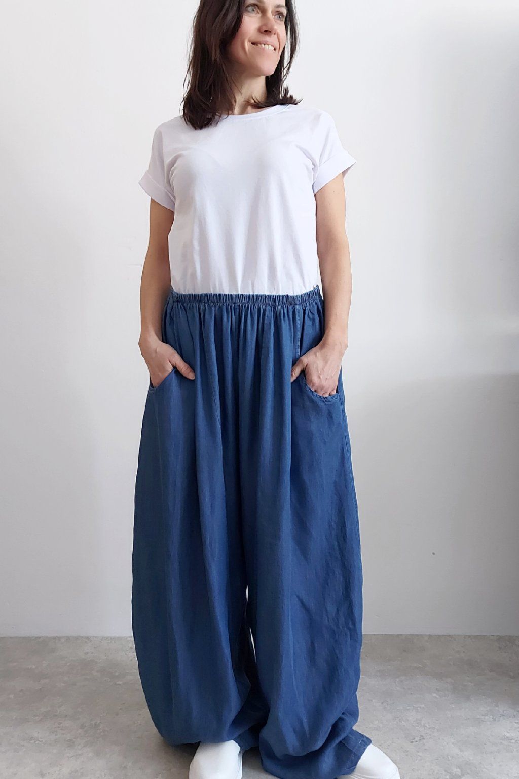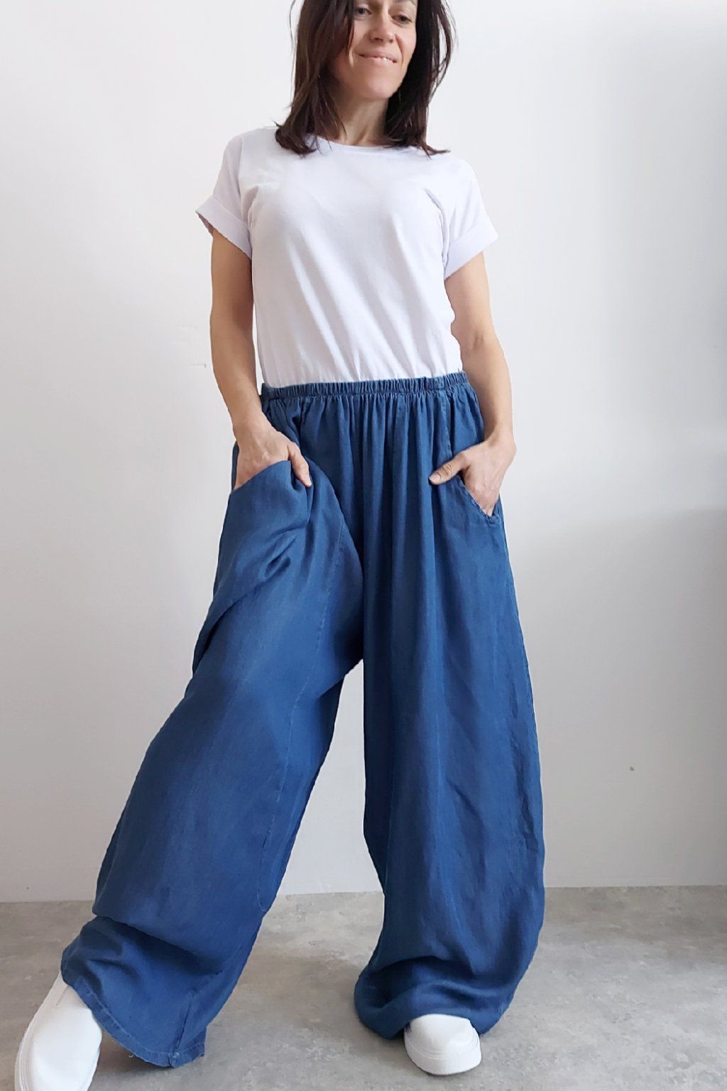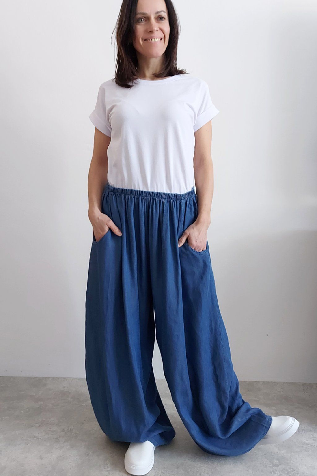 Kalhoty z lehoučkého - vzdušného materiálu. Imitace džínoviny. V pase do gumy, extra široké nohavice. Přední kapsy - vzadu bez kapes. Lehký, vzdušný materiál - ideální na jaro/léto. Není pružný. Foceno na vel. XS, výška 156cm i na vel. 2XL (pas 106cm, boky 122cm), výška 165cm. Vhodné pro vyšší postavy.