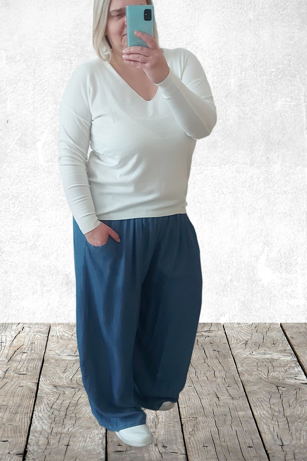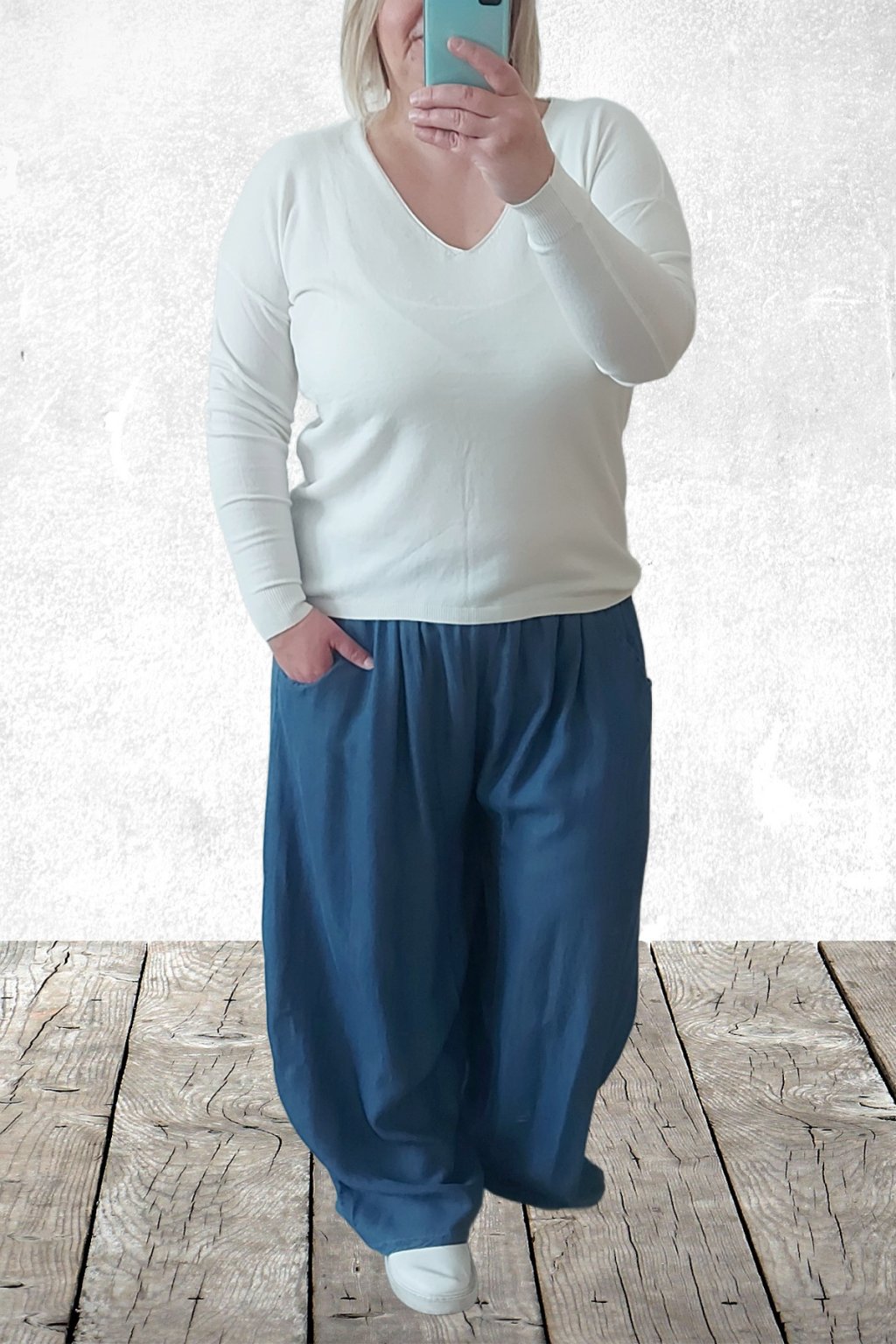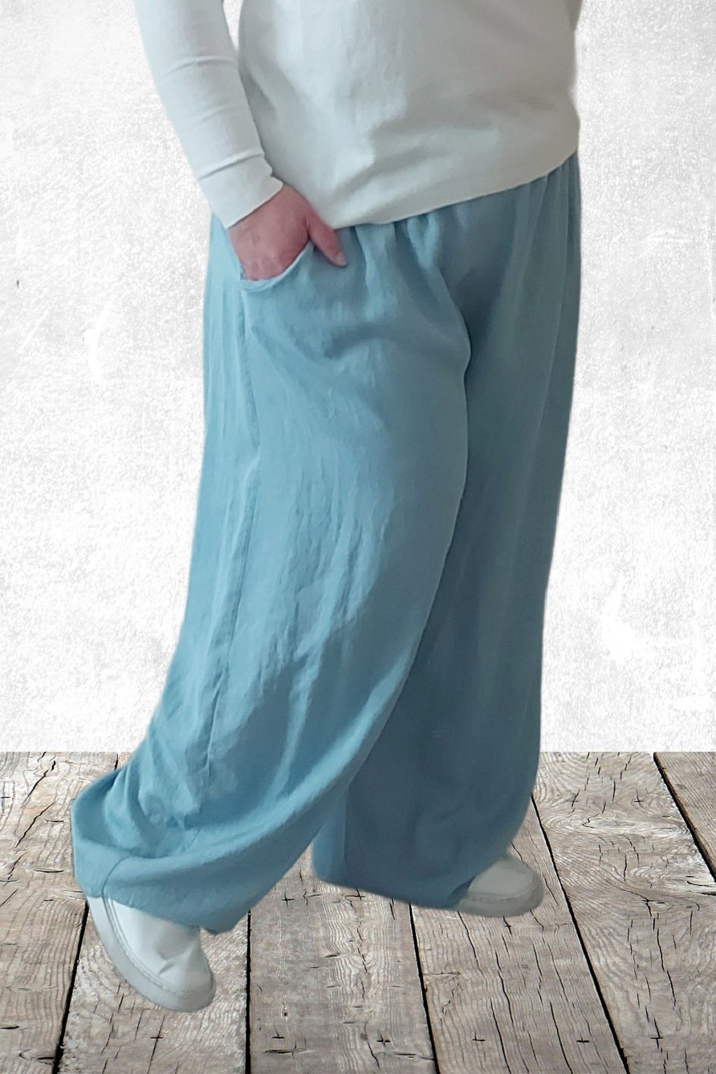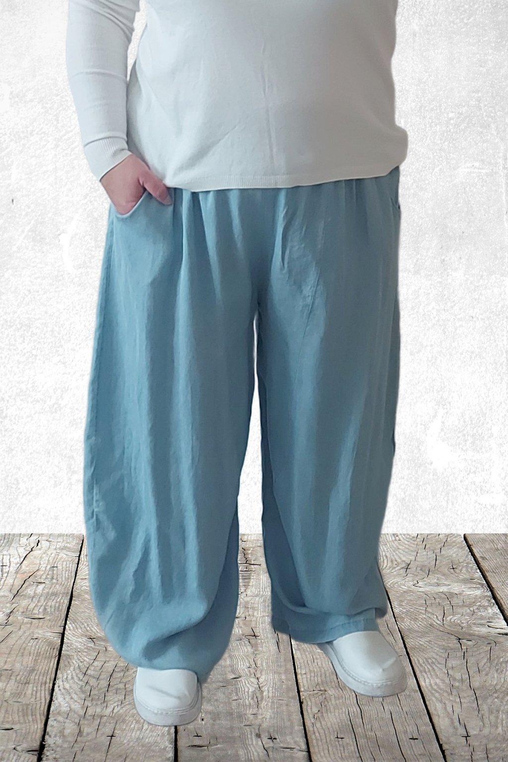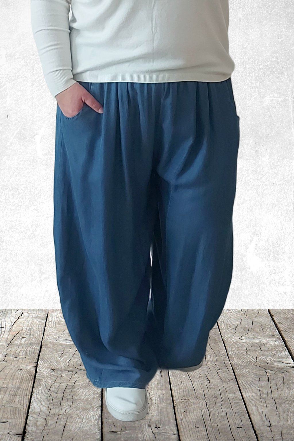 Kalhoty z lehoučkého - vzdušného materiálu. Imitace džínoviny. V pase do gumy, extra široké nohavice. Přední kapsy - vzadu bez kapes. Lehký, vzdušný materiál - ideální na jaro/léto. Není pružný. Foceno na vel. 2XL (pas 106cm, boky 122cm), výška 165cm.