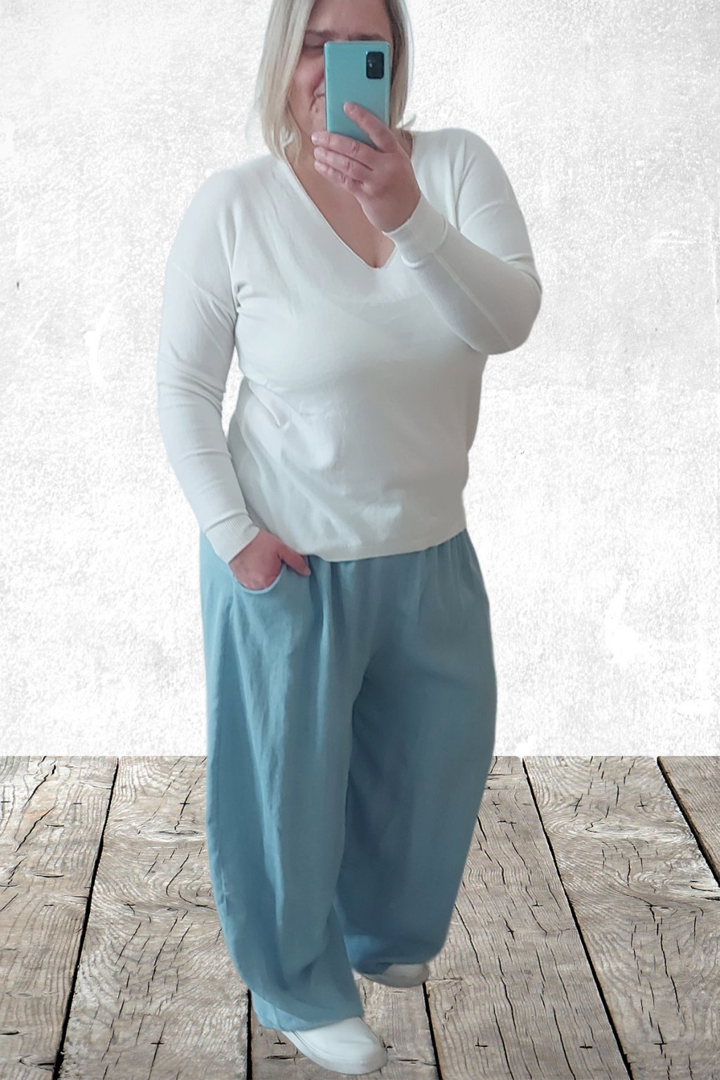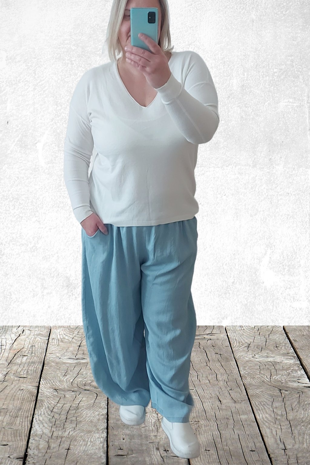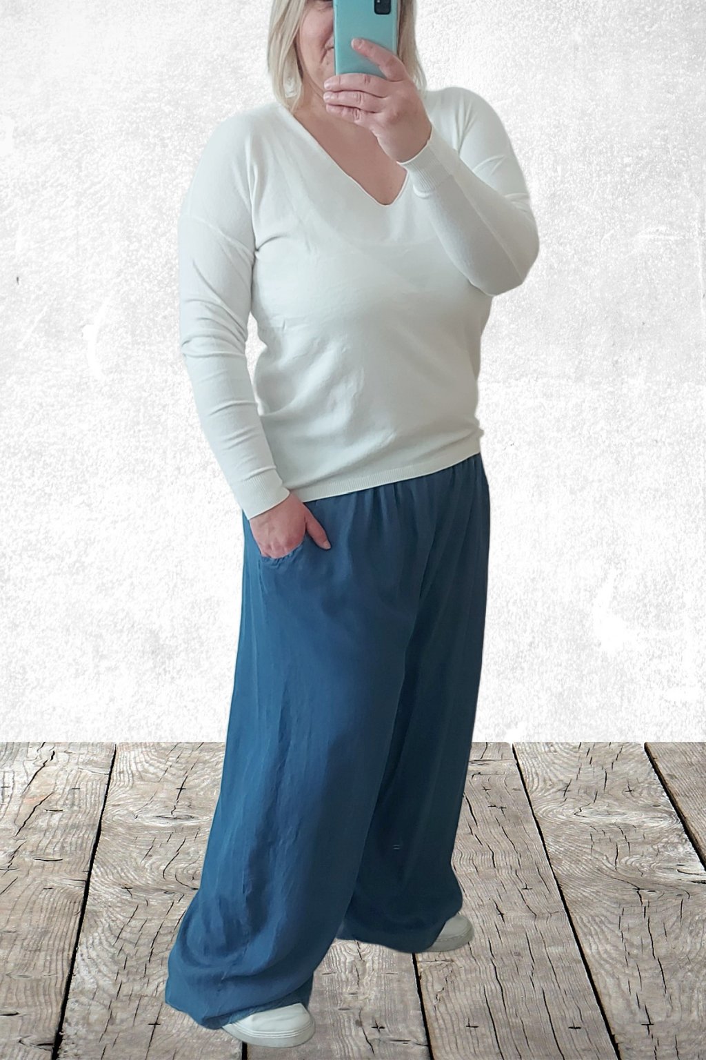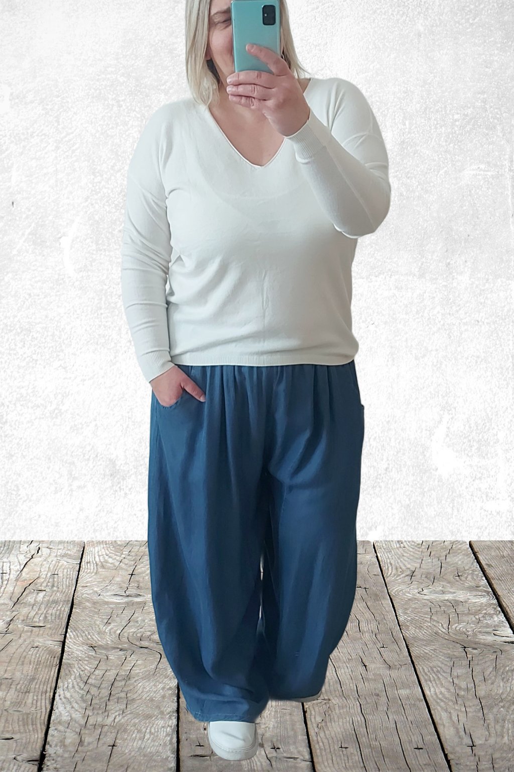 Kalhoty z lehoučkého - vzdušného materiálu. Imitace džínoviny. V pase do gumy, extra široké nohavice. Přední kapsy - vzadu bez kapes. Lehký, vzdušný materiál - ideální na jaro/léto. Není pružný. Foceno na vel. 2XL (pas 106cm, boky 122cm), výška 165cm.
