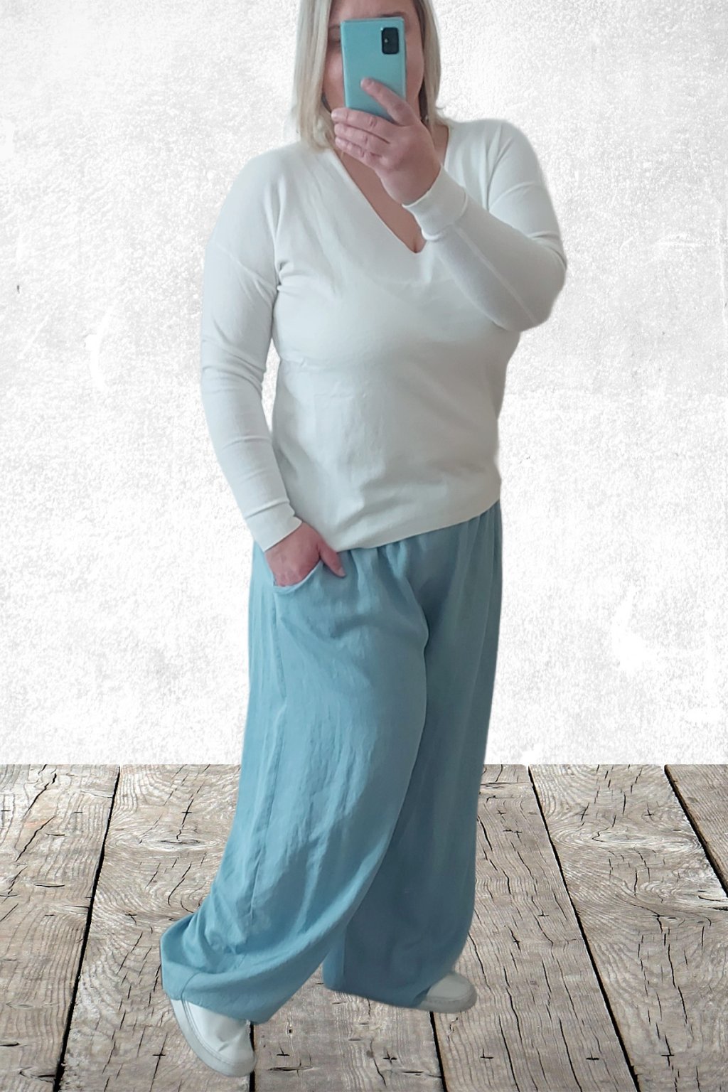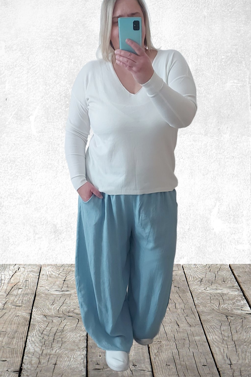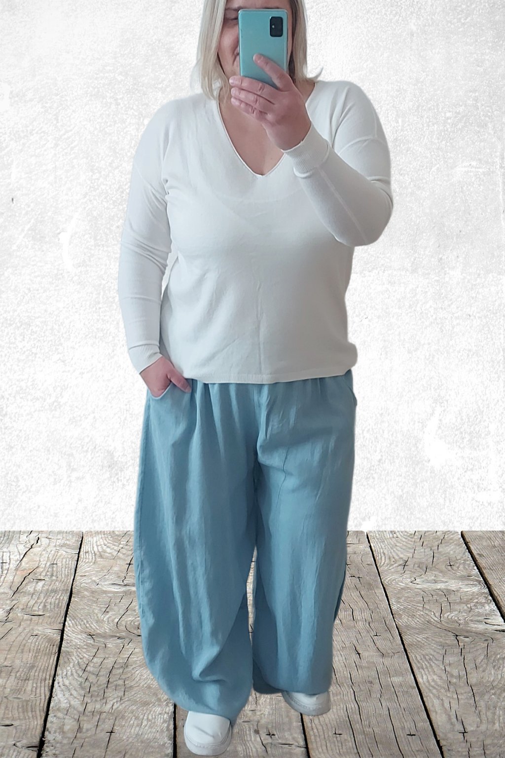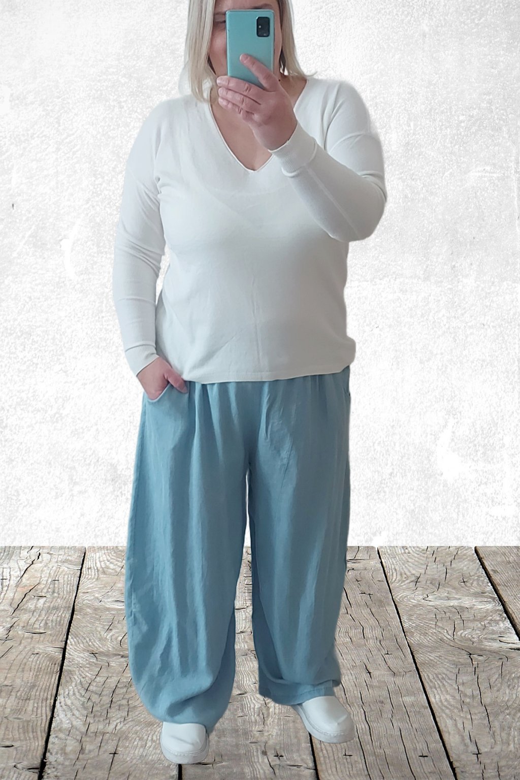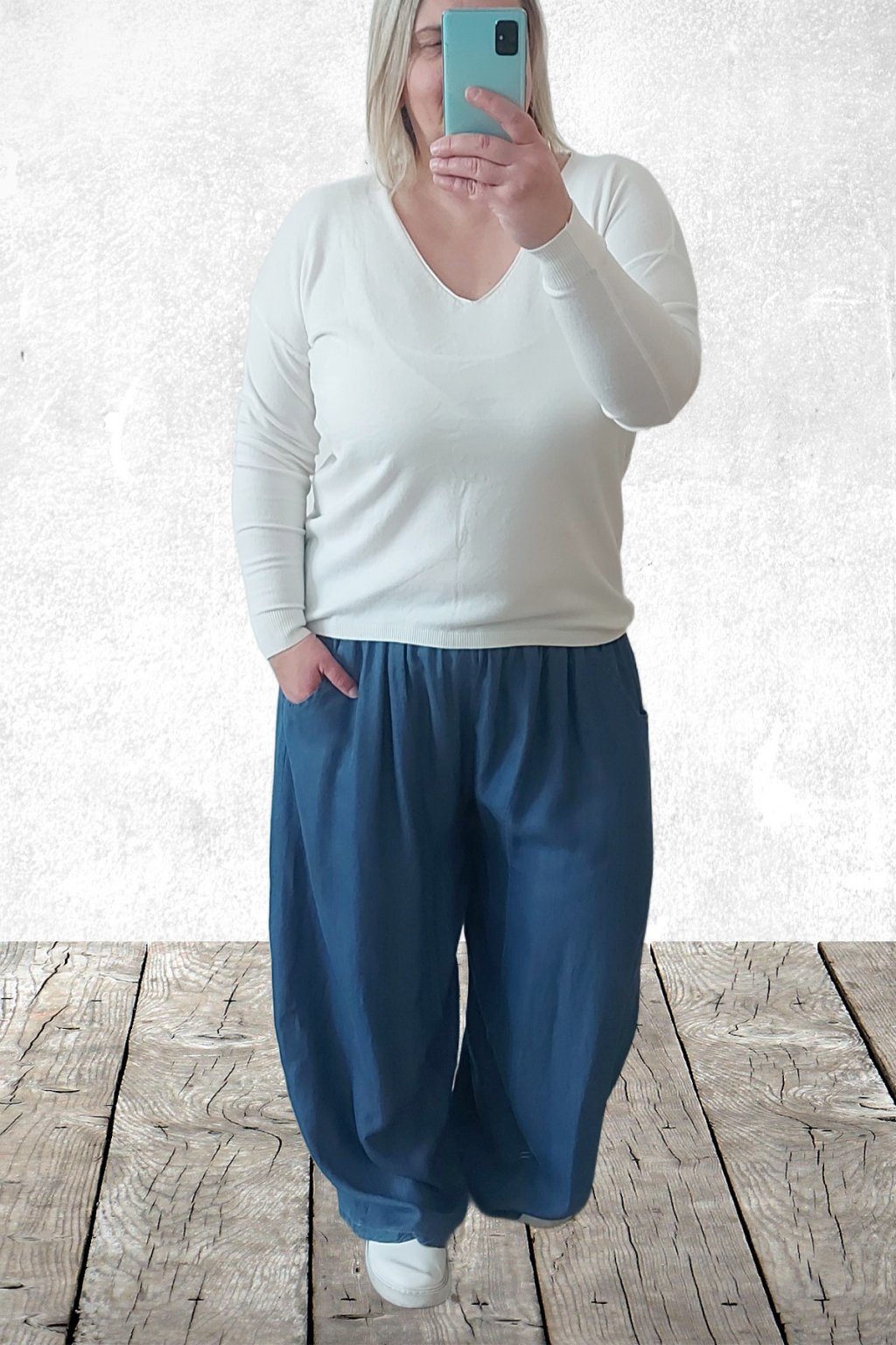 Kalhoty z lehoučkého - vzdušného materiálu. Imitace džínoviny. V pase do gumy, extra široké nohavice. Přední kapsy - vzadu bez kapes. Lehký, vzdušný materiál - ideální na jaro/léto. Není pružný. Foceno na vel. 2XL (pas 106cm, boky 122cm), výška 165cm.