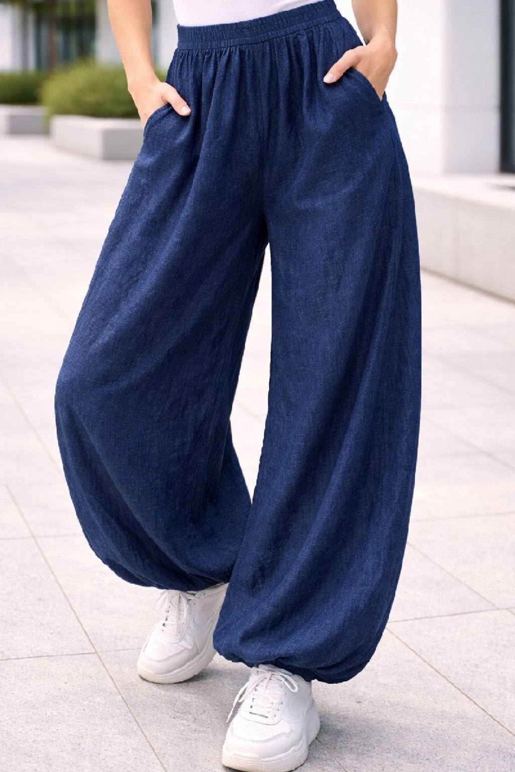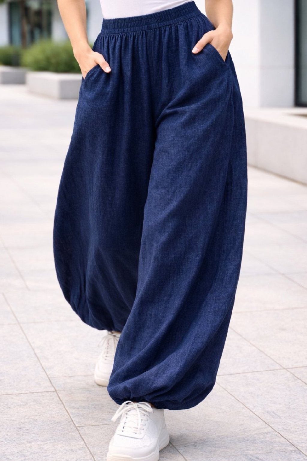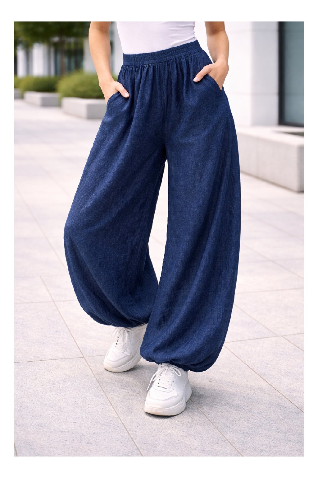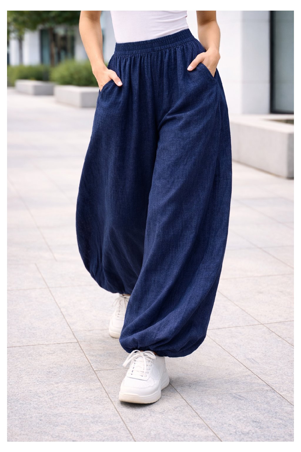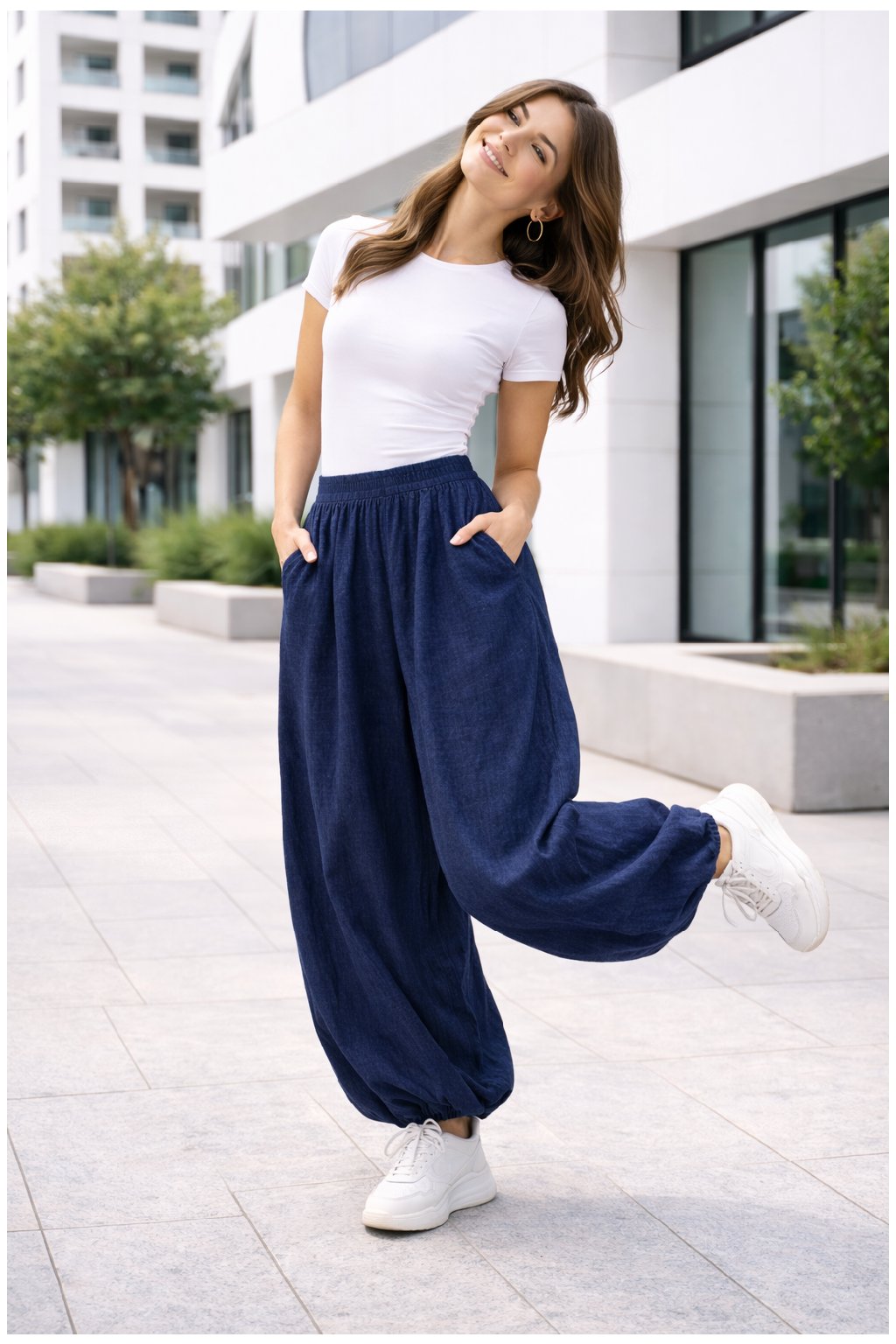 Super módní kalhoty z lehké džínoviny s harémovými - super širokými nohavicemi. Ty jsou ve spodní části ukončené do gumy. V pase guma. Přední kapsy - vzadu bez kapes. Lehký, vzdušný a pružný materiál. Sedí i na vel. 2XL s boky 120cm.