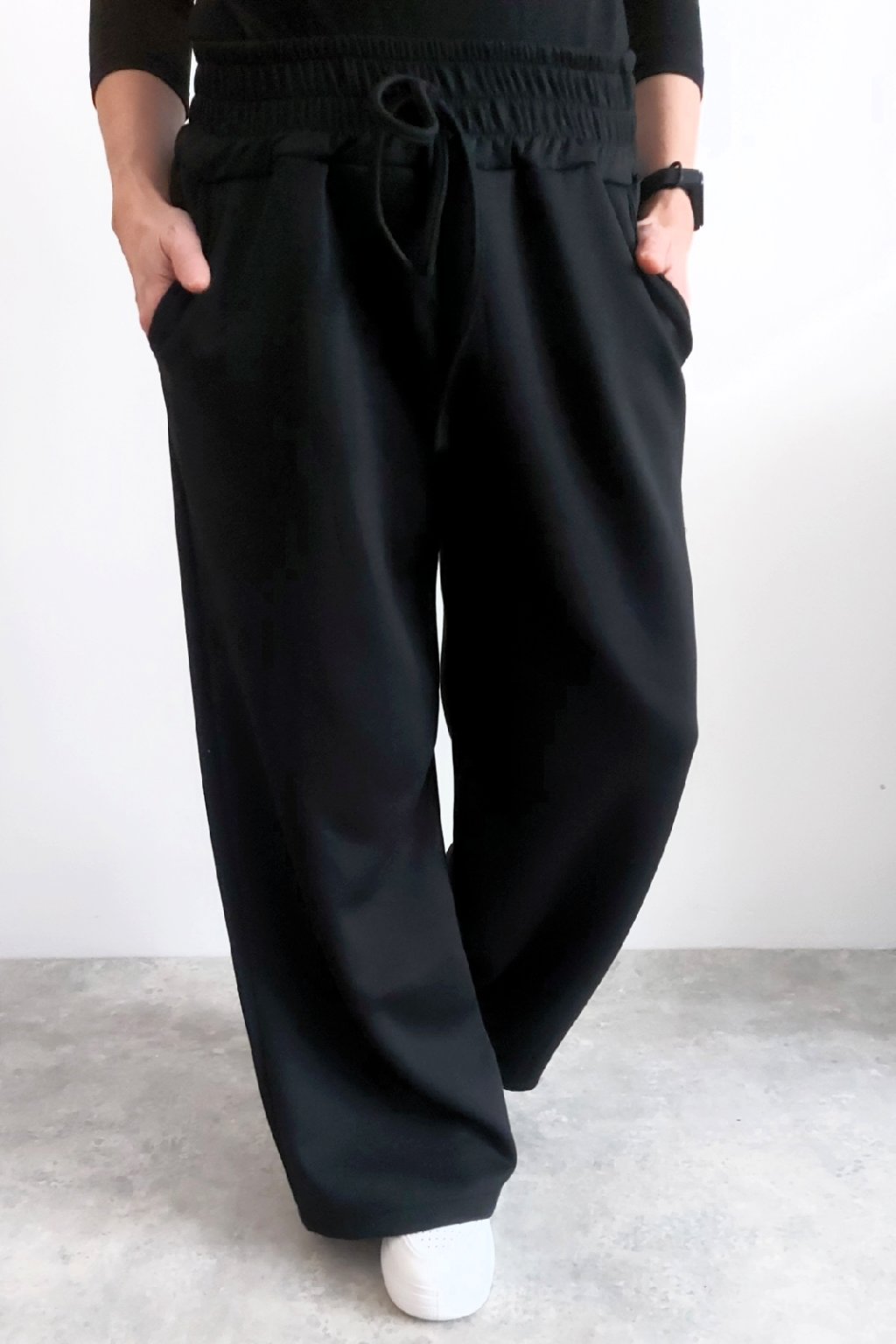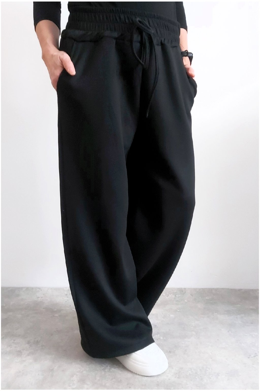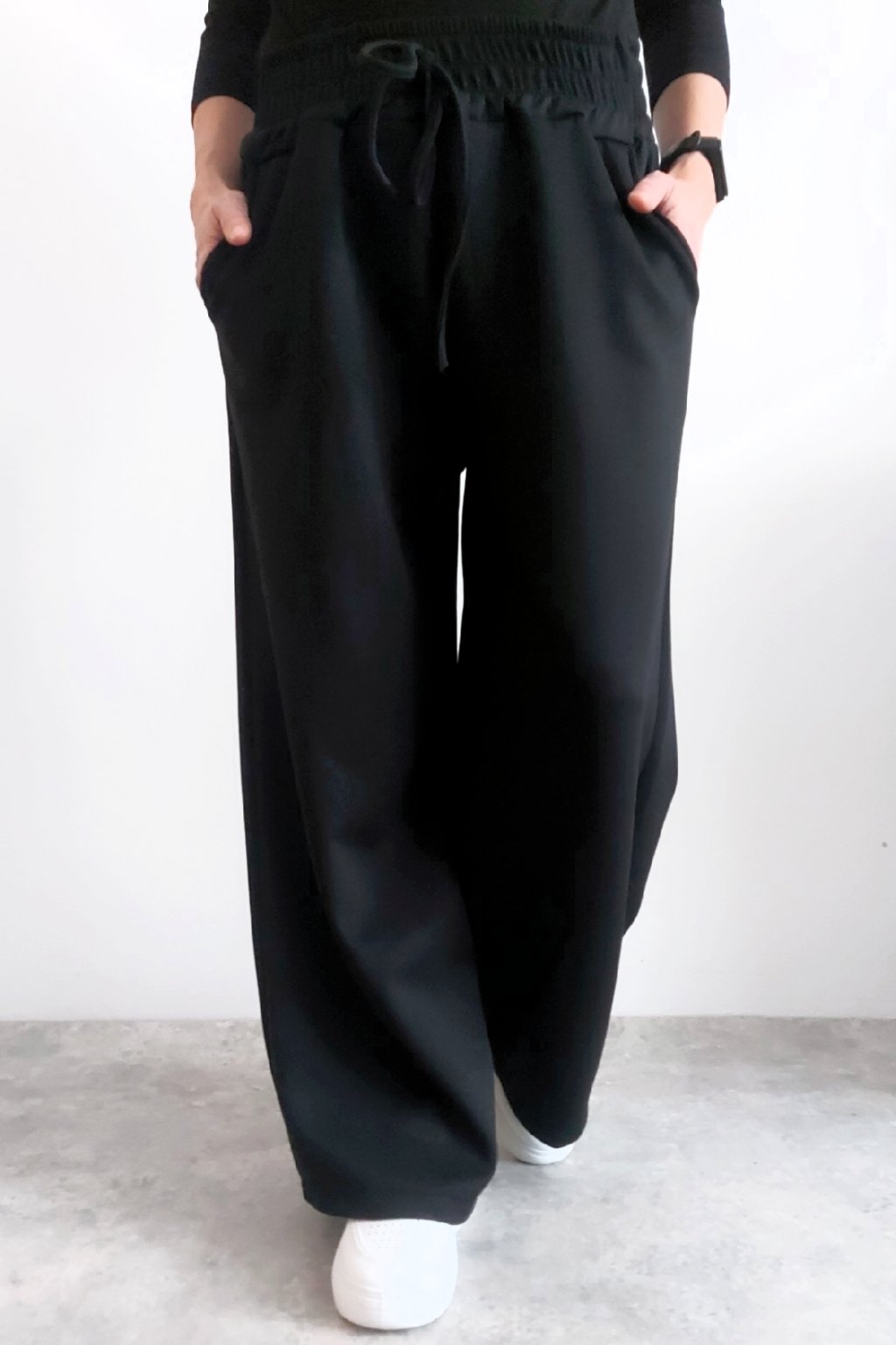 Skvělé kalhoty s širokými nohavicemi. V pase guma a šňůrka, ta je jen na ozdobu - není funkční a nelze s ní stáhnout obvod. Přední kapsy, vzadu bez kapes. Vhodné i pro větší velikosti. Materiál máslový - jemný, hebký, silnější, drží tvar, top kvalita. Foceno na vel. XS, výška 156cm i na vel. 2XL/3XL (pas 110cm, boky 120cm), výška 165cm.