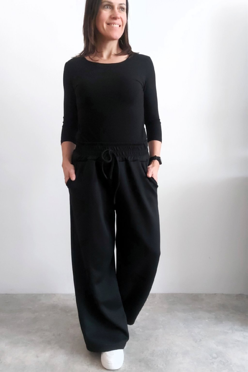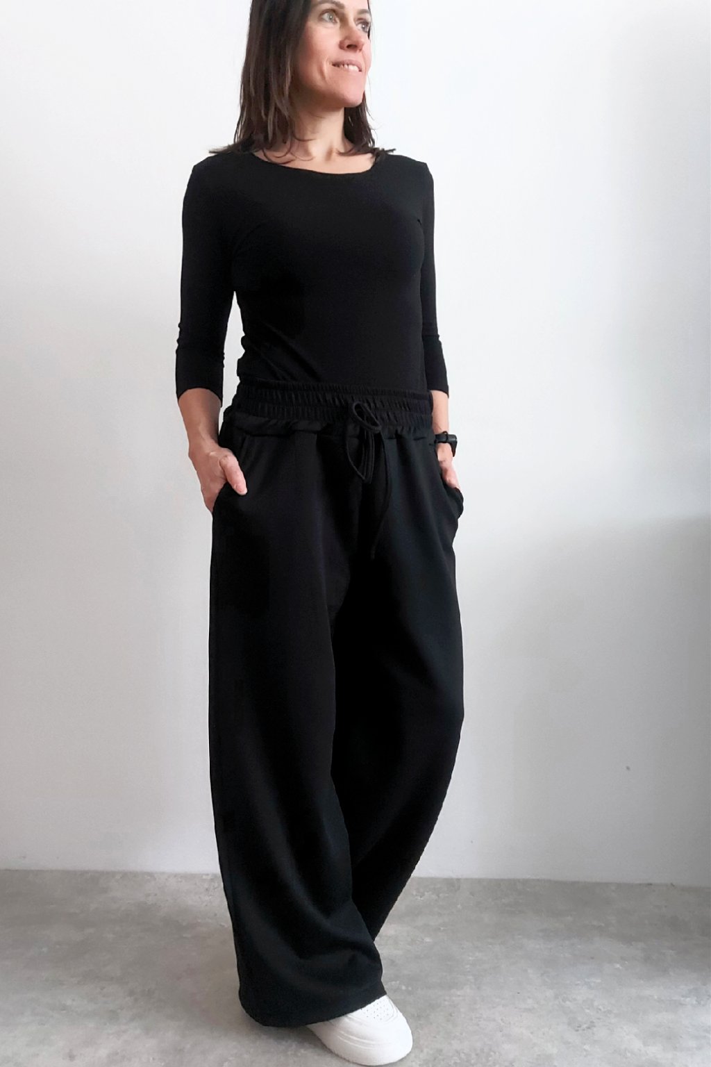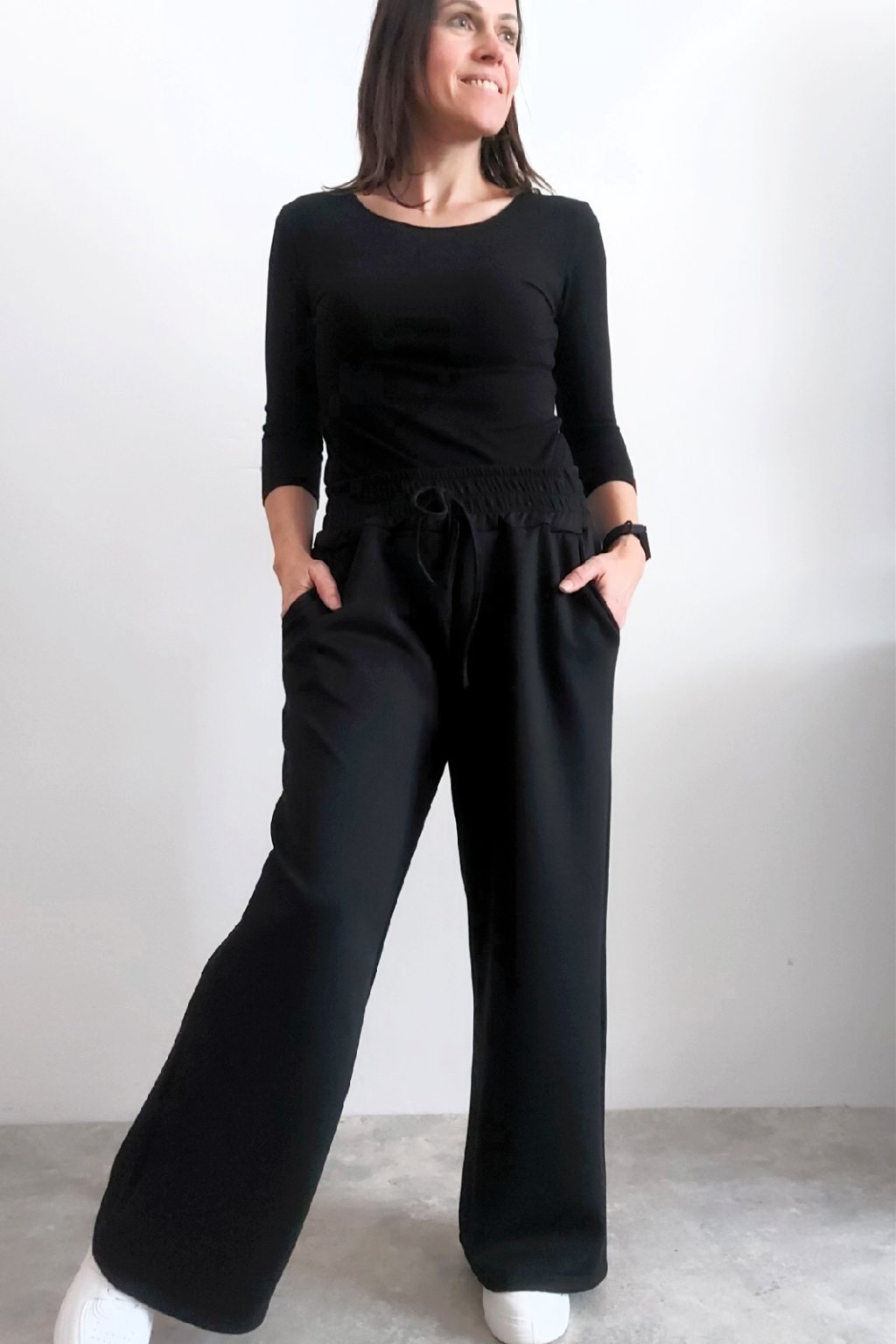 Skvělé kalhoty s širokými nohavicemi. V pase guma a šňůrka, ta je jen na ozdobu - není funkční a nelze s ní stáhnout obvod. Přední kapsy, vzadu bez kapes. Vhodné i pro větší velikosti. Materiál máslový - jemný, hebký, silnější, drží tvar, top kvalita. Foceno na vel. XS, výška 156cm i na vel. 2XL/3XL (pas 110cm, boky 120cm), výška 165cm.