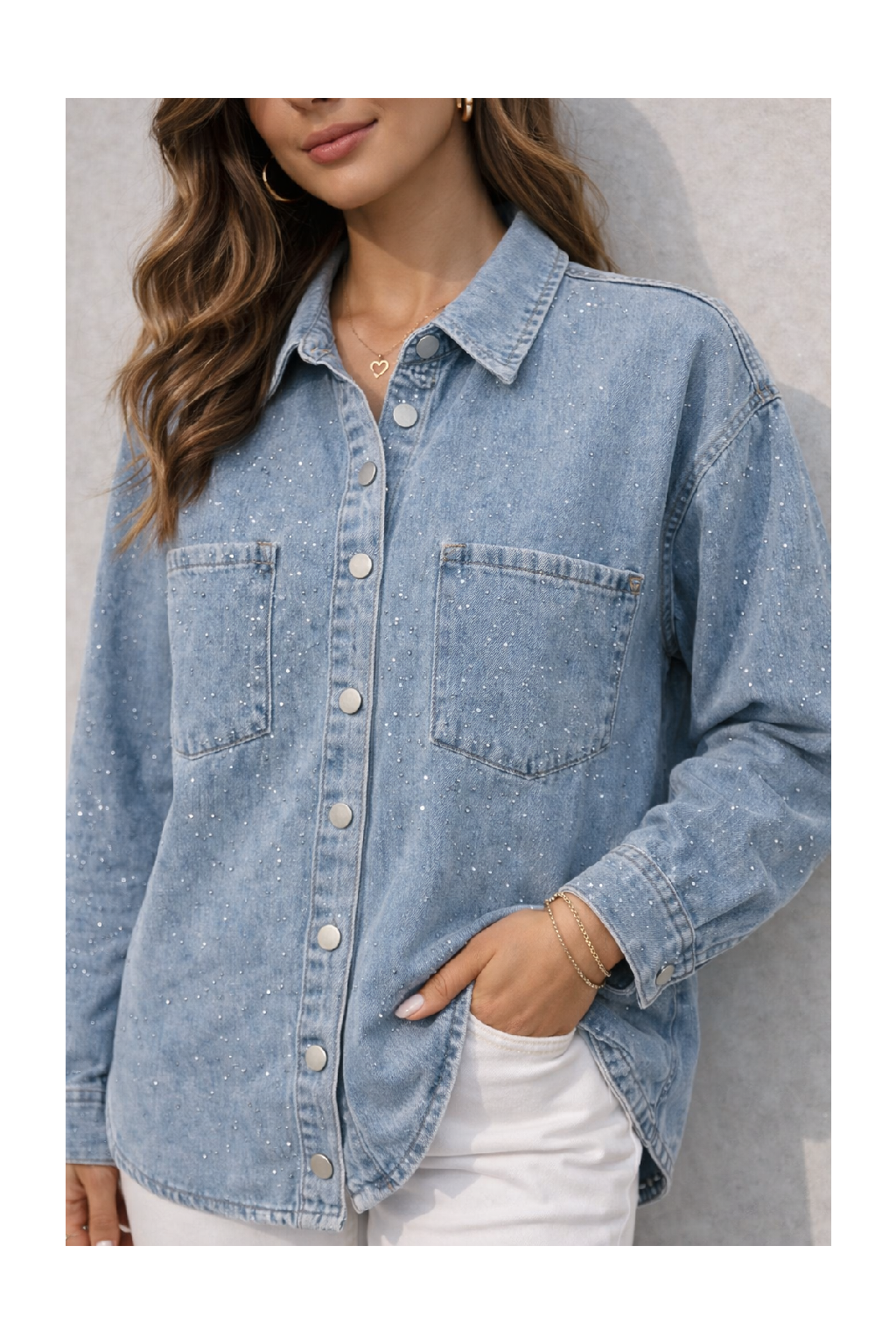 Džínová košile/bunda zdobená kamínky. Značka Re-Dress. Zapínání na knoflíky, rukávy dlouhé. Kamínky jsou na přední části a na rukávech vpředu i vzadu. Silnější, pevnější riflovina a možno tedy nosit i jako bundu. Kvalitní materiál, ale méně pružný. Barva světle modrá šisovaná. Sedí i na vel. 2XL (prsa 116cm, boky 121cm).