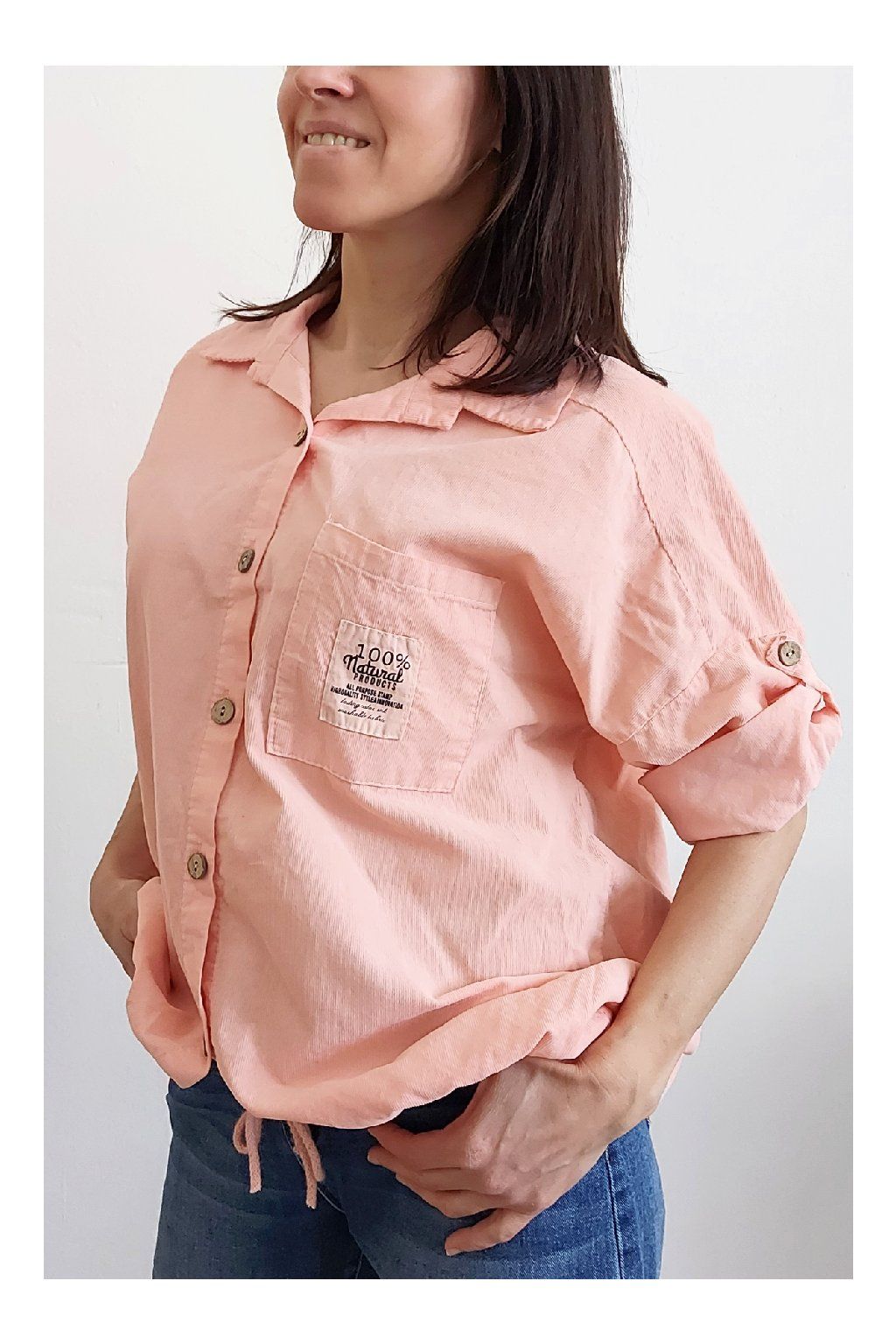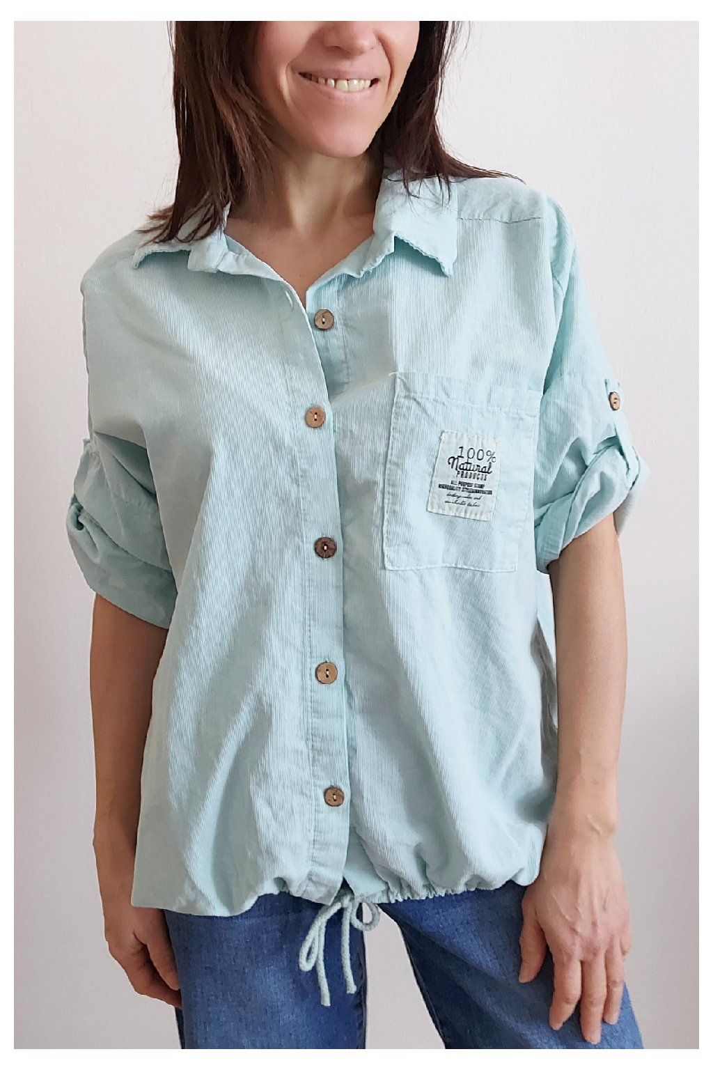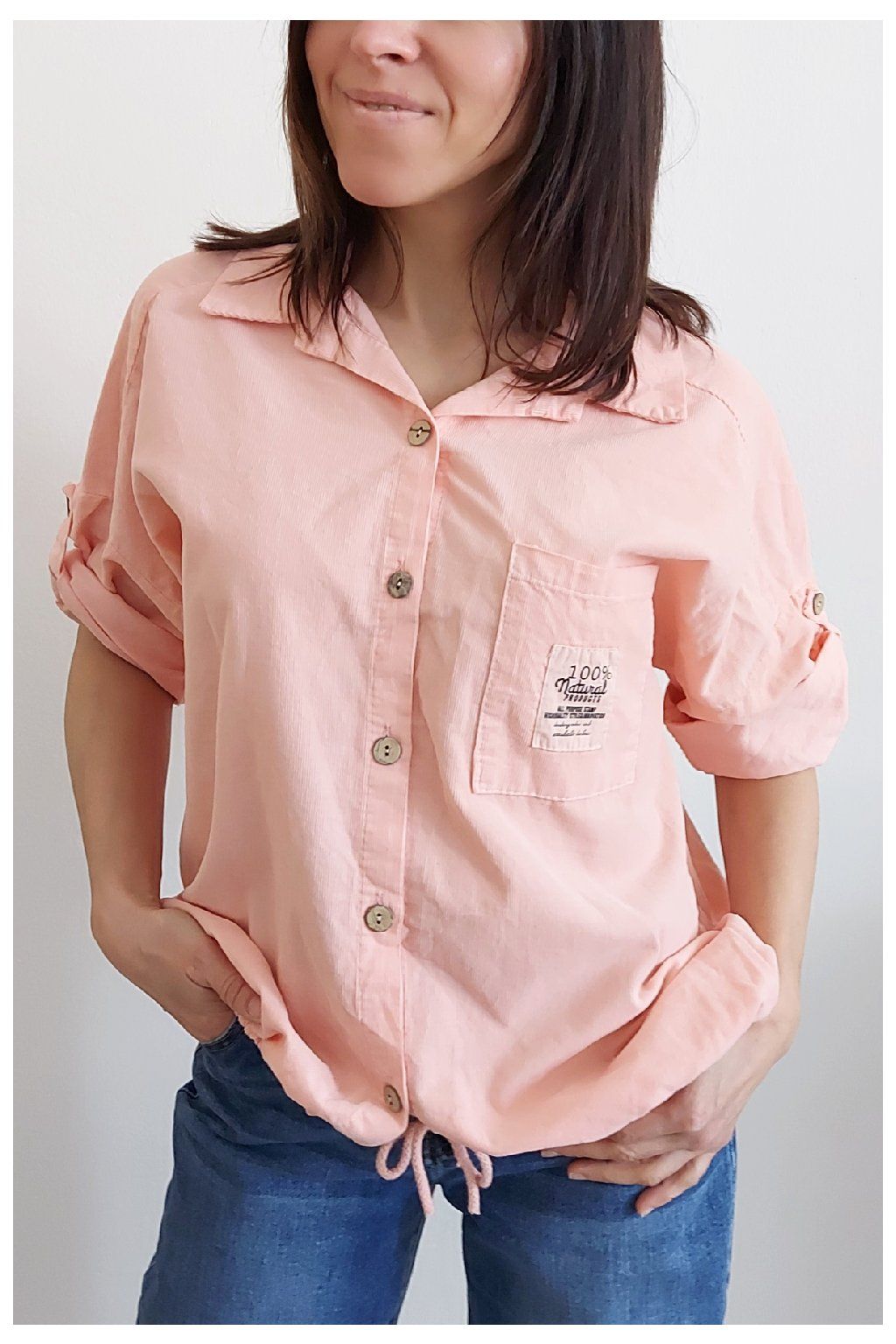 Parádní manšestrová košile/halenka. Zapínání na knoflíčky, ve spodní části lze obvod stáhnout šňůrkou. Na prsou kapsička, na ni je ozdobná nášivka s nápisy. Rukávy jsou k lokti, na nich jsou knoflíky a lze tedy nosit i s ohrnutými. Měkký, jemný manšestr prémiové kvality. Foceno na vel. XS, výška 156cm.
