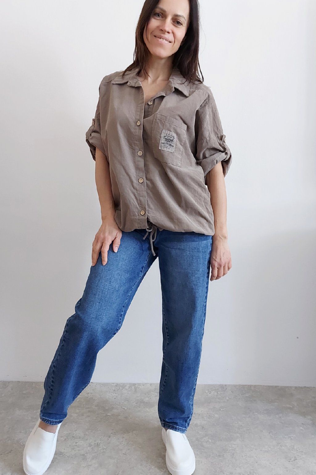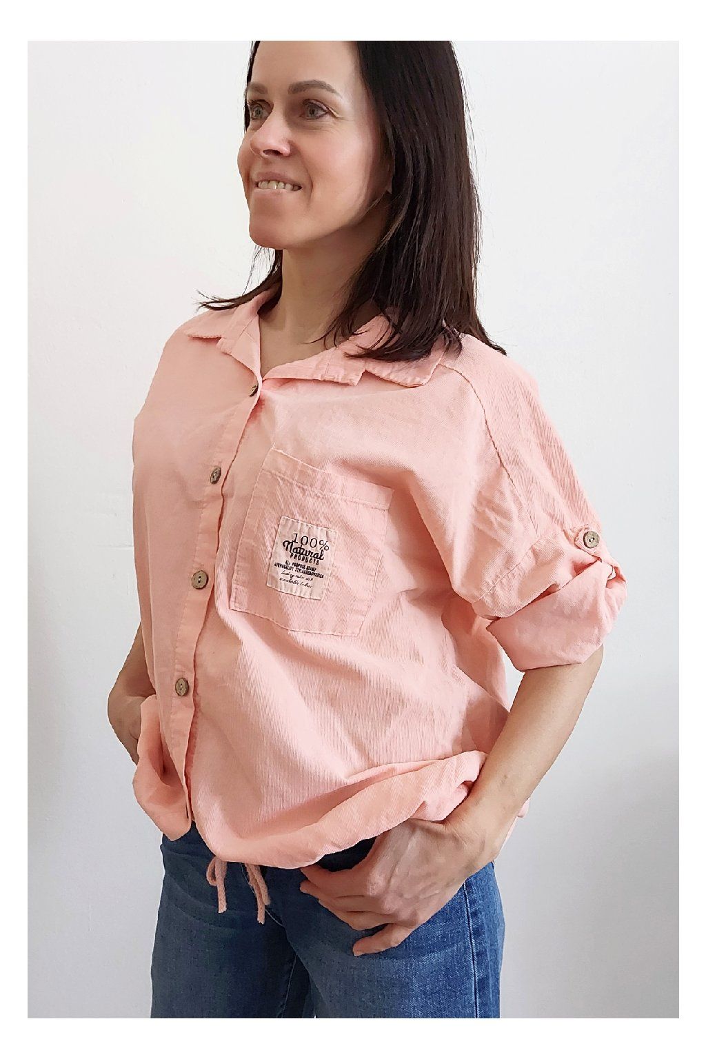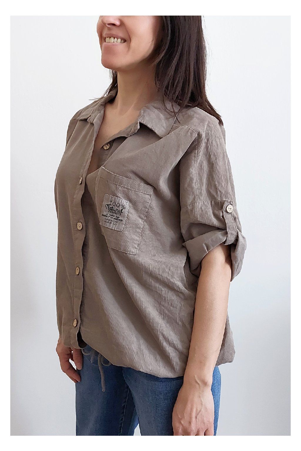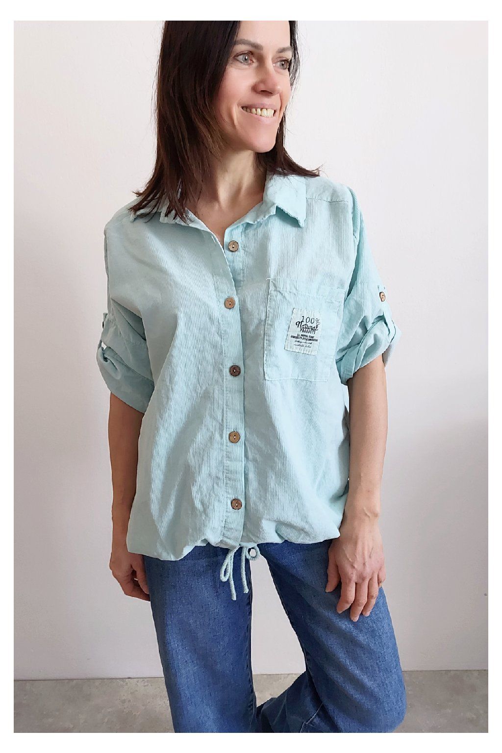 Parádní manšestrová košile/halenka. Zapínání na knoflíčky, ve spodní části lze obvod stáhnout šňůrkou. Na prsou kapsička, na ni je ozdobná nášivka s nápisy. Rukávy jsou k lokti, na nich jsou knoflíky a lze tedy nosit i s ohrnutými. Měkký, jemný manšestr prémiové kvality. Foceno na vel. XS, výška 156cm.