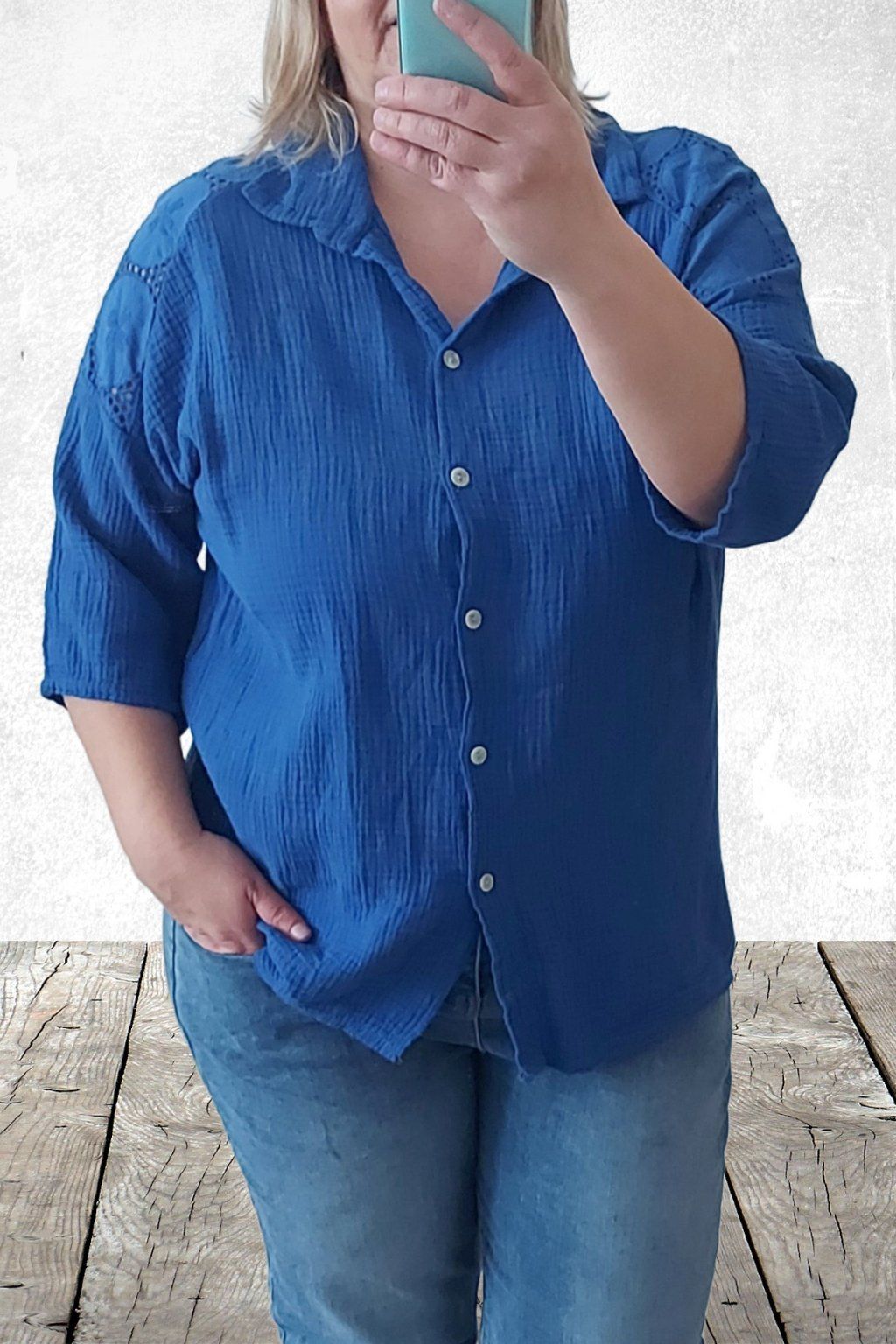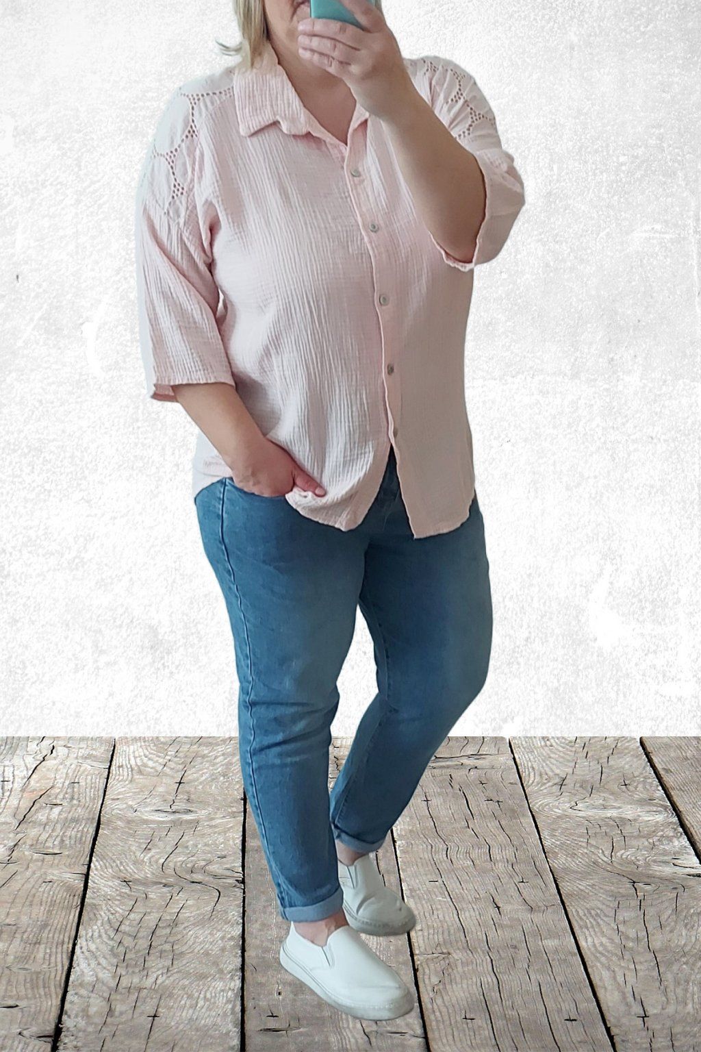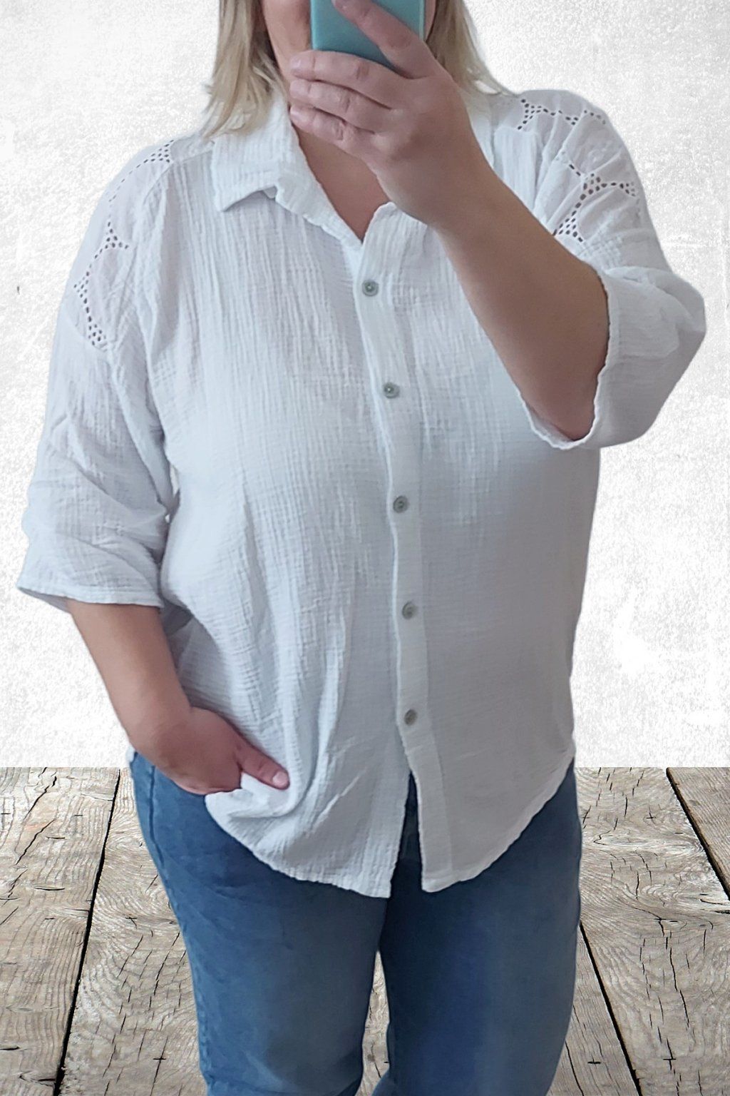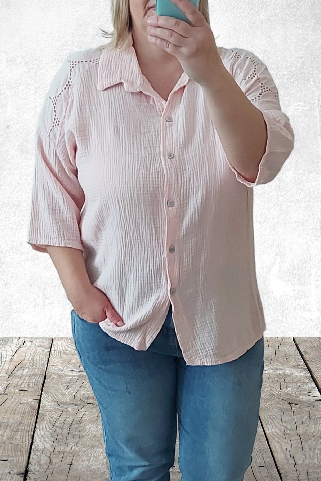 Mušelínová košilová s kratším rukávem. Zapínání na knoflíky po celé délce. Na ramenou je efektní prošívaní, které je místy děrované. Zadní strana maličko delší. Materiál dokonalý - extra prodyšný, příjemný na tělo, prémiová kvalita. Vhodná i pro větší velikosti. Foceno i na vel. 2XL (prsa 116cm, boky 121cm), výška 165cm.