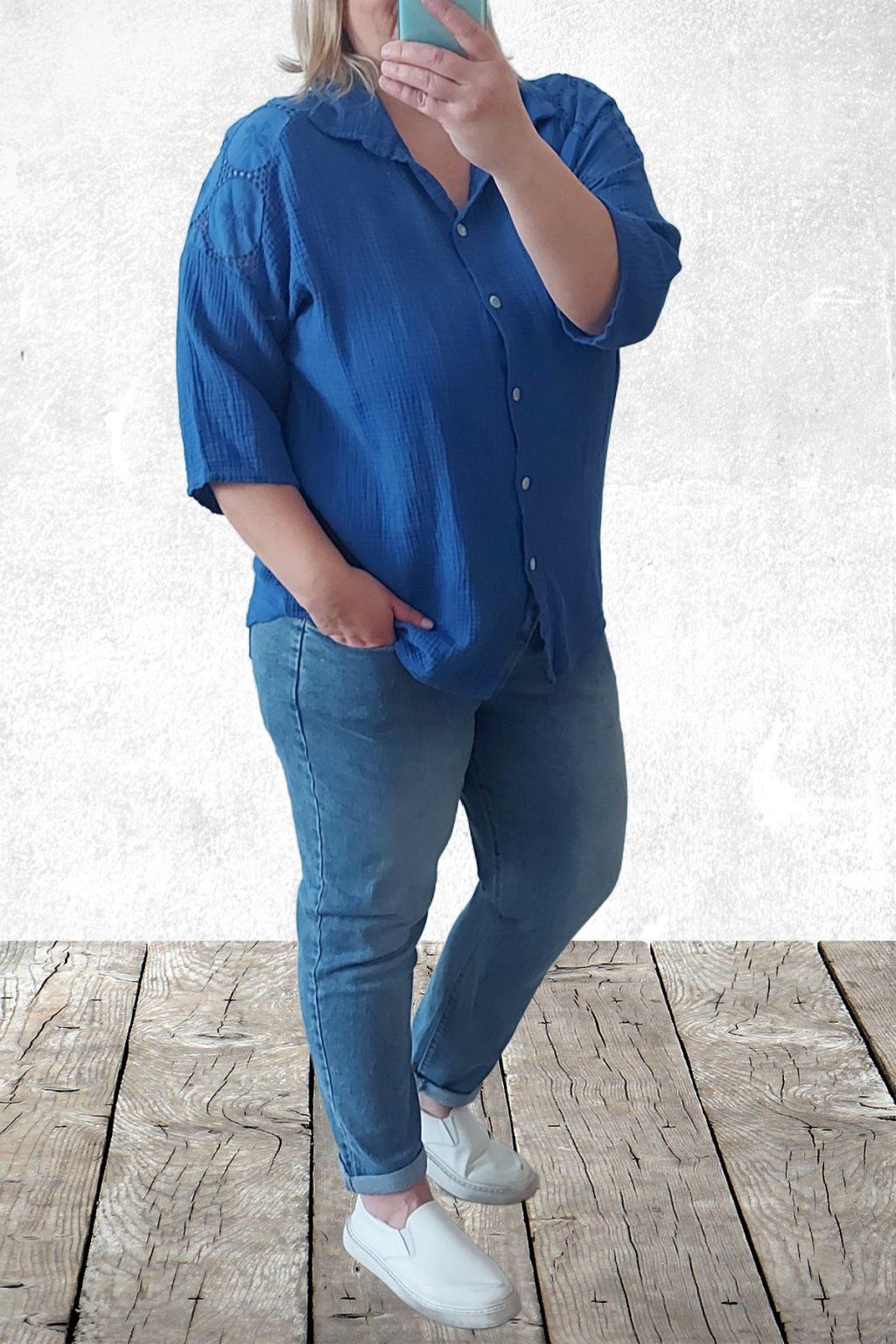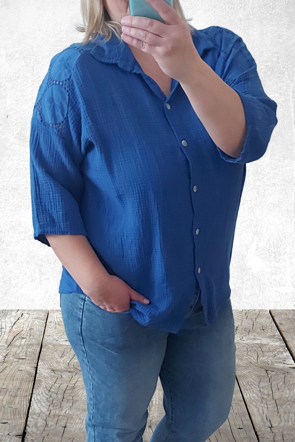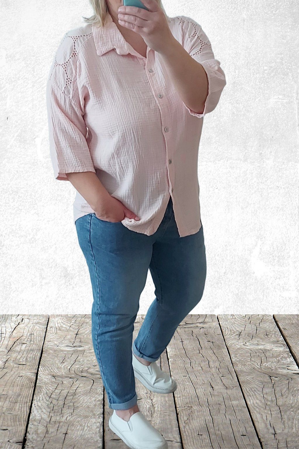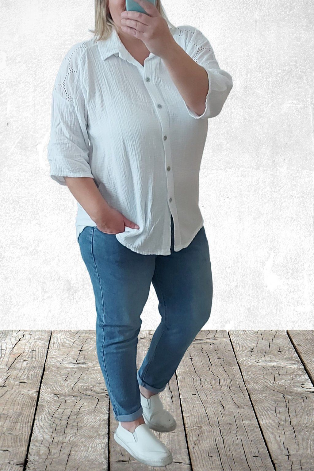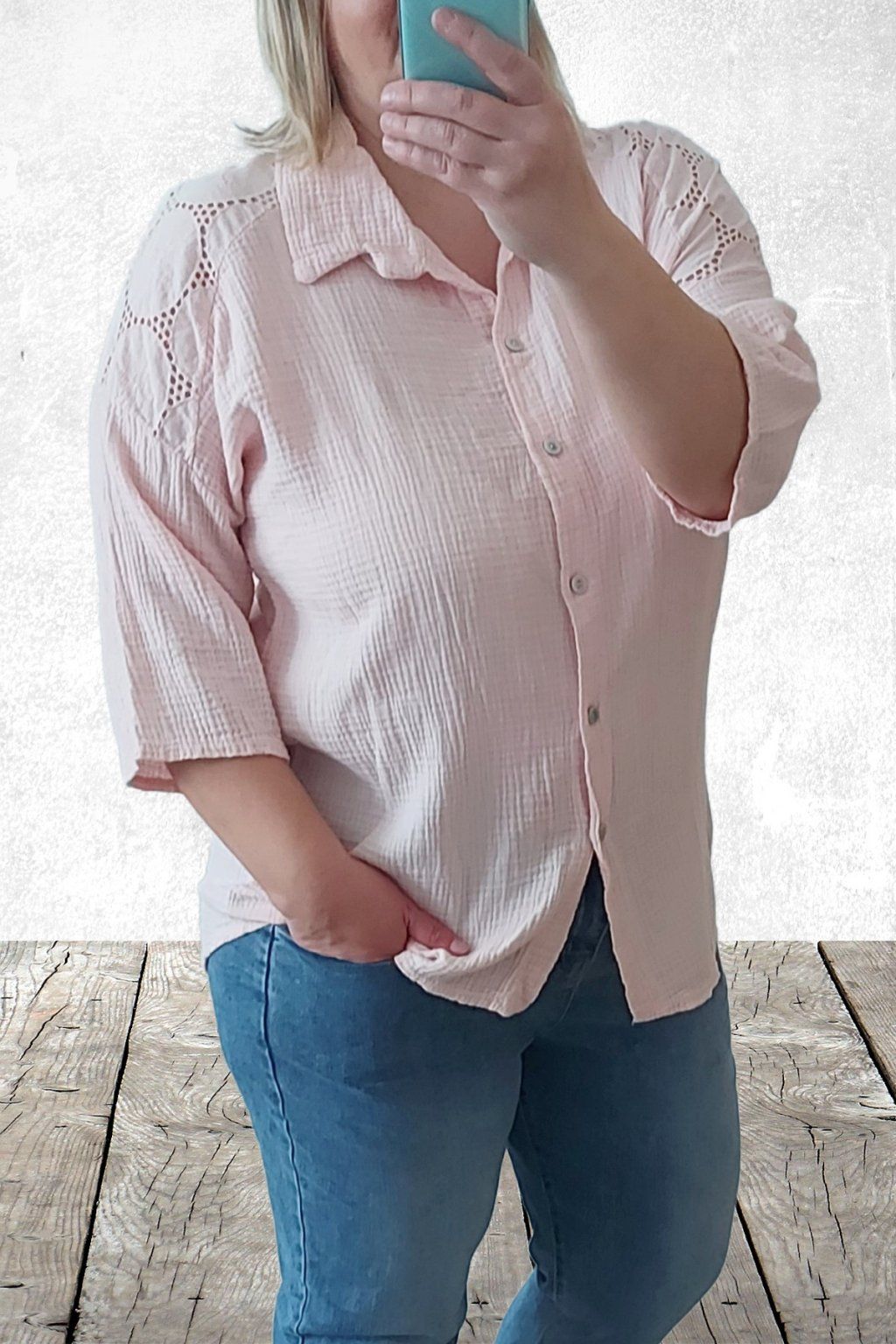 Mušelínová košilová s kratším rukávem. Zapínání na knoflíky po celé délce. Na ramenou je efektní prošívaní, které je místy děrované. Zadní strana maličko delší. Materiál dokonalý - extra prodyšný, příjemný na tělo, prémiová kvalita. Vhodná i pro větší velikosti. Foceno i na vel. 2XL (prsa 116cm, boky 121cm), výška 165cm.