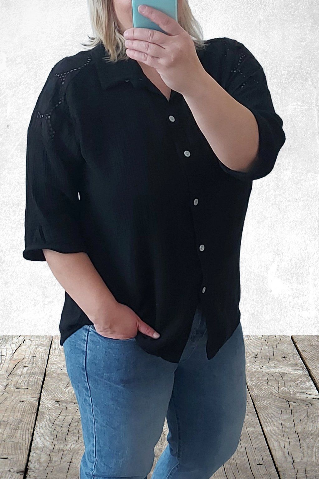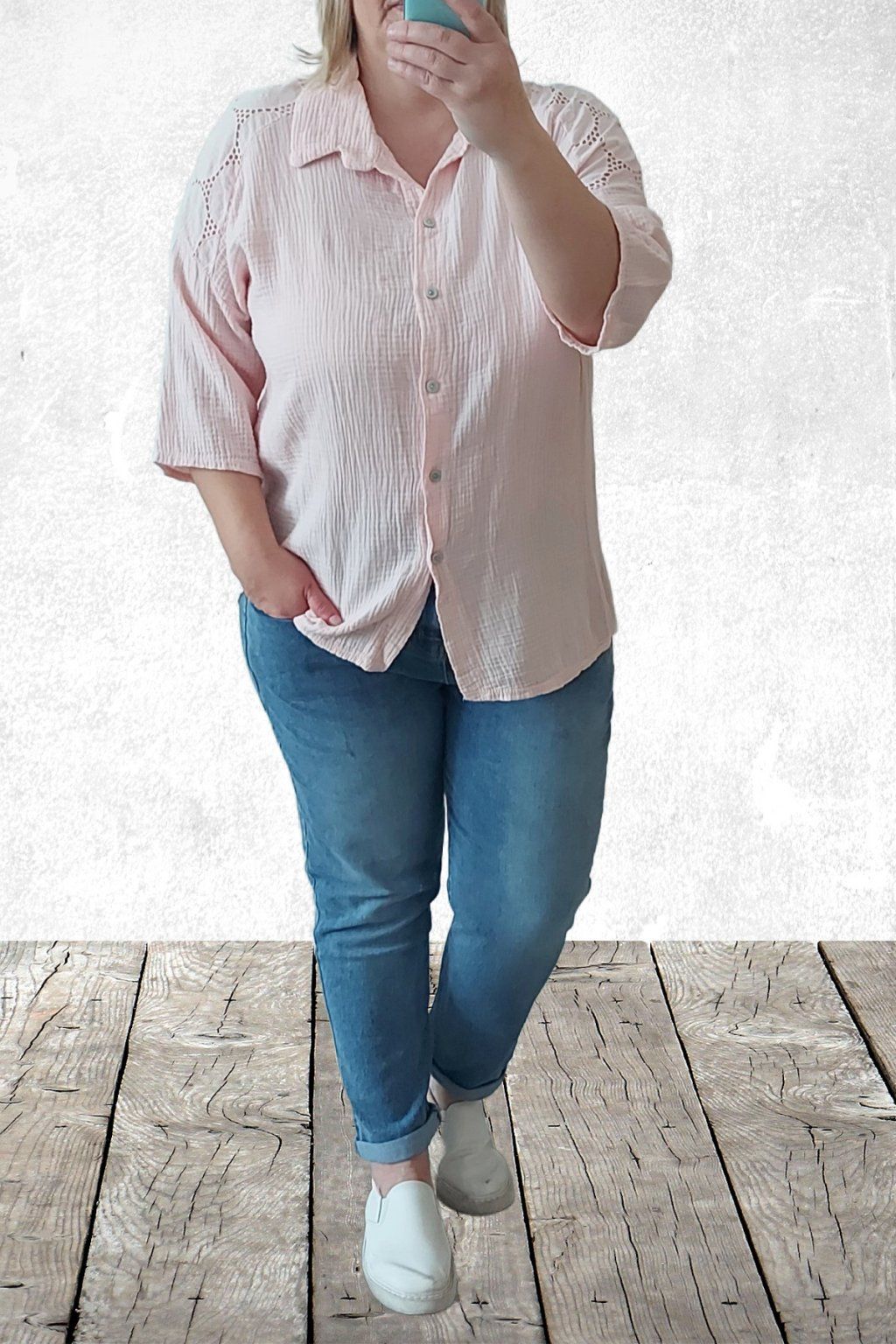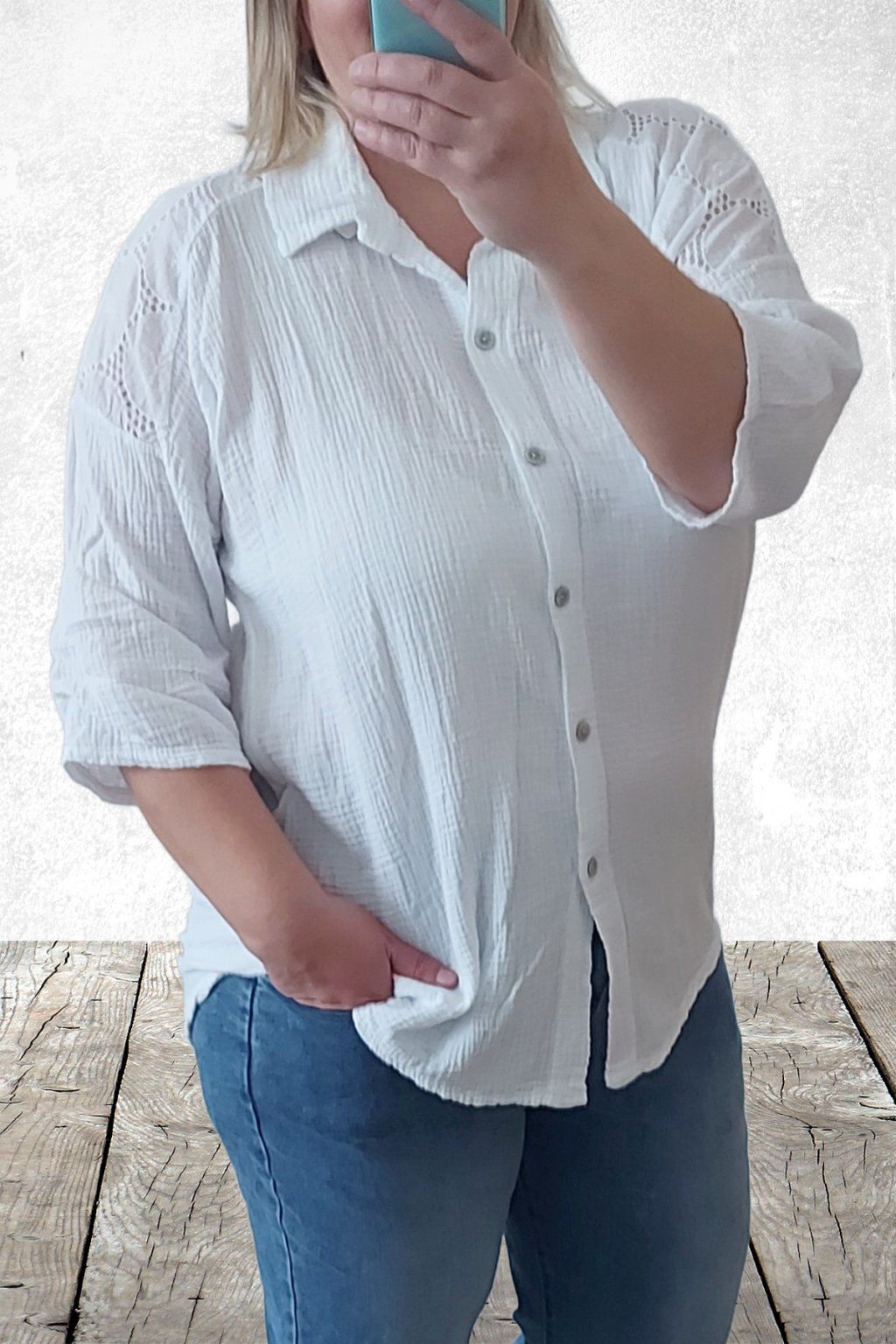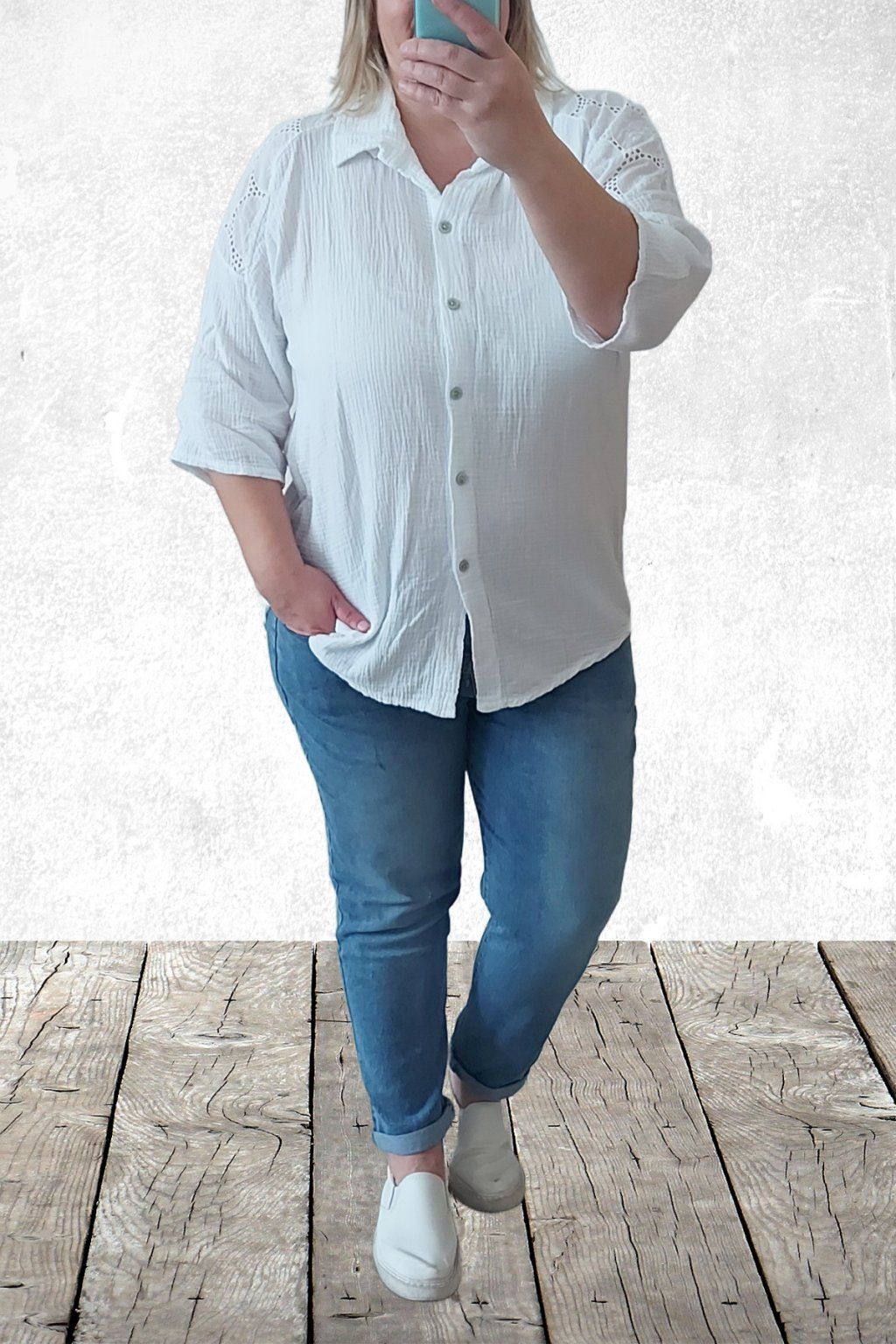 Mušelínová košilová s kratším rukávem. Zapínání na knoflíky po celé délce. Na ramenou je efektní prošívaní, které je místy děrované. Zadní strana maličko delší. Materiál dokonalý - extra prodyšný, příjemný na tělo, prémiová kvalita. Vhodná i pro větší velikosti. Foceno i na vel. 2XL (prsa 116cm, boky 121cm), výška 165cm.