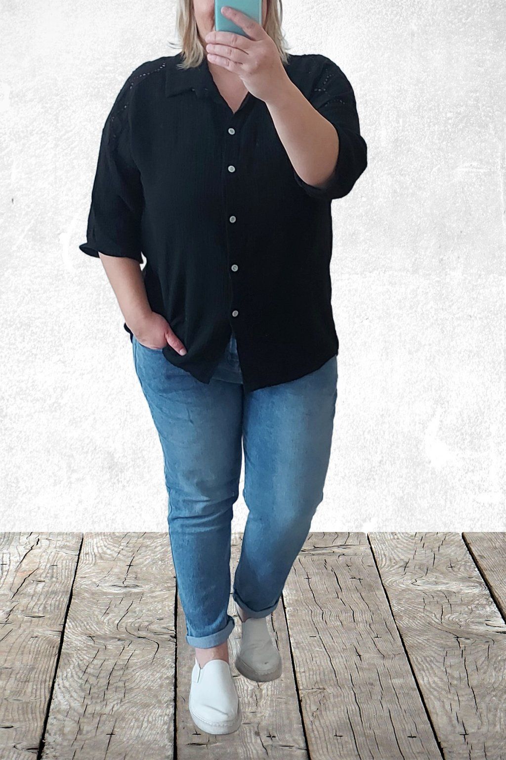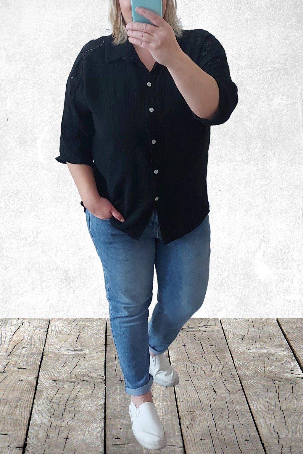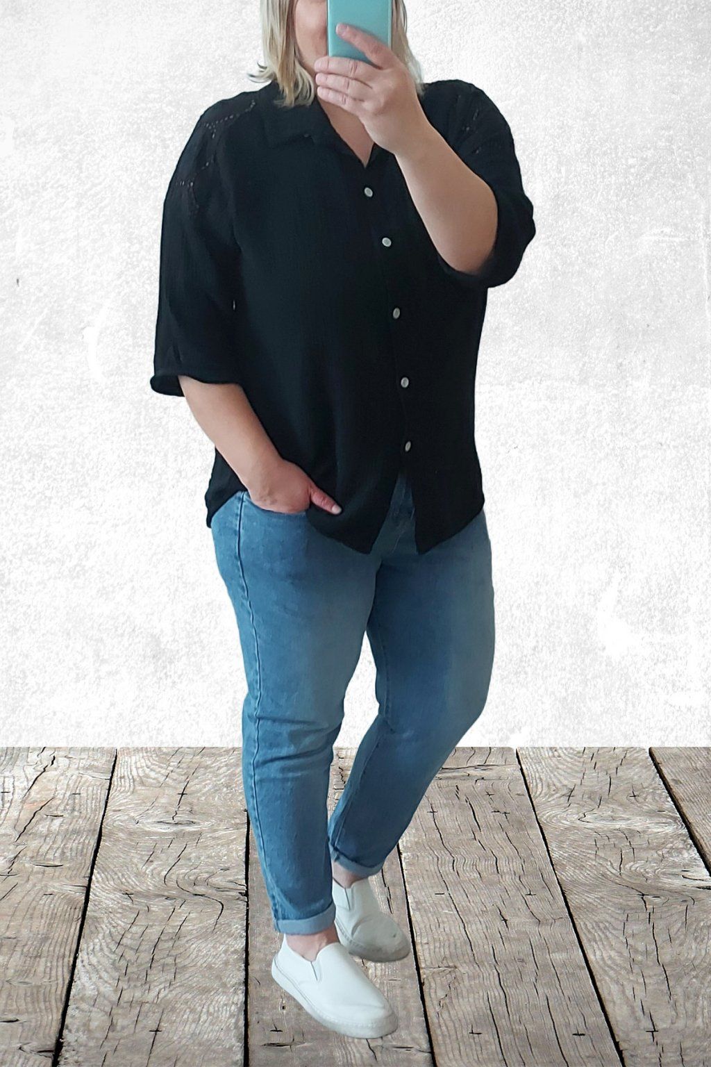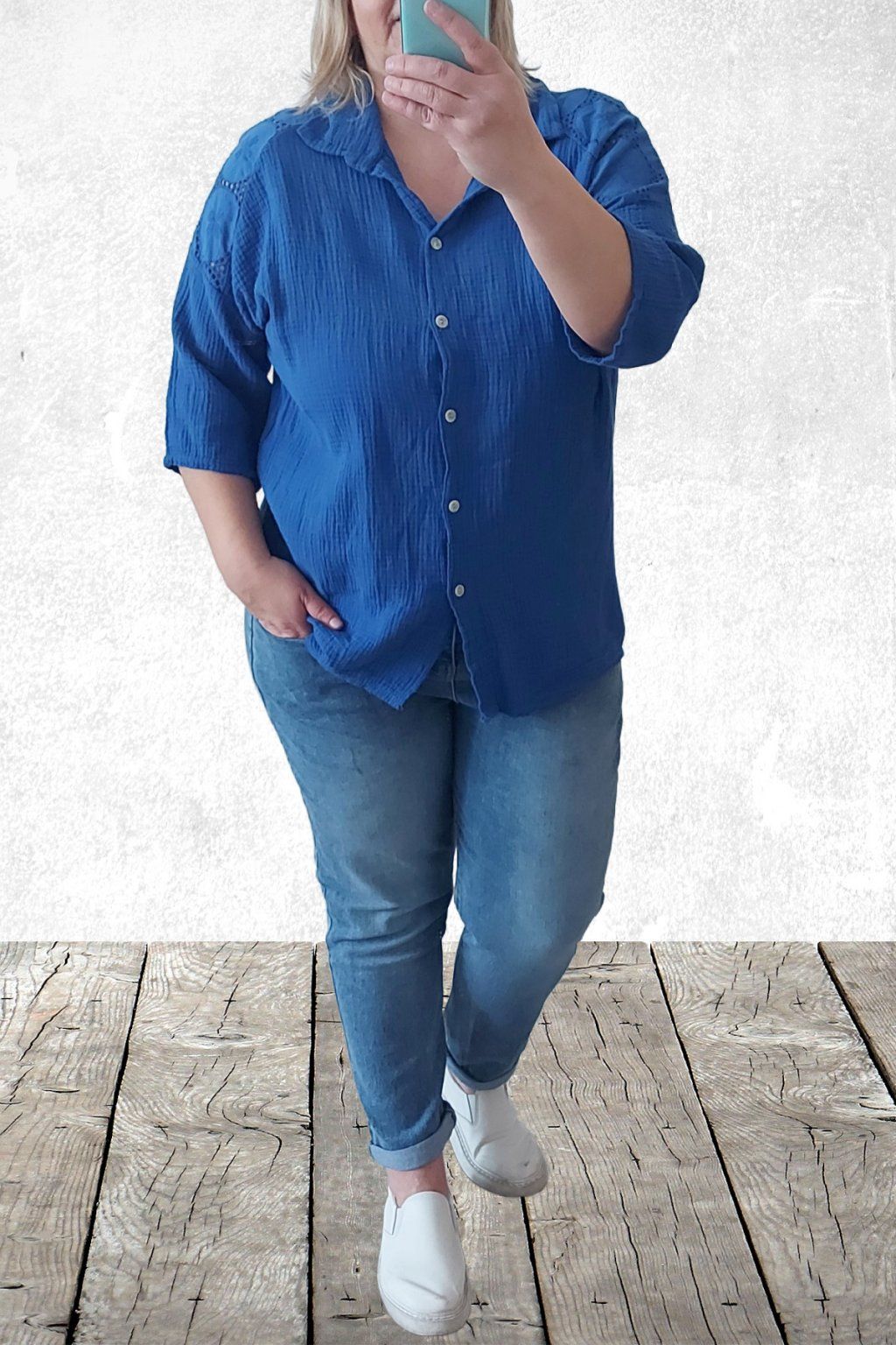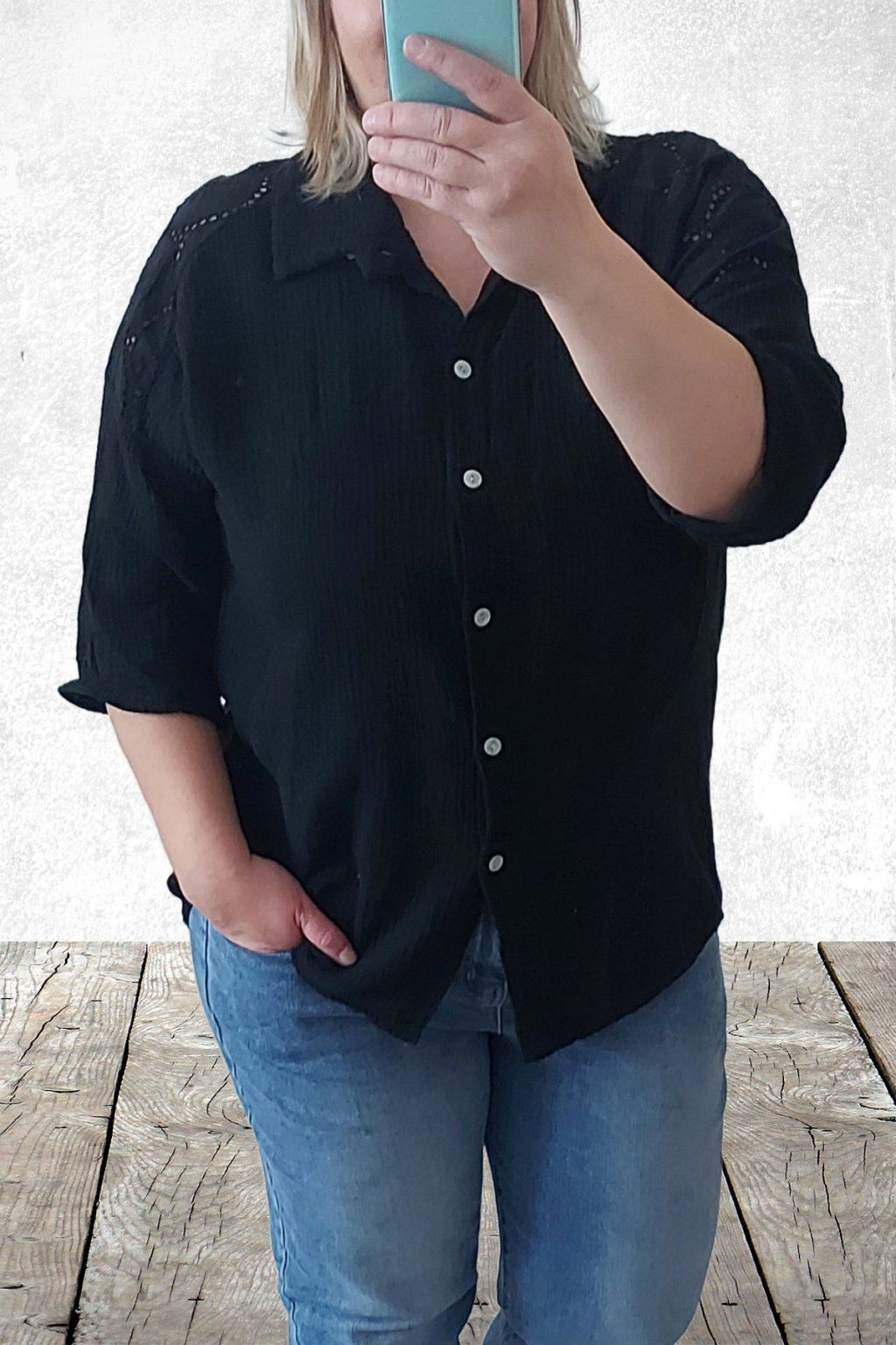 Mušelínová košilová s kratším rukávem. Zapínání na knoflíky po celé délce. Na ramenou je efektní prošívaní, které je místy děrované. Zadní strana maličko delší. Materiál dokonalý - extra prodyšný, příjemný na tělo, prémiová kvalita. Vhodná i pro větší velikosti. Foceno i na vel. 2XL (prsa 116cm, boky 121cm), výška 165cm.