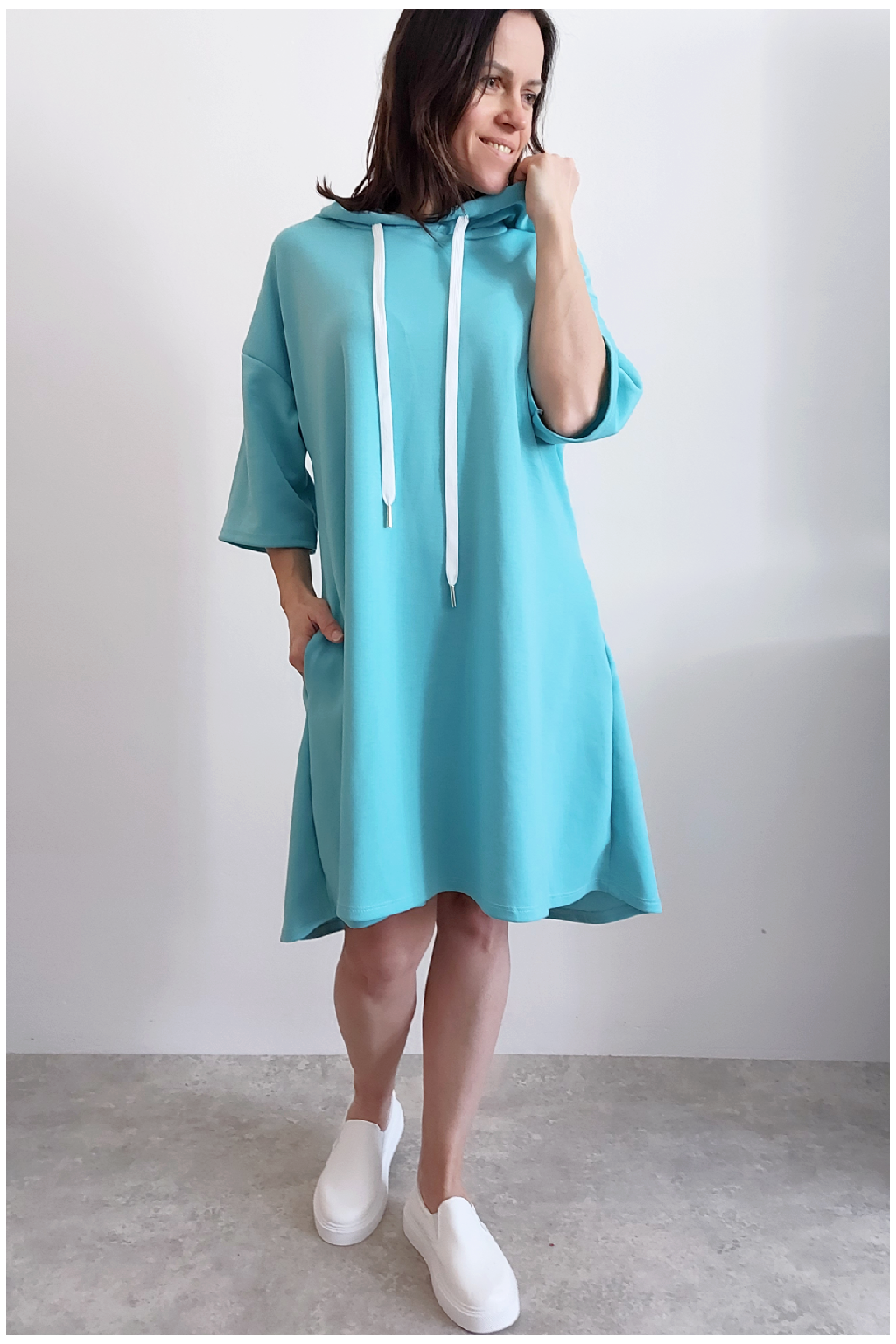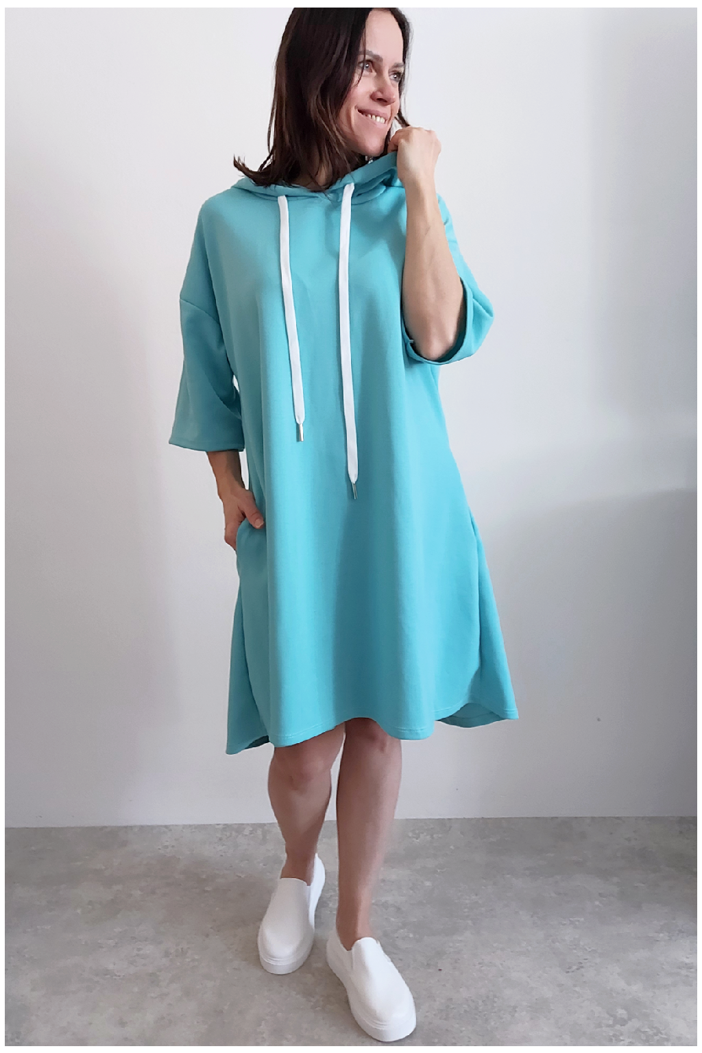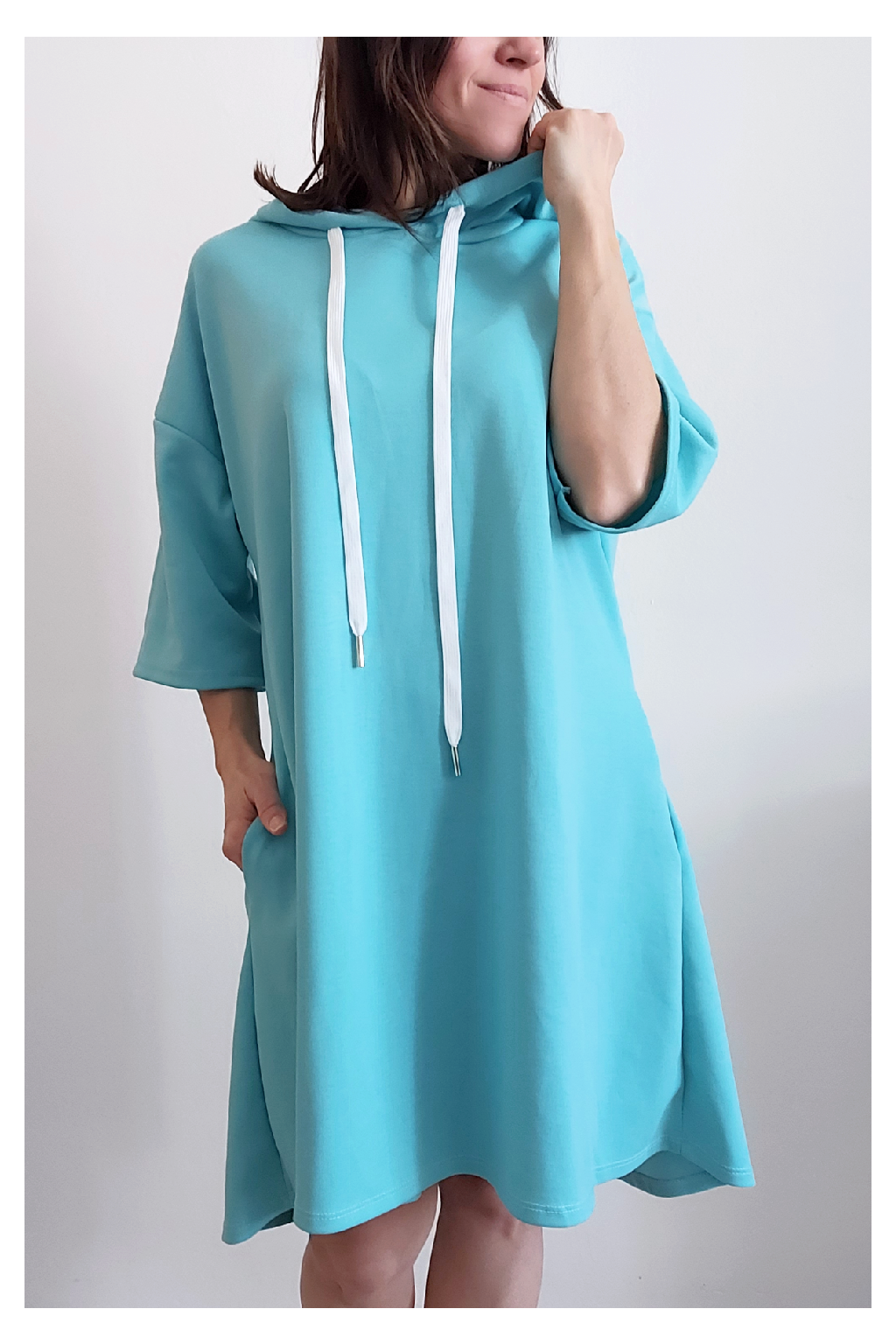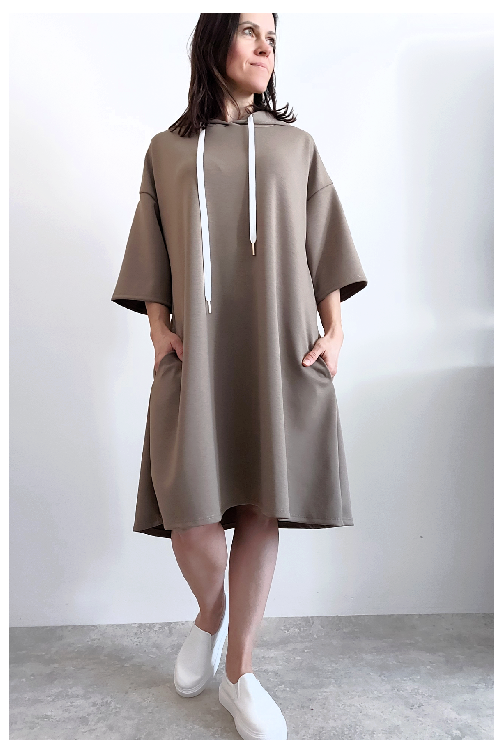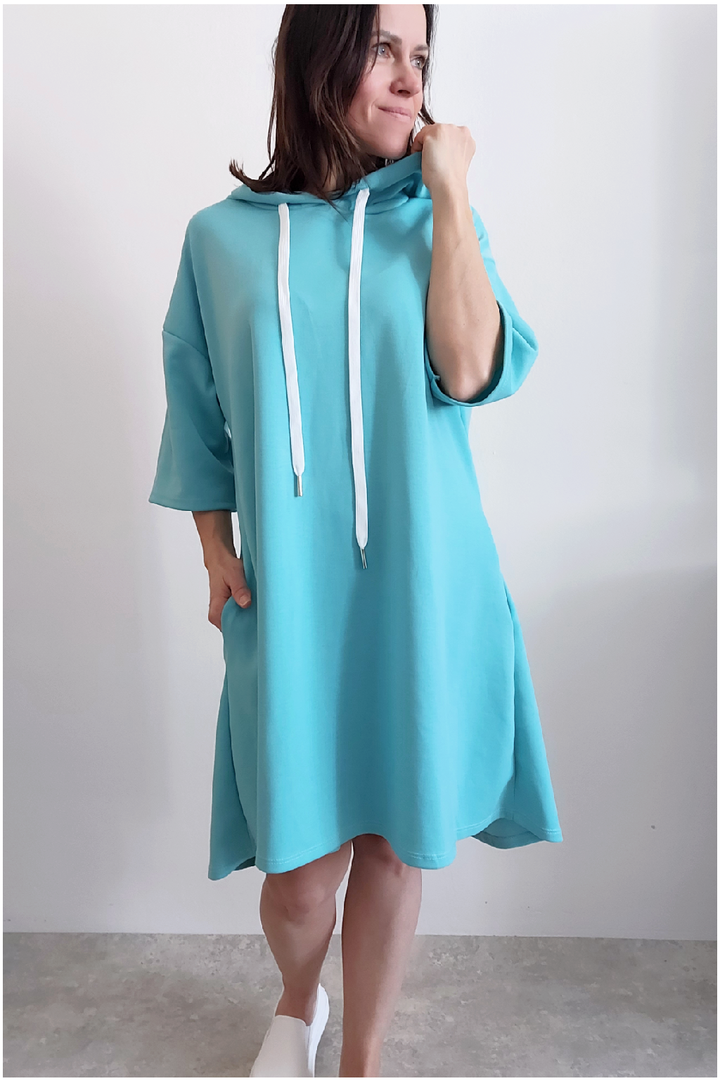 Sportovní šaty áčkového střihu s kapucí, které vypadají skvěle i jako delší tunika třeba k džínům. Rukávy jsou kratší, k loktům. Mají boční kapsy. Zadní strana maličko delší. Materiál máslový - jemný, hebký, klouzavý, splývavý, mírně mačkaný a super pružný. Vhodné i pro větší velikost. Foceno na vel. XS, výška 156cm i na vel. 2XL (prsa 116cm, boky 121cm), výška 165cm.