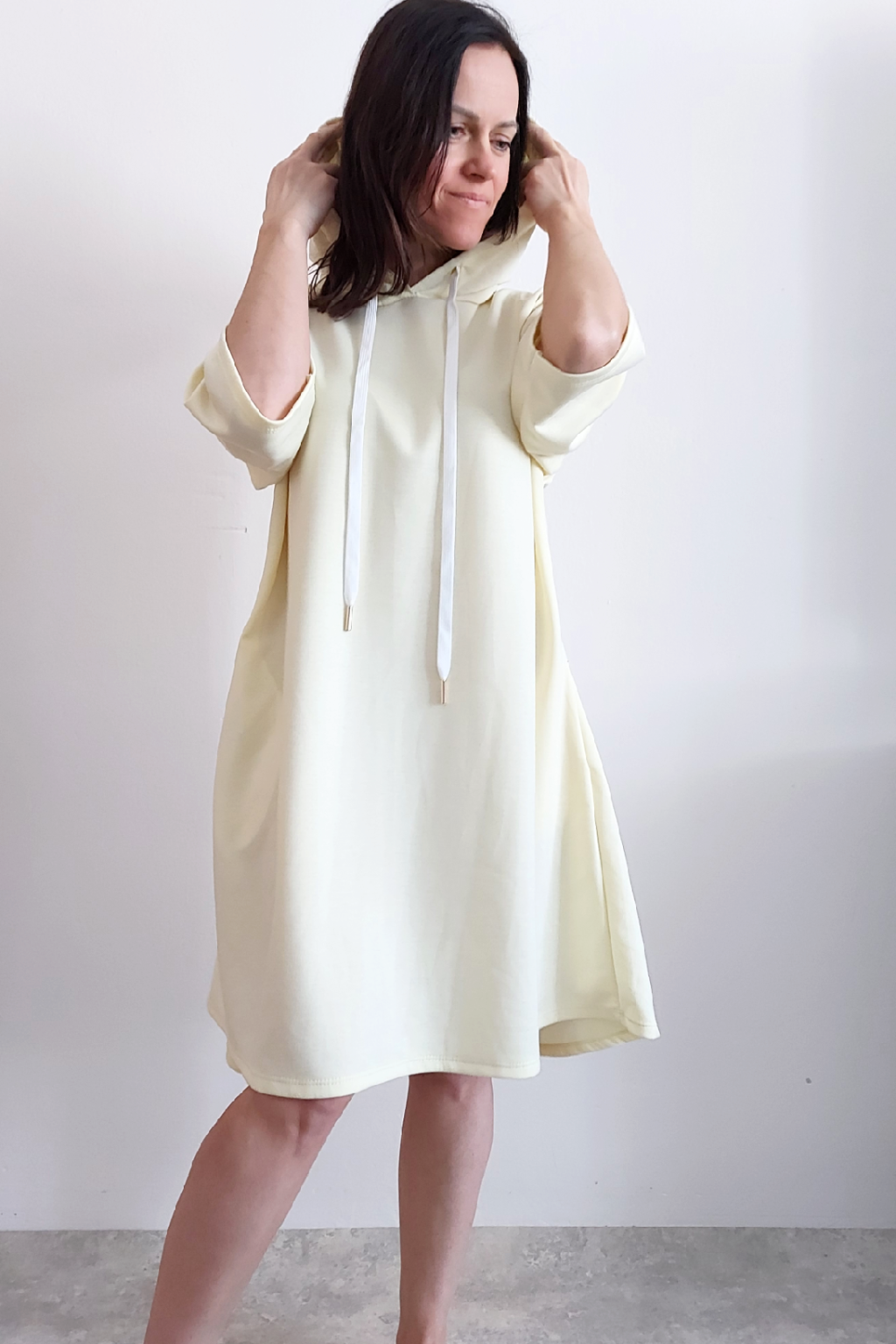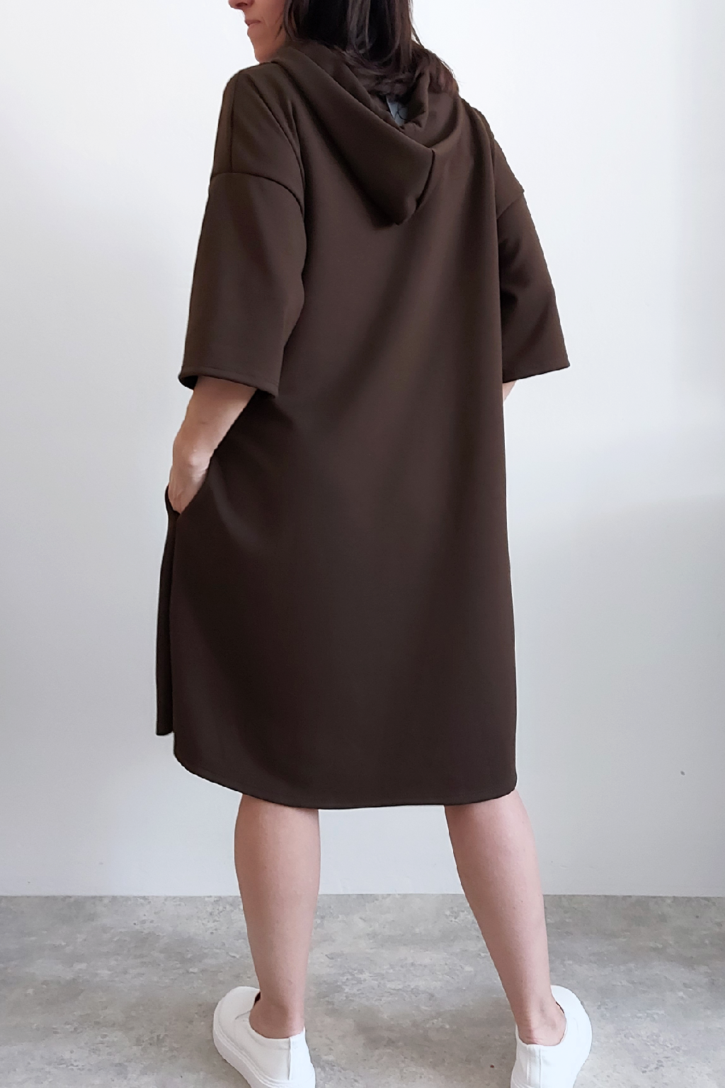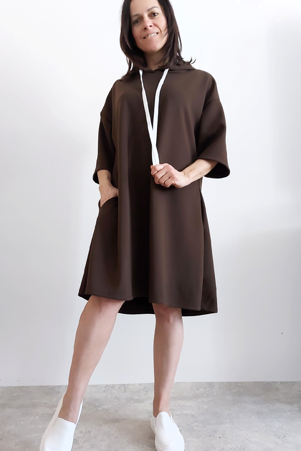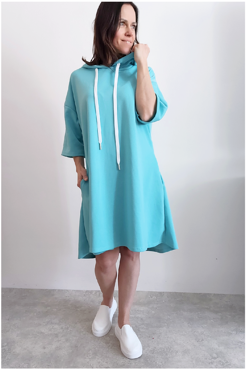 Sportovní šaty áčkového střihu s kapucí, které vypadají skvěle i jako delší tunika třeba k džínům. Rukávy jsou kratší, k loktům. Mají boční kapsy. Zadní strana maličko delší. Materiál máslový - jemný, hebký, klouzavý, splývavý, mírně mačkaný a super pružný. Vhodné i pro větší velikost. Foceno na vel. XS, výška 156cm i na vel. 2XL (prsa 116cm, boky 121cm), výška 165cm.