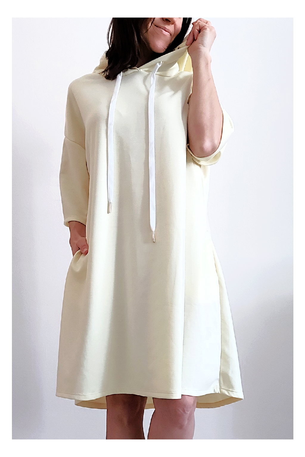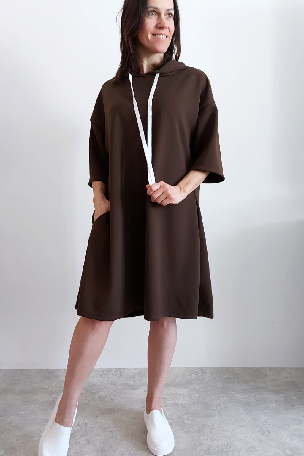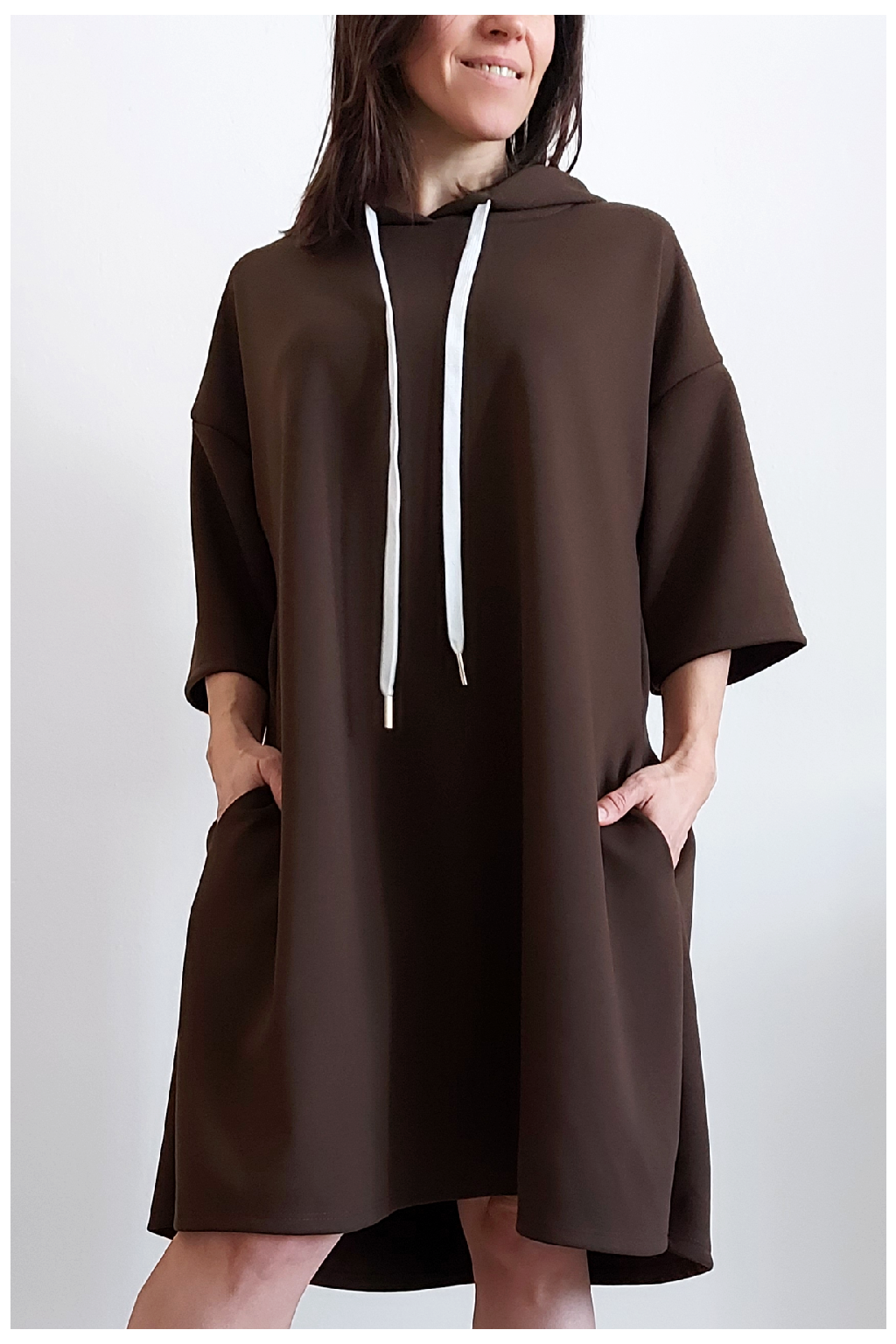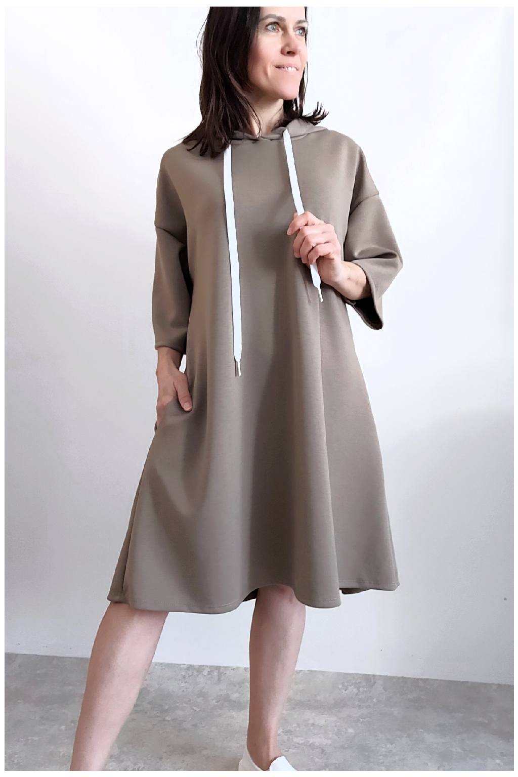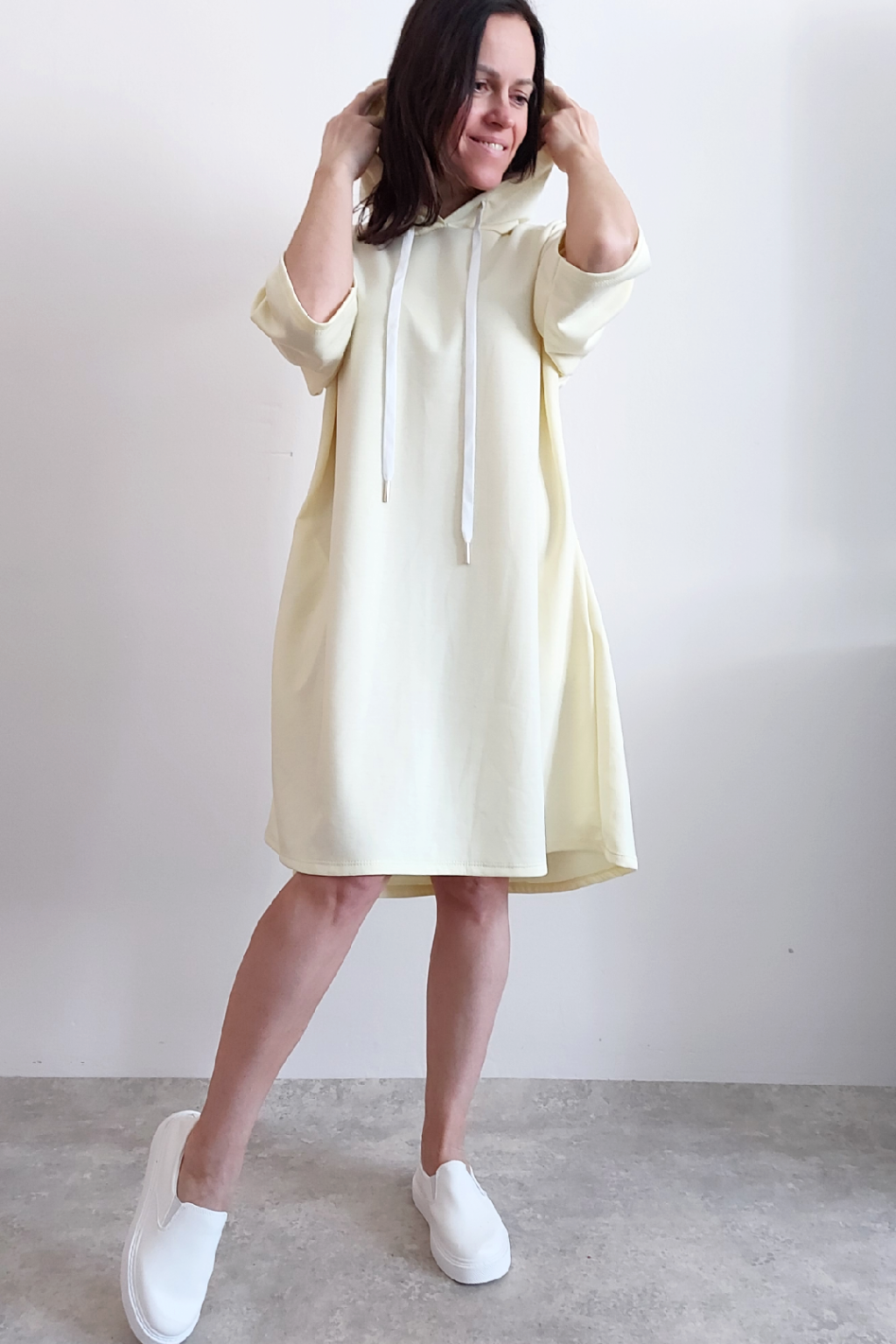 Sportovní šaty áčkového střihu s kapucí, které vypadají skvěle i jako delší tunika třeba k džínům. Rukávy jsou kratší, k loktům. Mají boční kapsy. Zadní strana maličko delší. Materiál máslový - jemný, hebký, klouzavý, splývavý, mírně mačkaný a super pružný. Vhodné i pro větší velikost. Foceno na vel. XS, výška 156cm i na vel. 2XL (prsa 116cm, boky 121cm), výška 165cm.