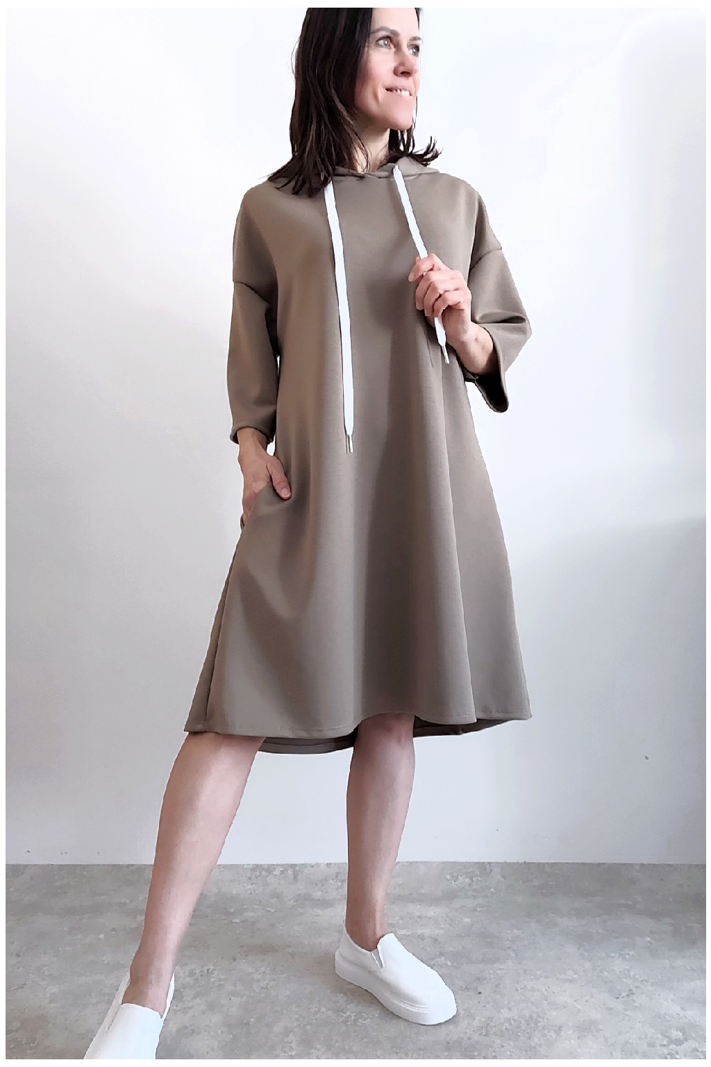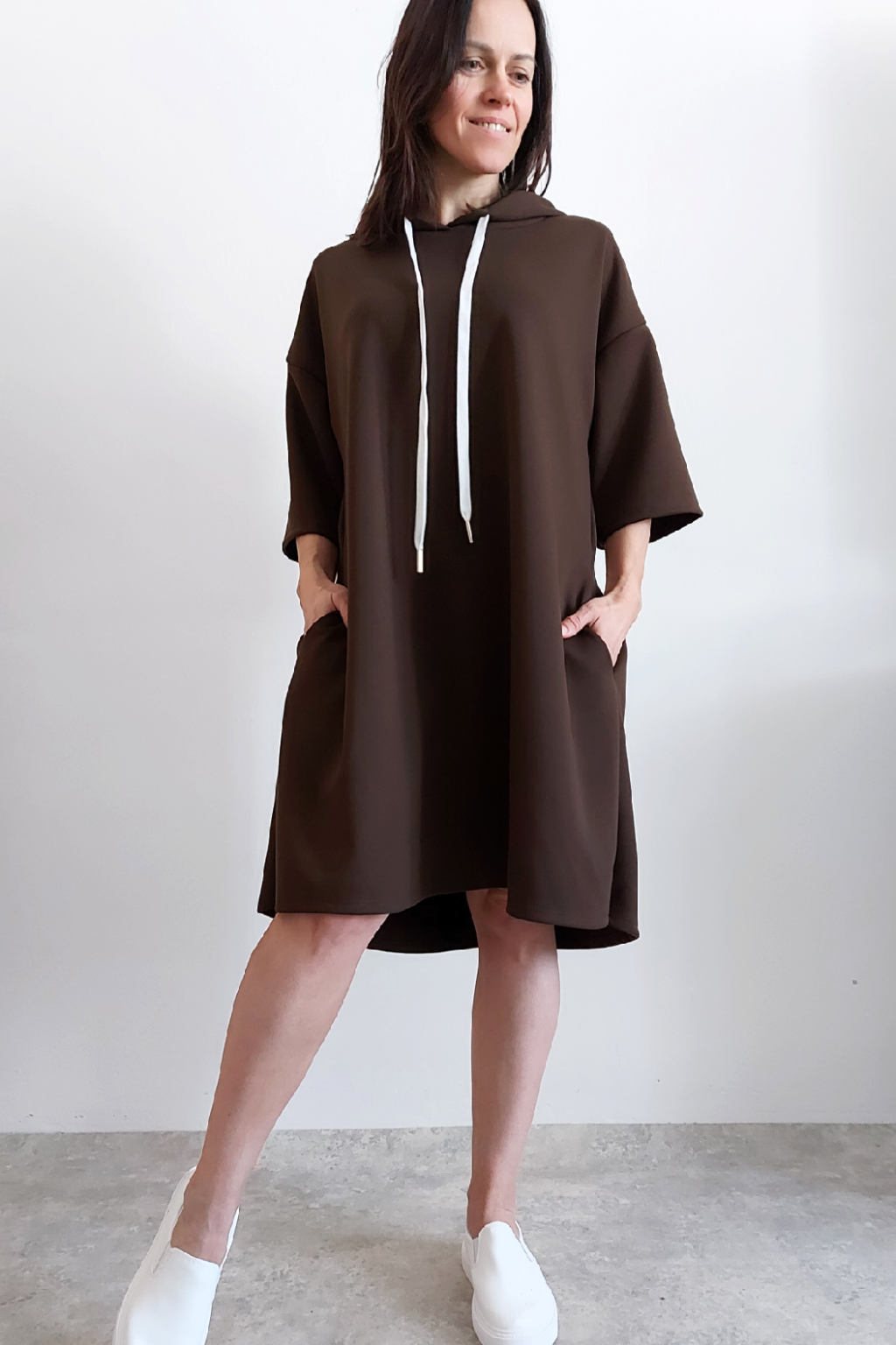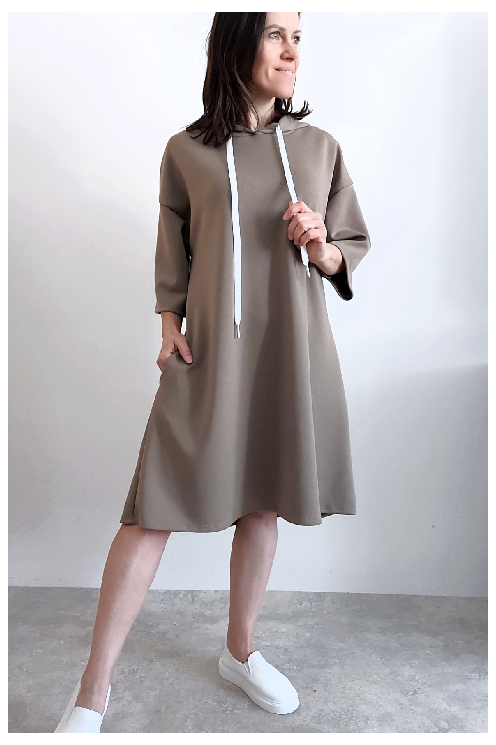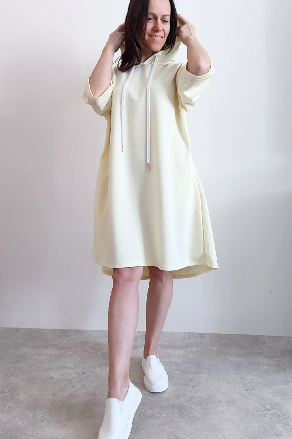 Sportovní šaty áčkového střihu s kapucí, které vypadají skvěle i jako delší tunika třeba k džínům. Rukávy jsou kratší, k loktům. Mají boční kapsy. Zadní strana maličko delší. Materiál máslový - jemný, hebký, klouzavý, splývavý, mírně mačkaný a super pružný. Vhodné i pro větší velikost. Foceno na vel. XS, výška 156cm i na vel. 2XL (prsa 116cm, boky 121cm), výška 165cm.
