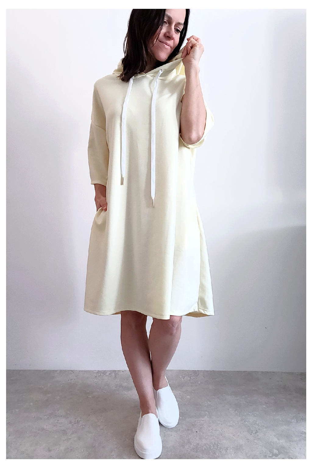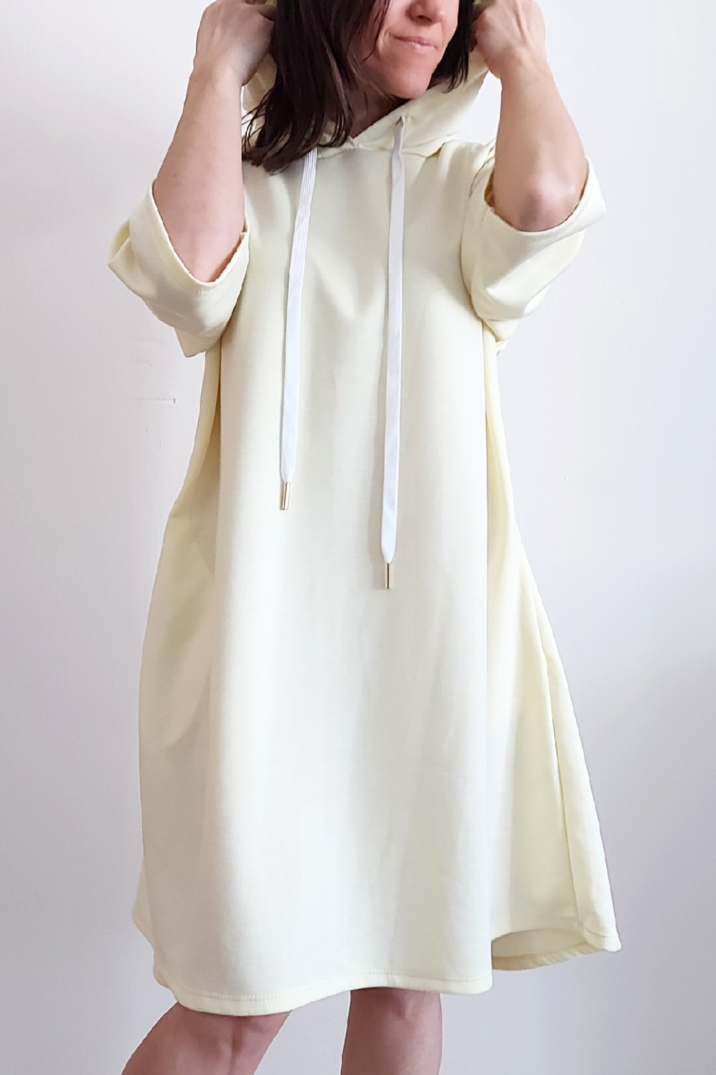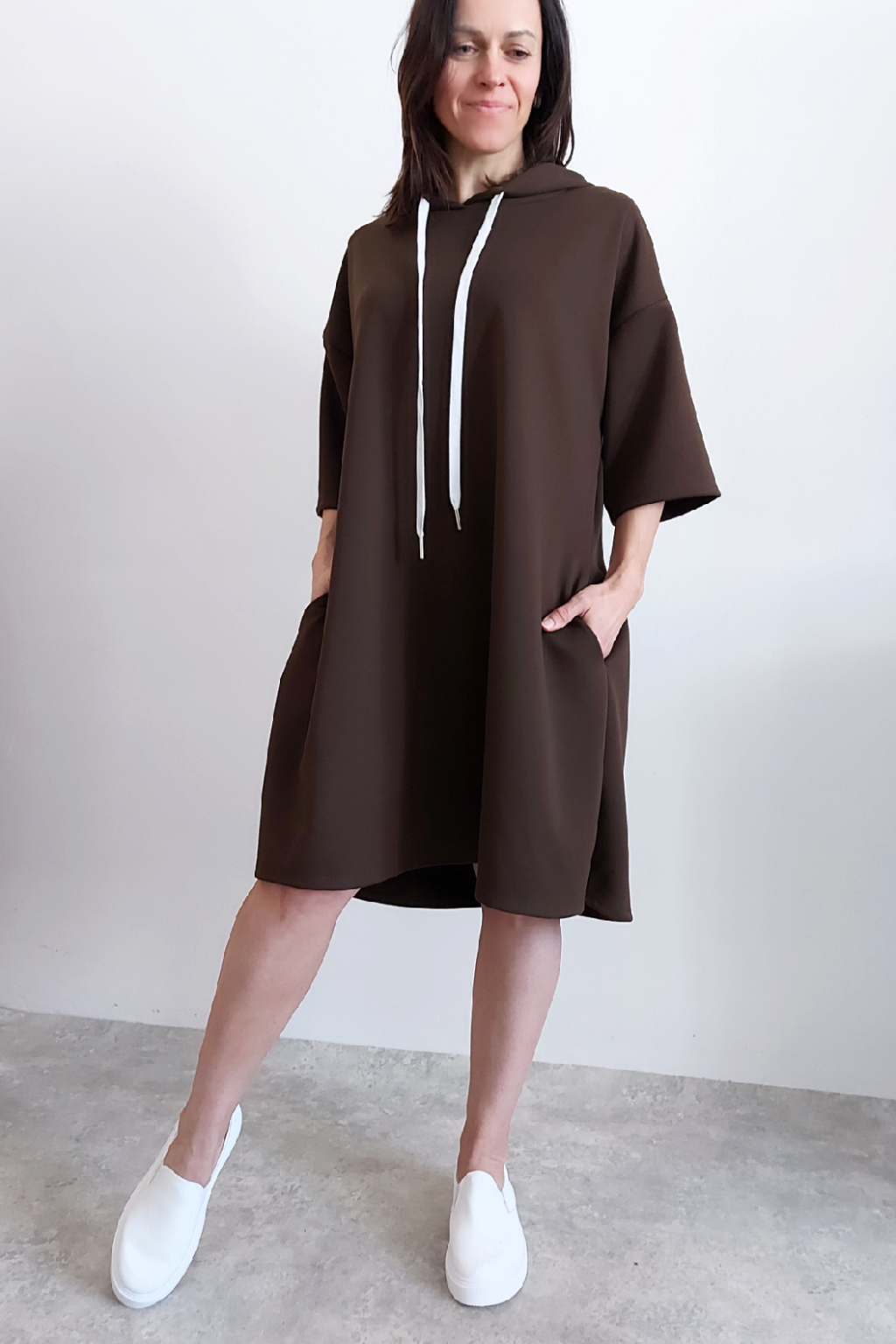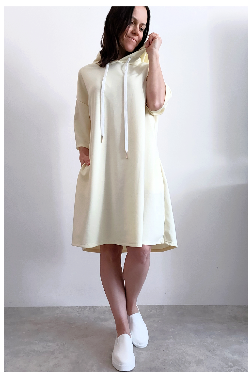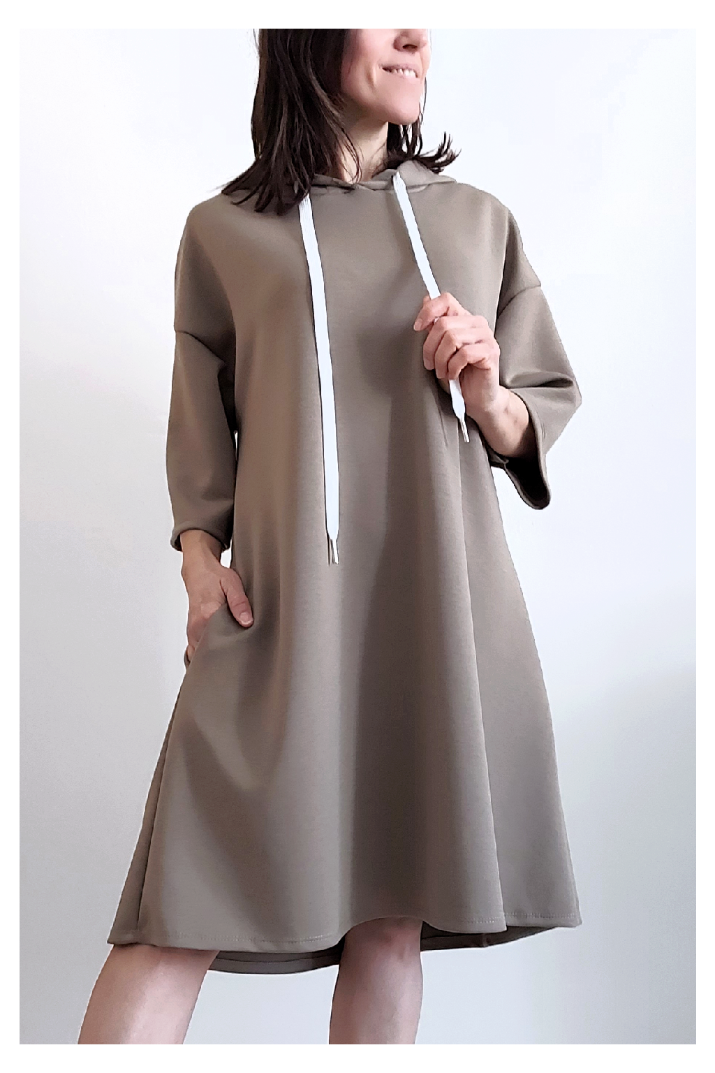 Sportovní šaty áčkového střihu s kapucí, které vypadají skvěle i jako delší tunika třeba k džínům. Rukávy jsou kratší, k loktům. Mají boční kapsy. Zadní strana maličko delší. Materiál máslový - jemný, hebký, klouzavý, splývavý, mírně mačkaný a super pružný. Vhodné i pro větší velikost. Foceno na vel. XS, výška 156cm i na vel. 2XL (prsa 116cm, boky 121cm), výška 165cm.