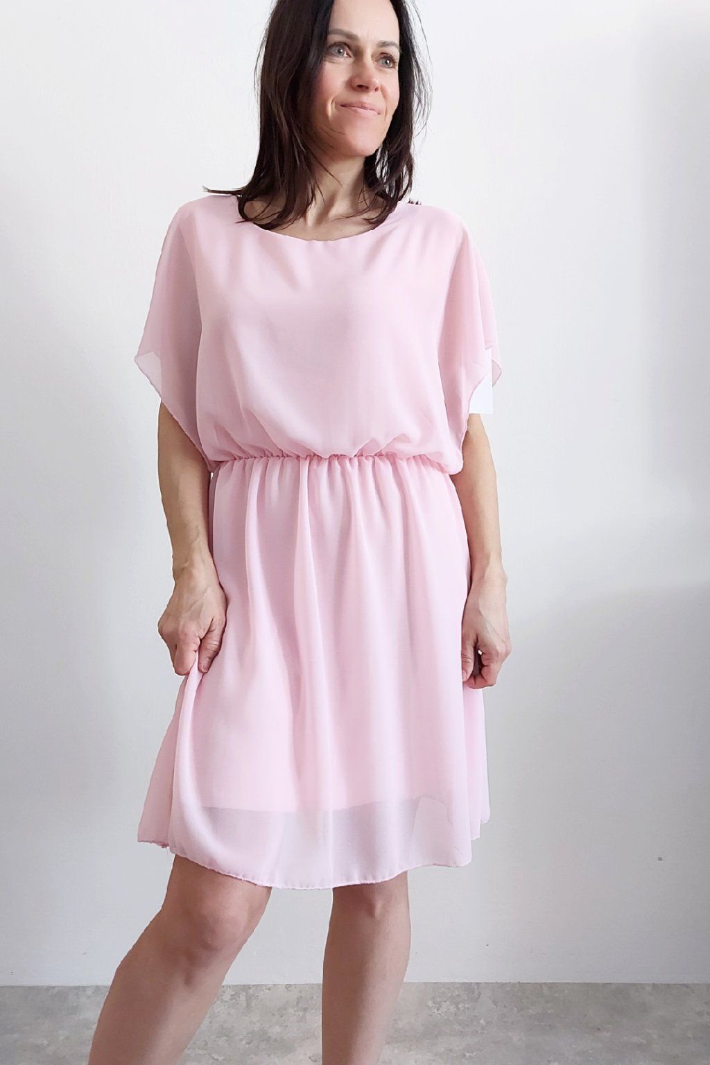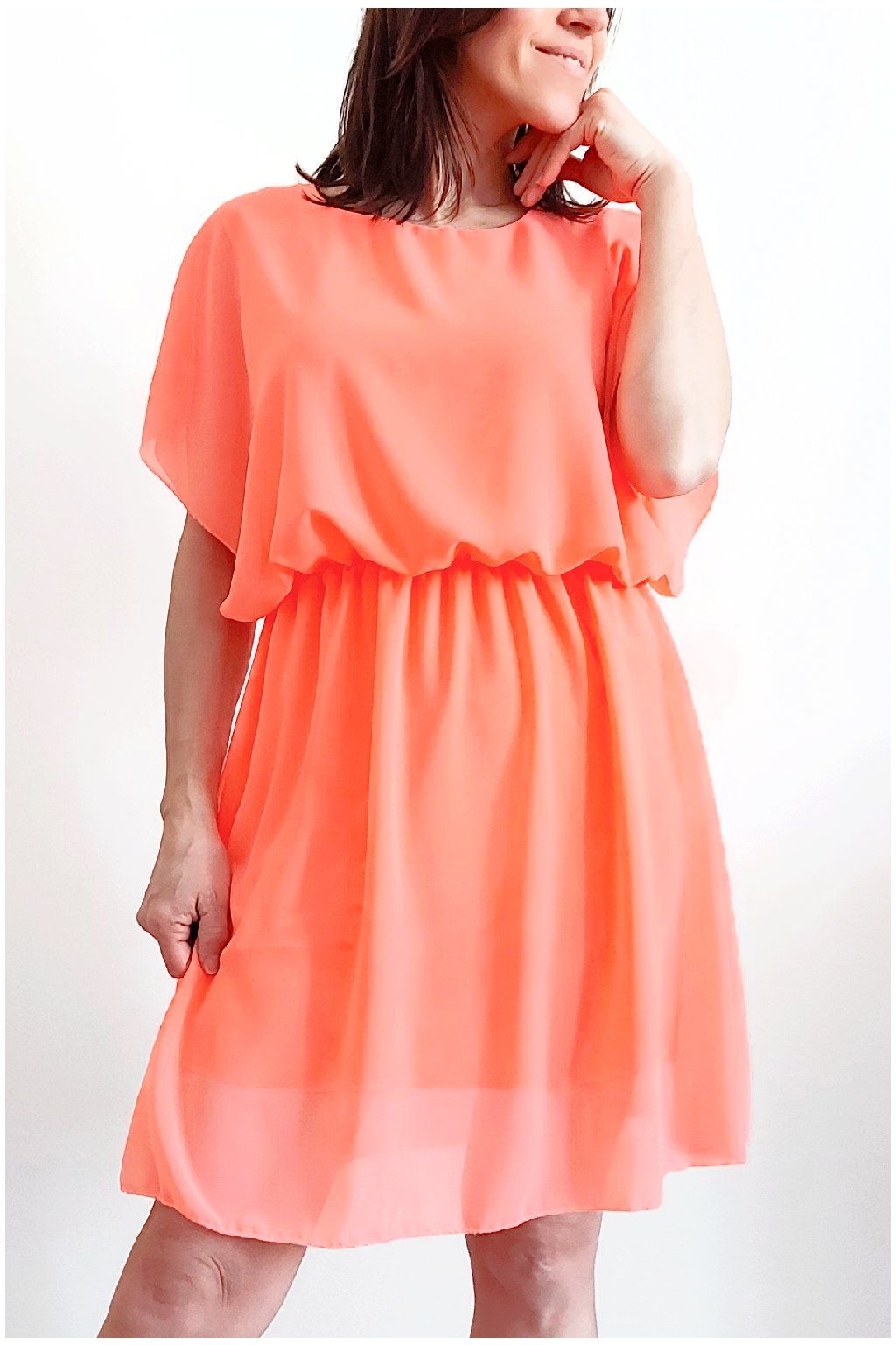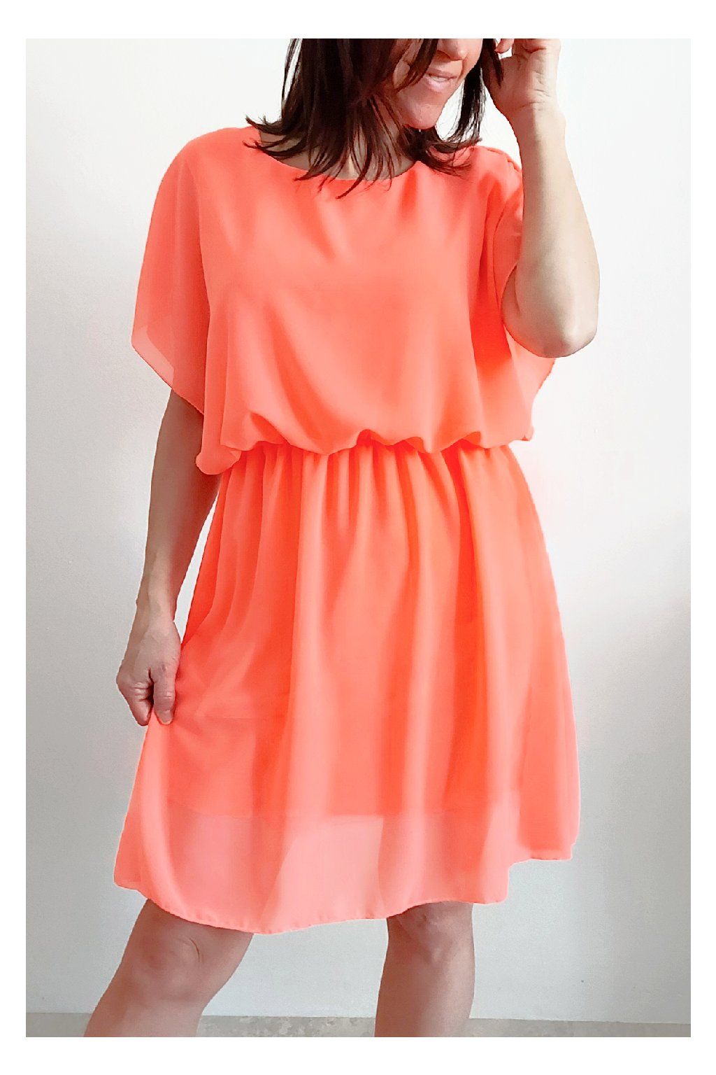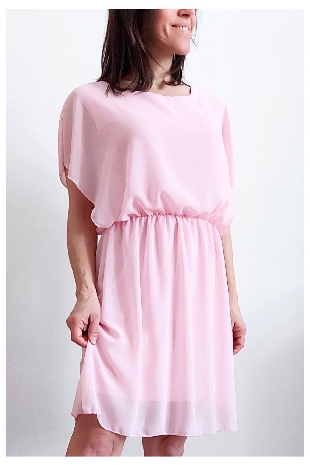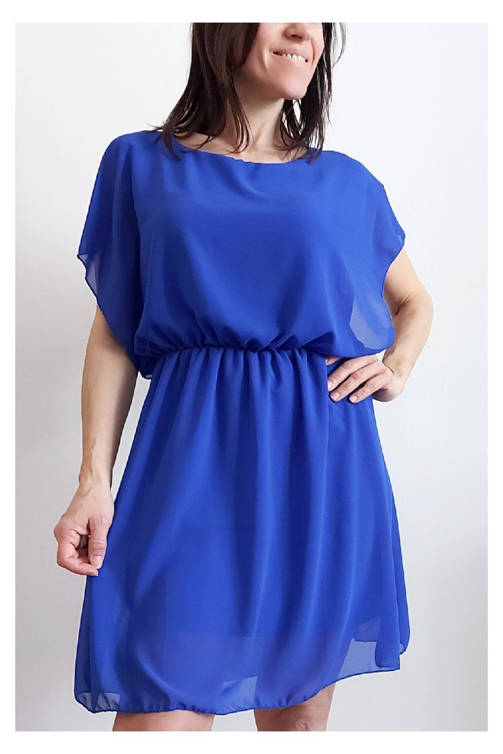 Letní šaty v pase s gumkou, která se přizpůsobí obvodu. Podšívka z viskózy, nejsou tedy průhledné. Bez kapes, oblékání přes hlavu. Materiál lehoučký, vzdušný. Foceno na vel. XS, výška 156cm.