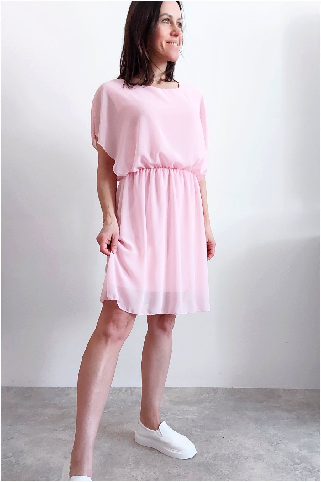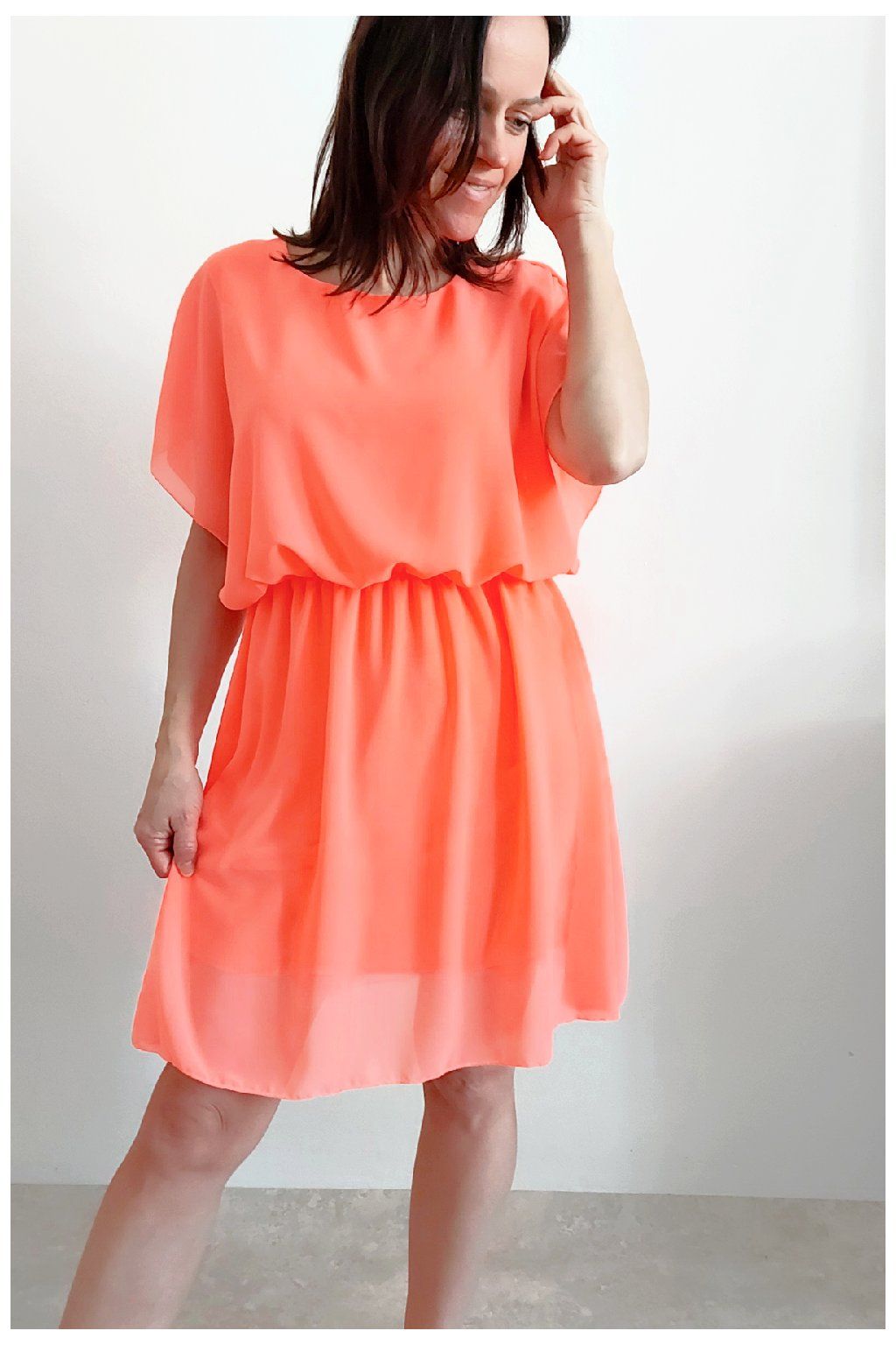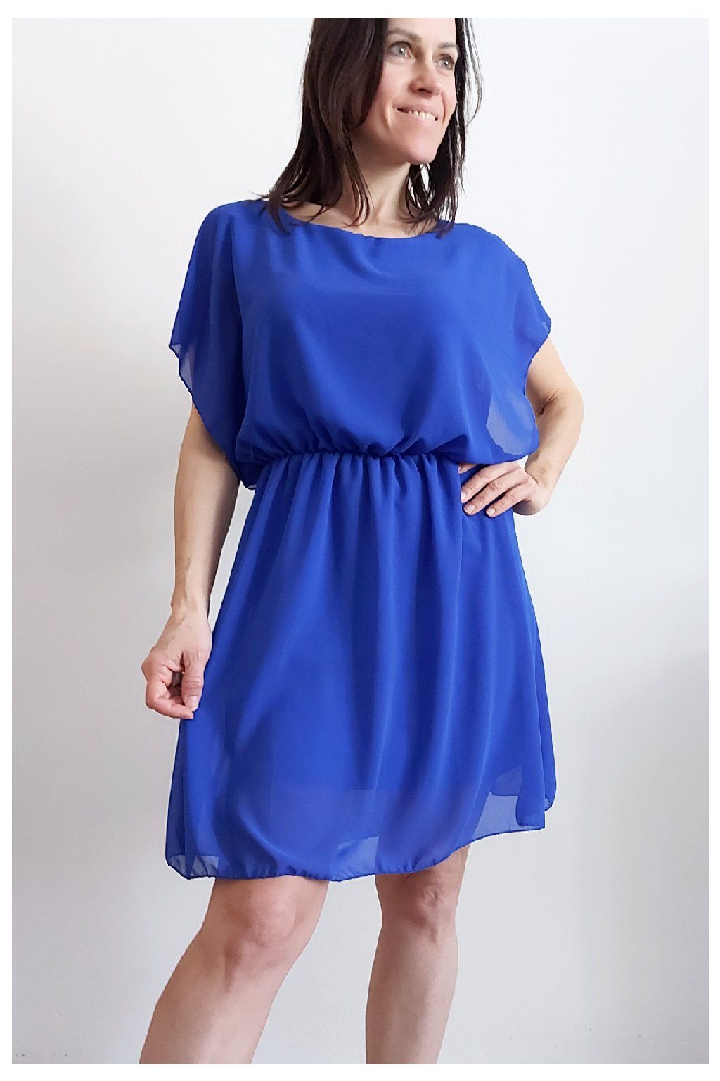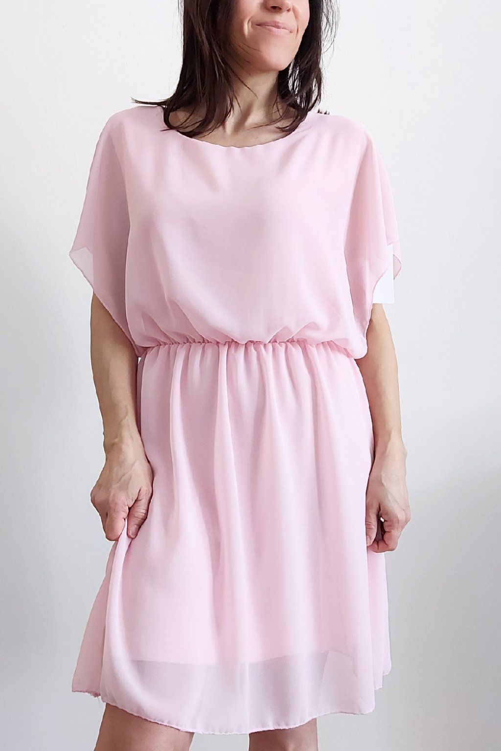 Letní šaty v pase s gumkou, která se přizpůsobí obvodu. Podšívka z viskózy, nejsou tedy průhledné. Bez kapes, oblékání přes hlavu. Materiál lehoučký, vzdušný. Foceno na vel. XS, výška 156cm.
