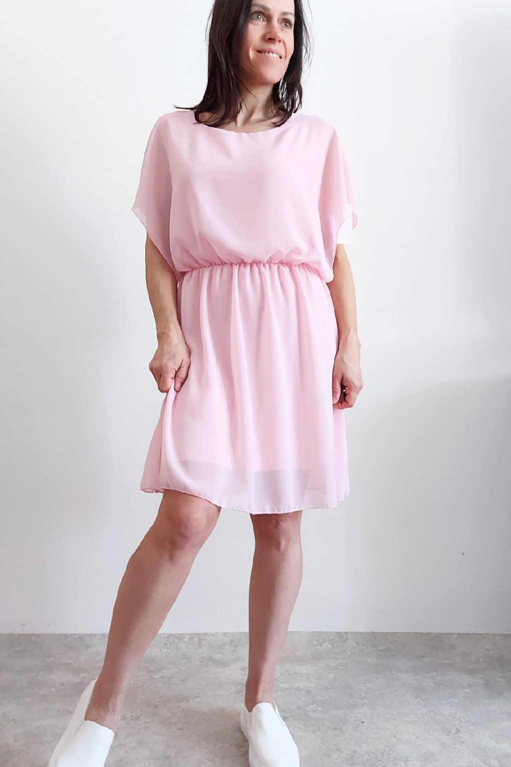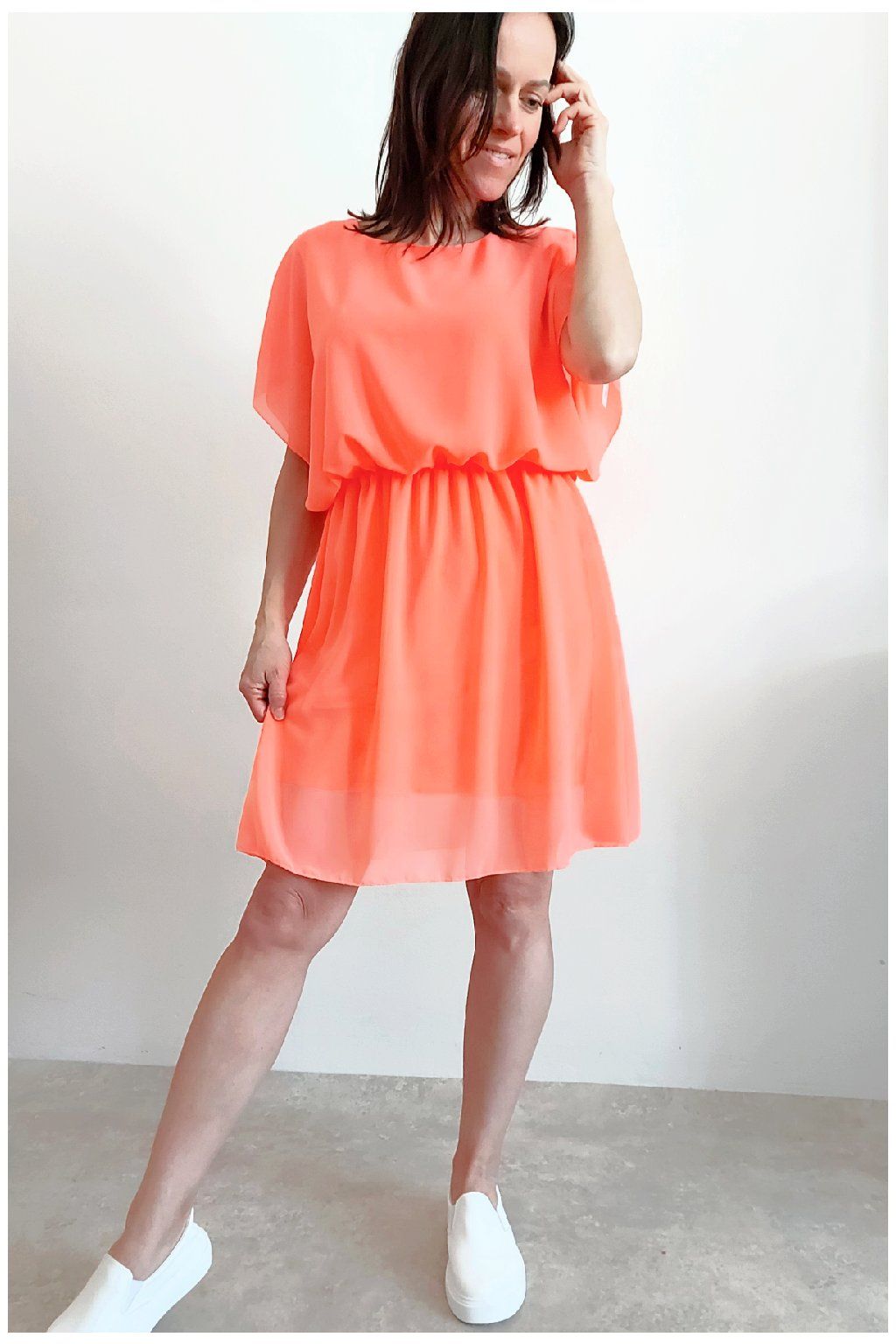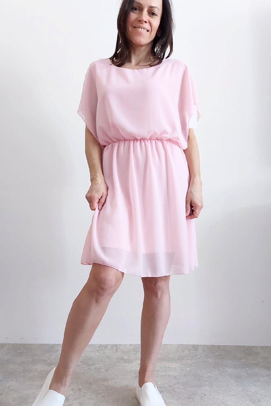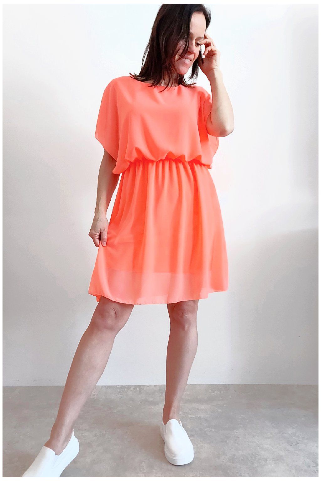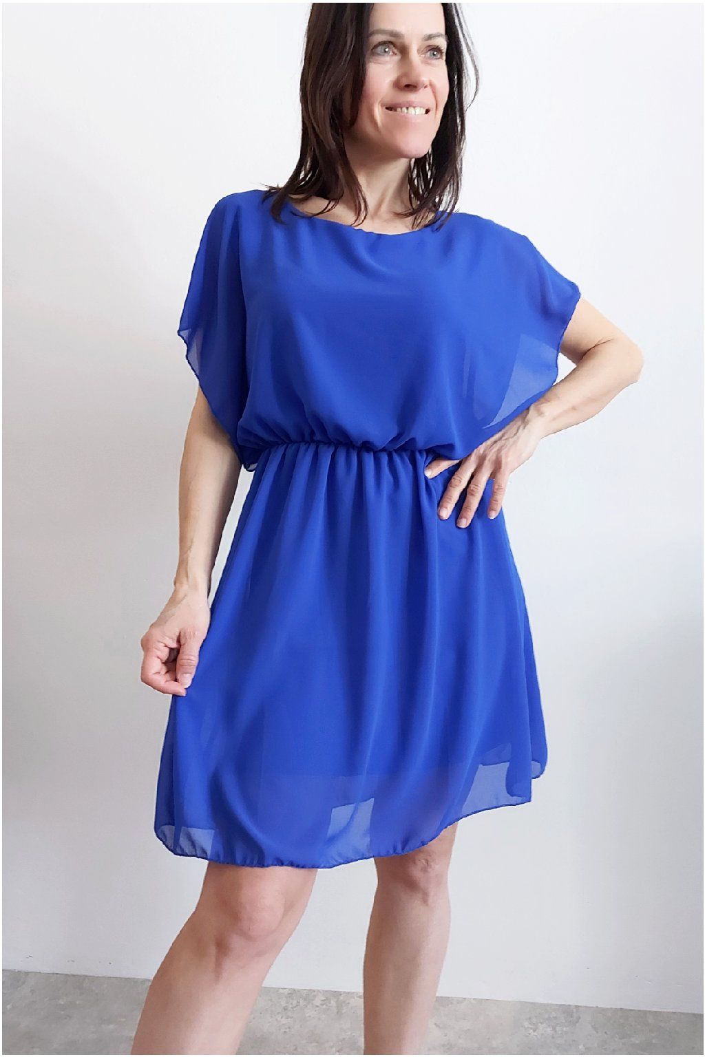 Letní šaty v pase s gumkou, která se přizpůsobí obvodu. Podšívka z viskózy, nejsou tedy průhledné. Bez kapes, oblékání přes hlavu. Materiál lehoučký, vzdušný. Foceno na vel. XS, výška 156cm.