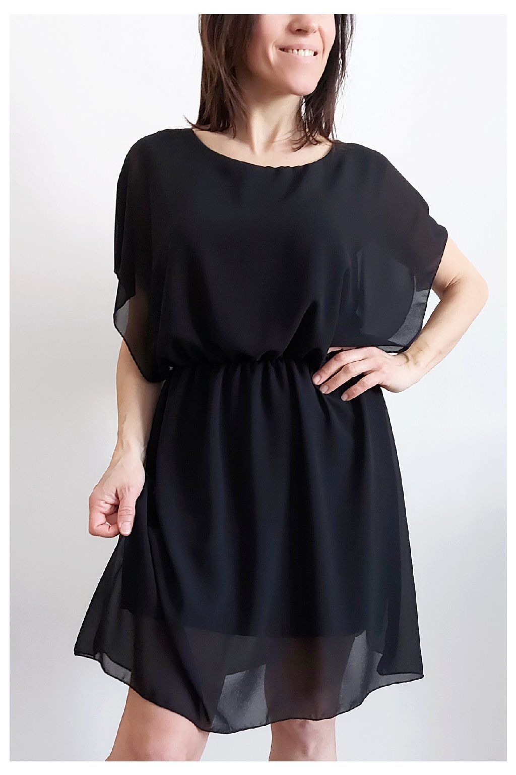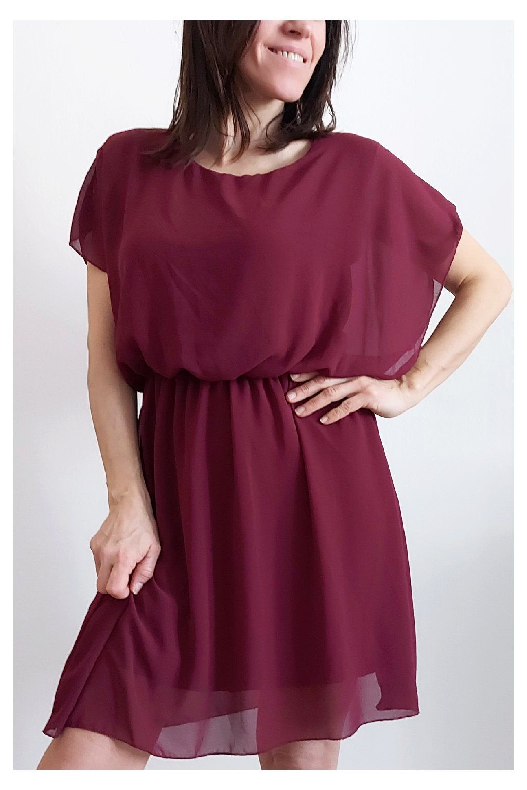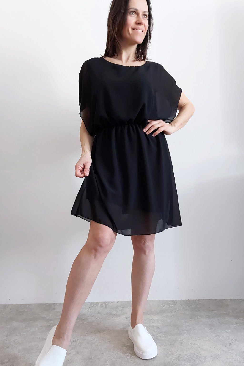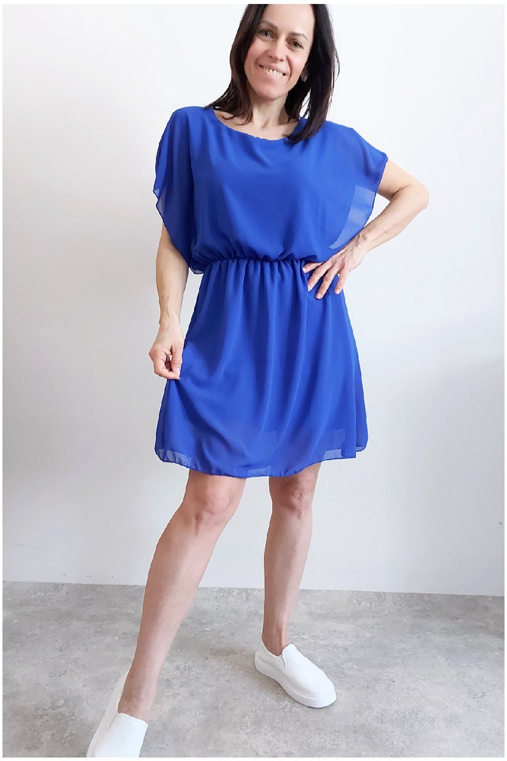 Letní šaty v pase s gumkou, která se přizpůsobí obvodu. Podšívka z viskózy, nejsou tedy průhledné. Bez kapes, oblékání přes hlavu. Materiál lehoučký, vzdušný. Foceno na vel. XS, výška 156cm.