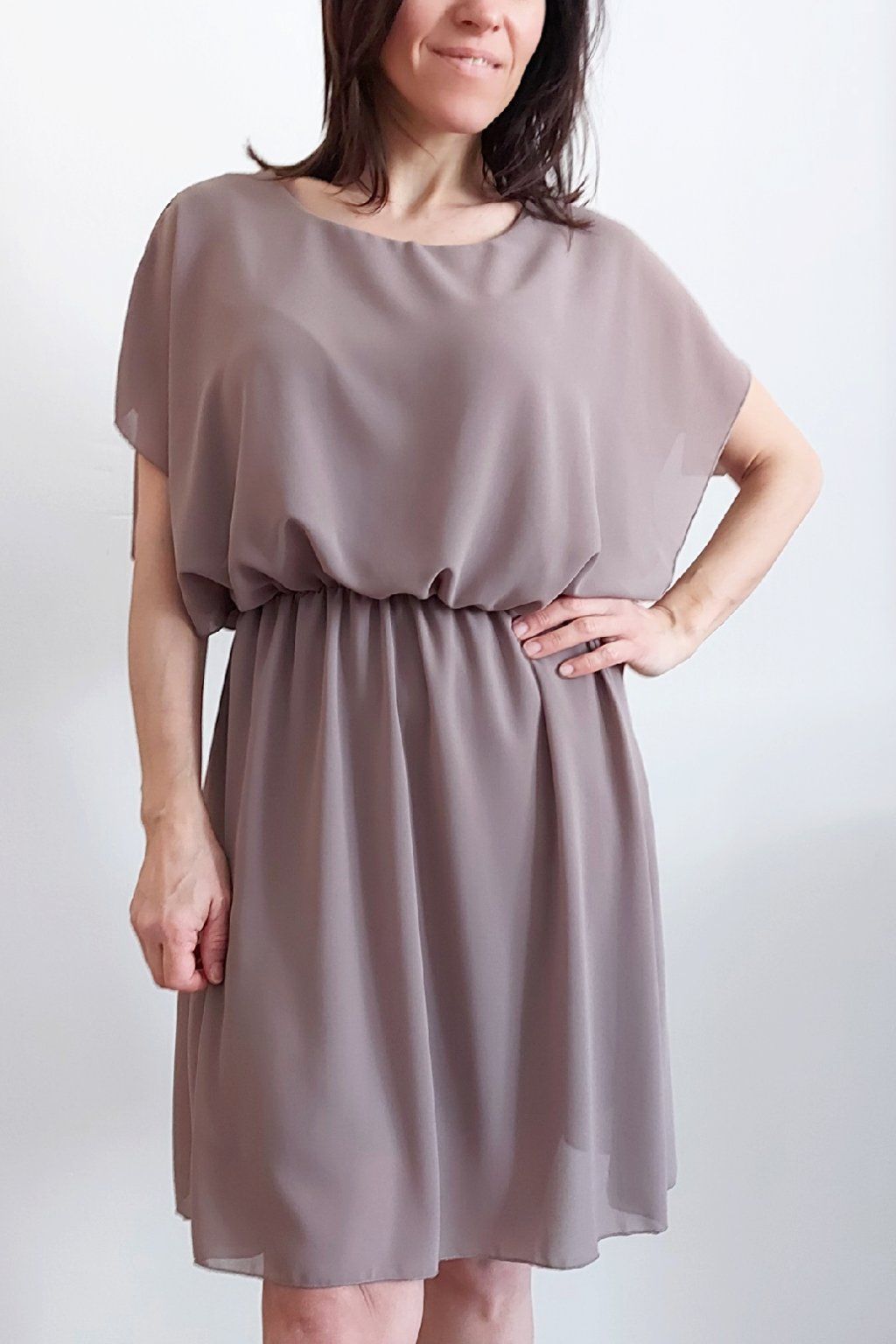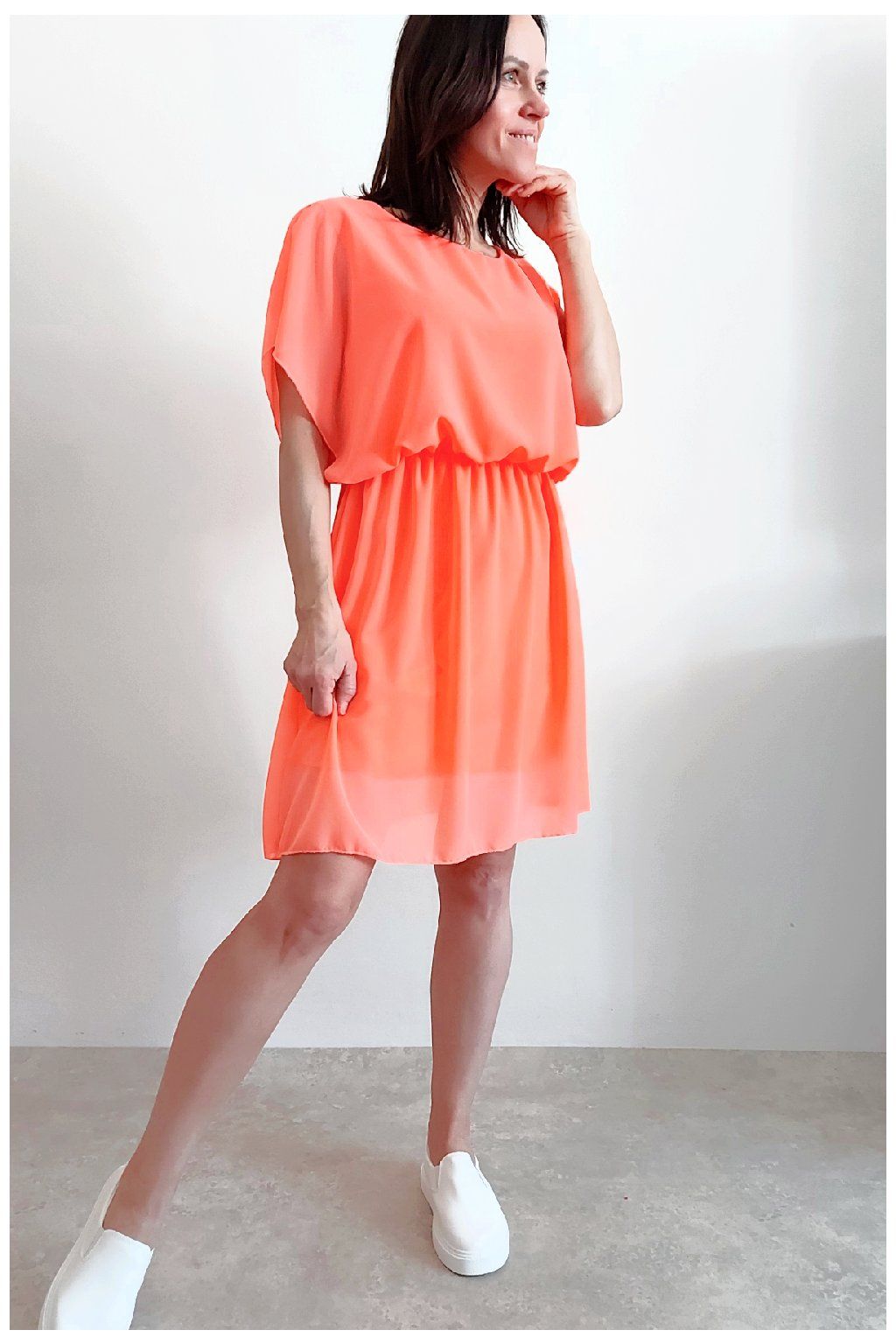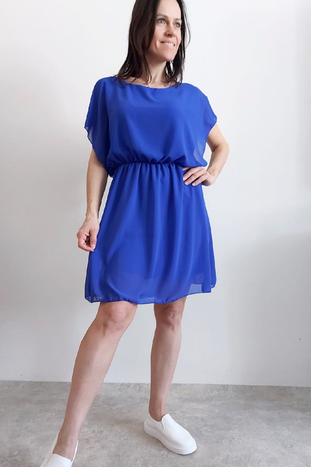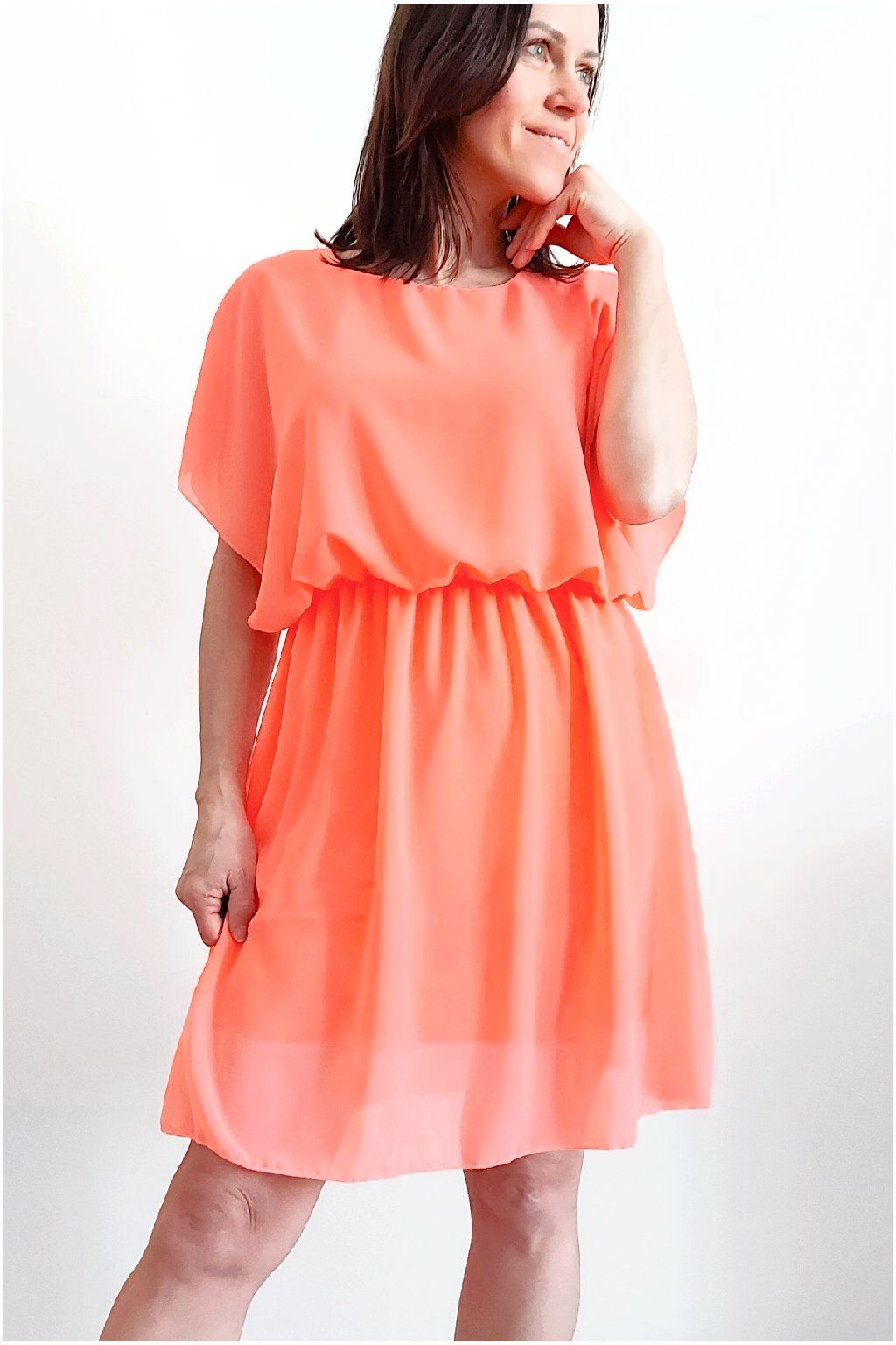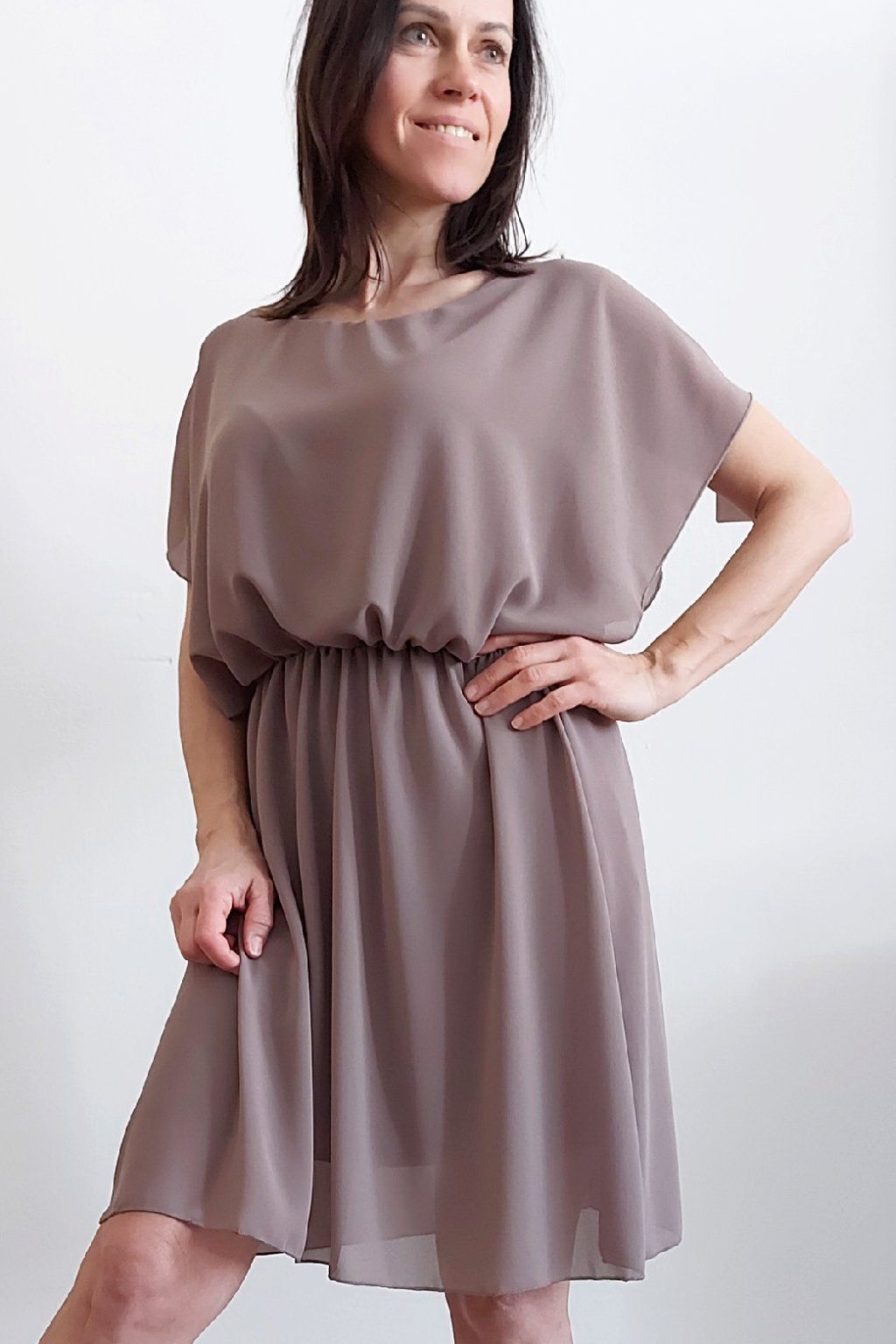 Letní šaty v pase s gumkou, která se přizpůsobí obvodu. Podšívka z viskózy, nejsou tedy průhledné. Bez kapes, oblékání přes hlavu. Materiál lehoučký, vzdušný. Foceno na vel. XS, výška 156cm.