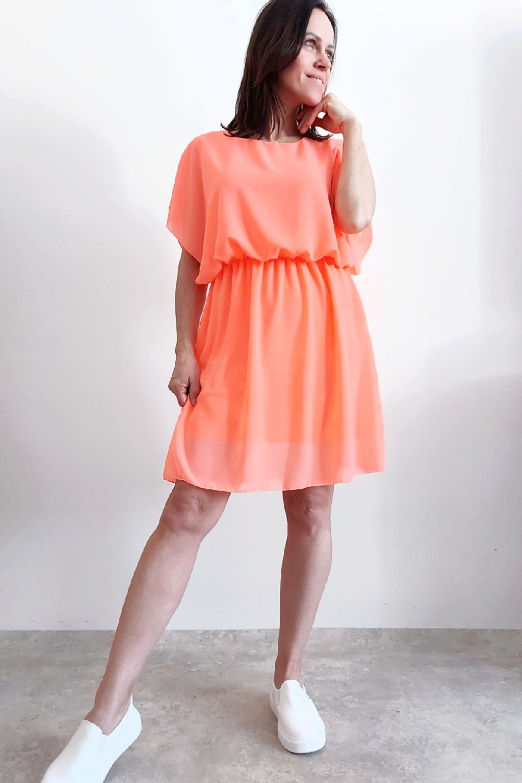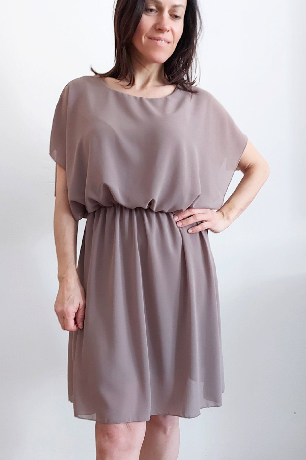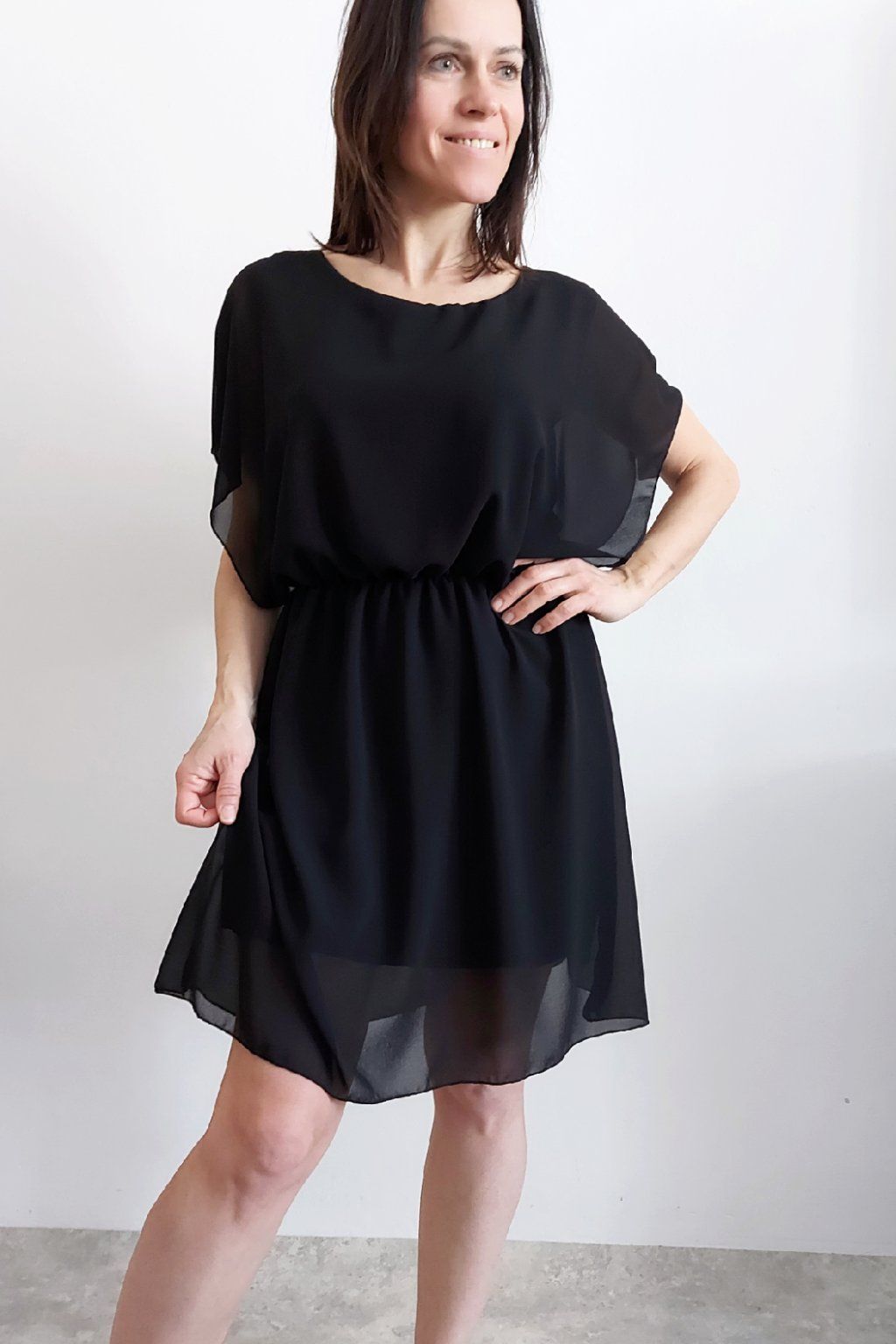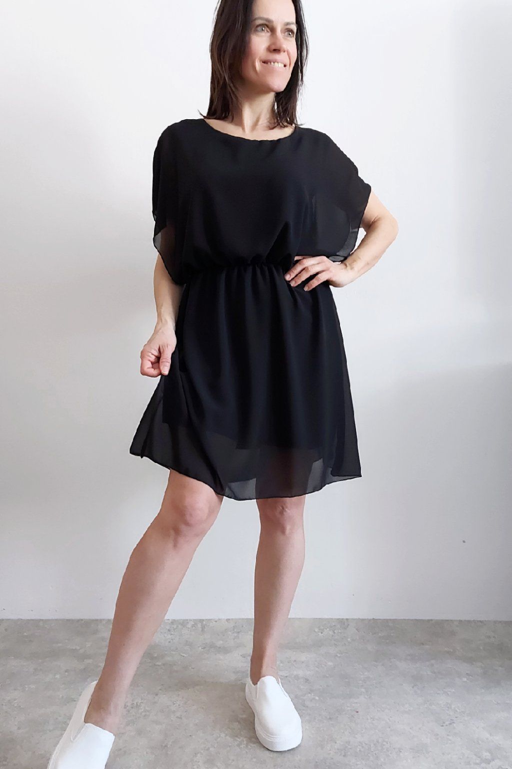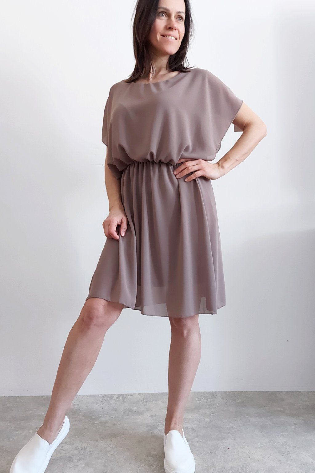 Letní šaty v pase s gumkou, která se přizpůsobí obvodu. Podšívka z viskózy, nejsou tedy průhledné. Bez kapes, oblékání přes hlavu. Materiál lehoučký, vzdušný. Foceno na vel. XS, výška 156cm.