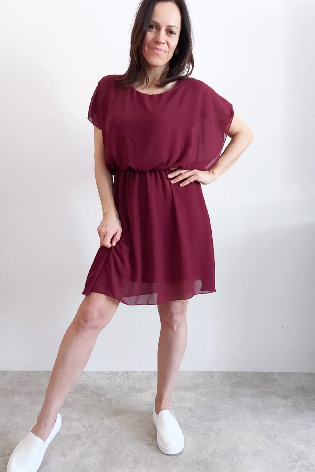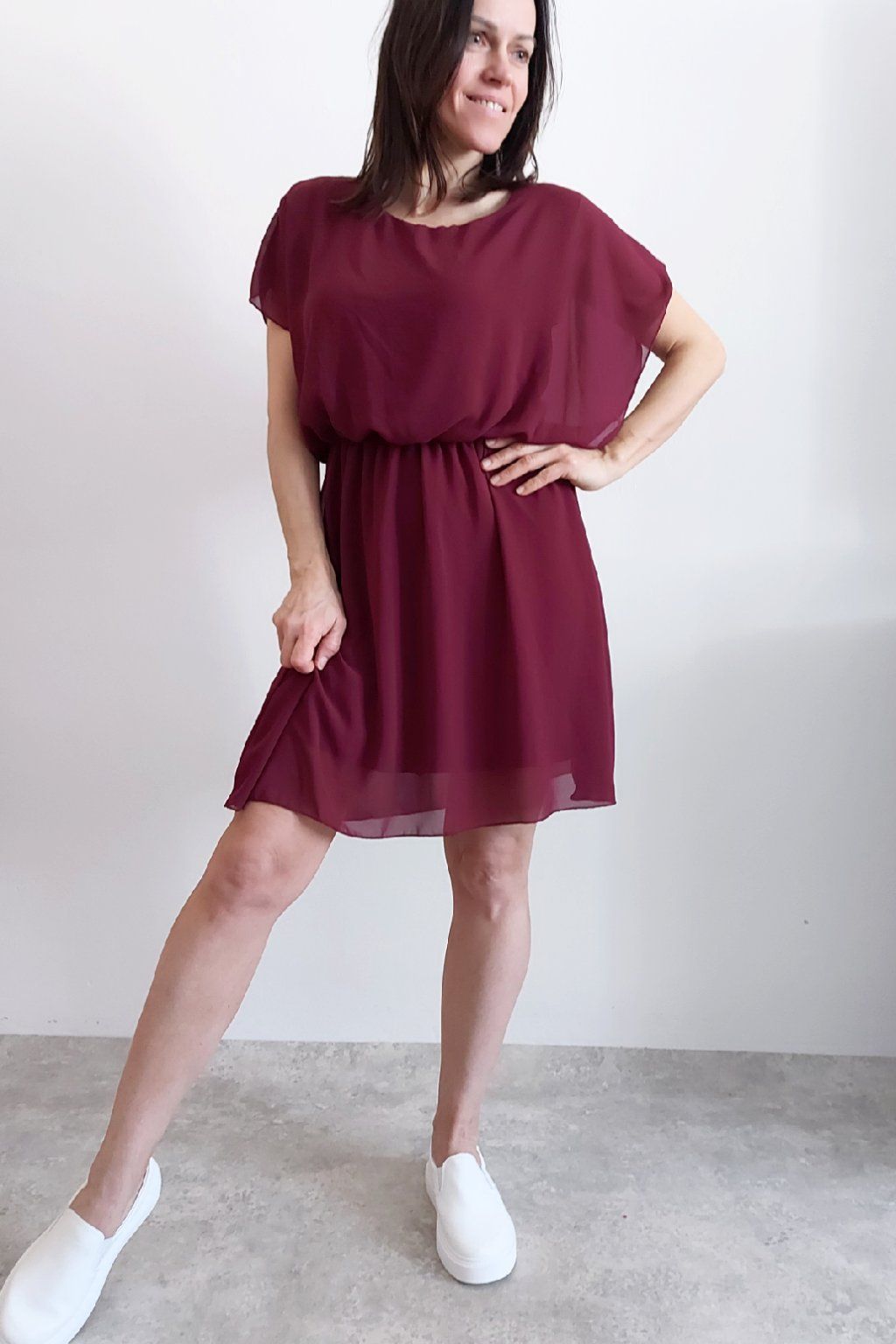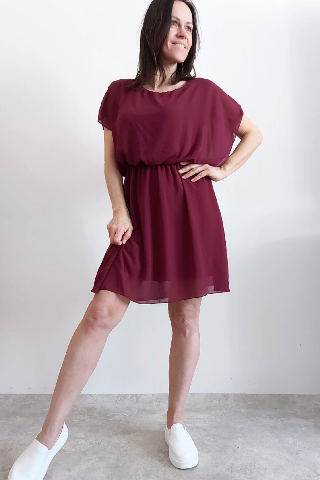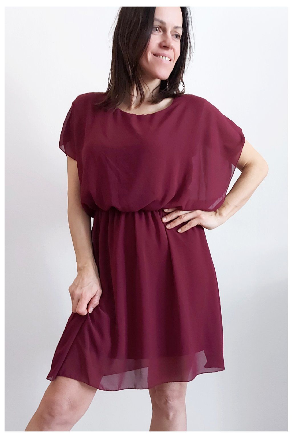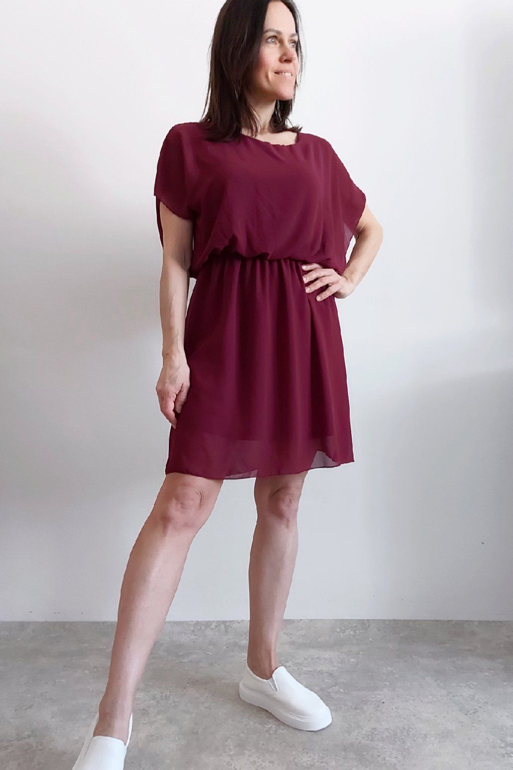Letní šaty v pase s gumkou, která se přizpůsobí obvodu. Podšívka z viskózy, nejsou tedy průhledné. Bez kapes, oblékání přes hlavu. Materiál lehoučký, vzdušný. Foceno na vel. XS, výška 156cm.