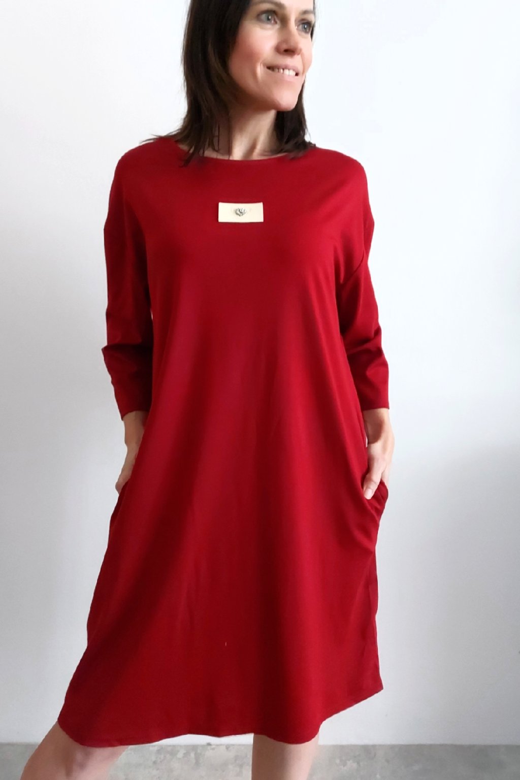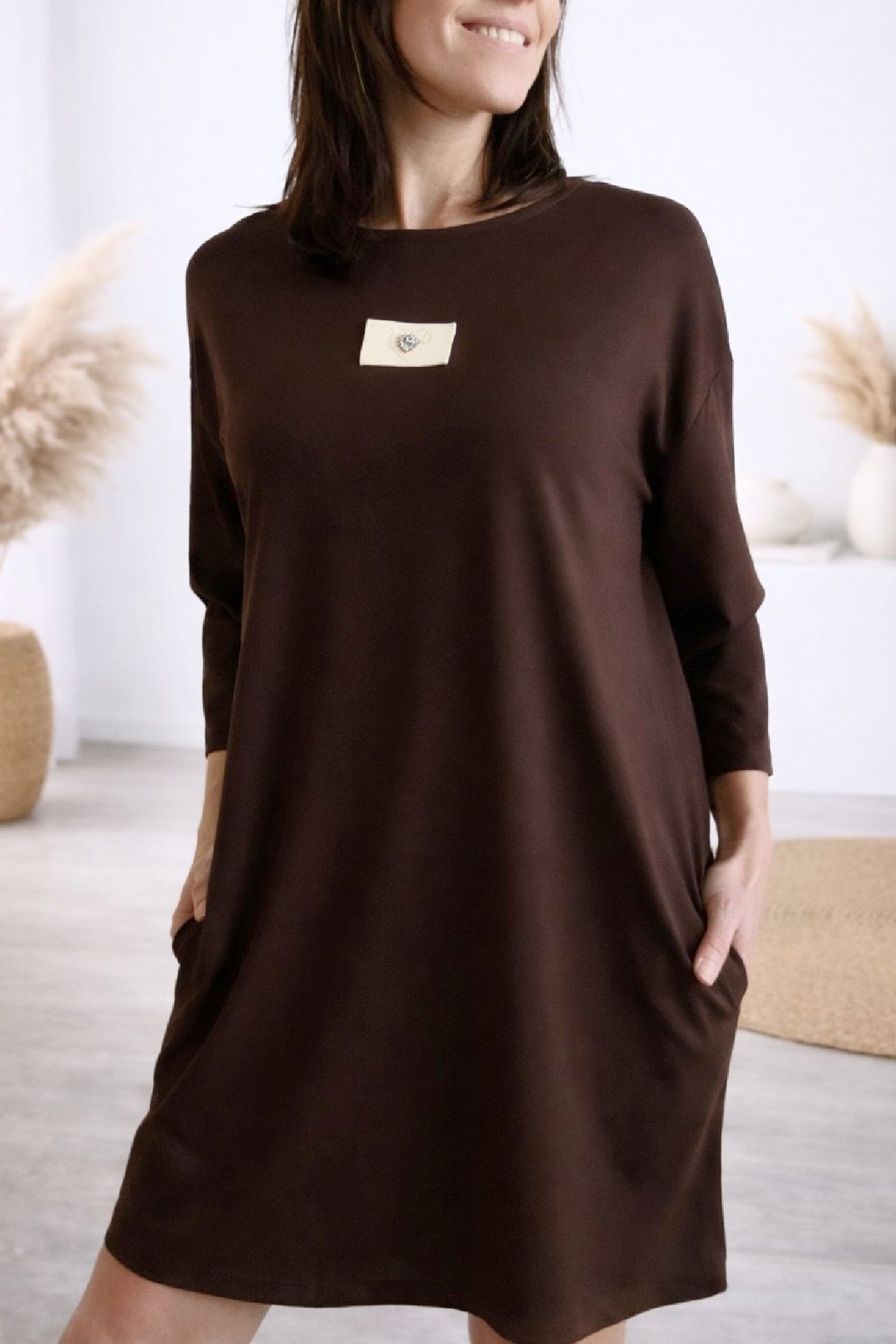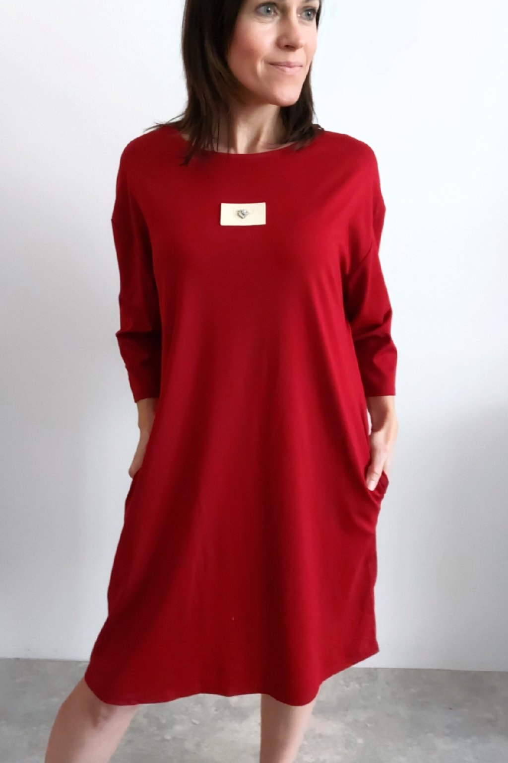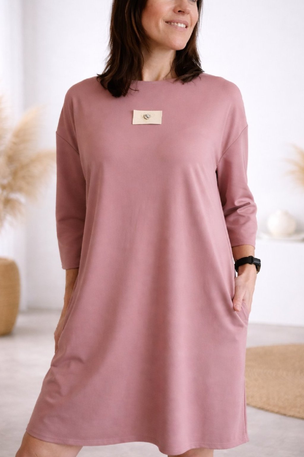 Šaty s 3/4 rukávem. Na předním díle ozdobná nášivka. Boční kapsy. Zadní strana maličko delší. Máslový materiál - jemný, hebký, klouzavý, mírně chladivý. Foceno na vel. XS, výška 156cm.