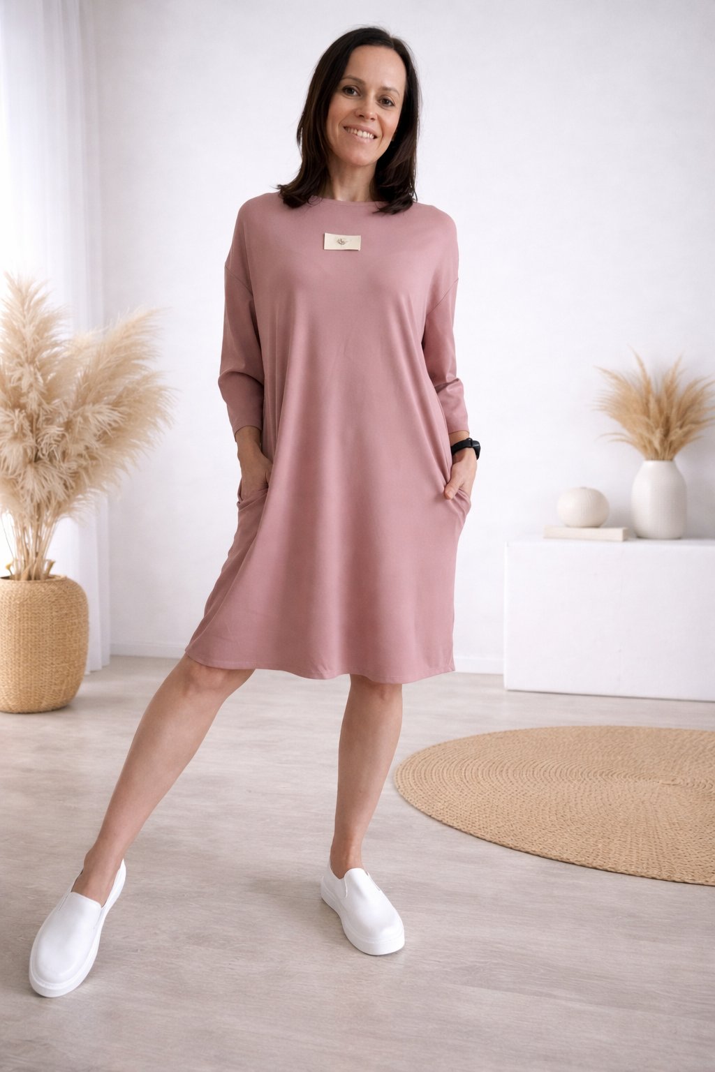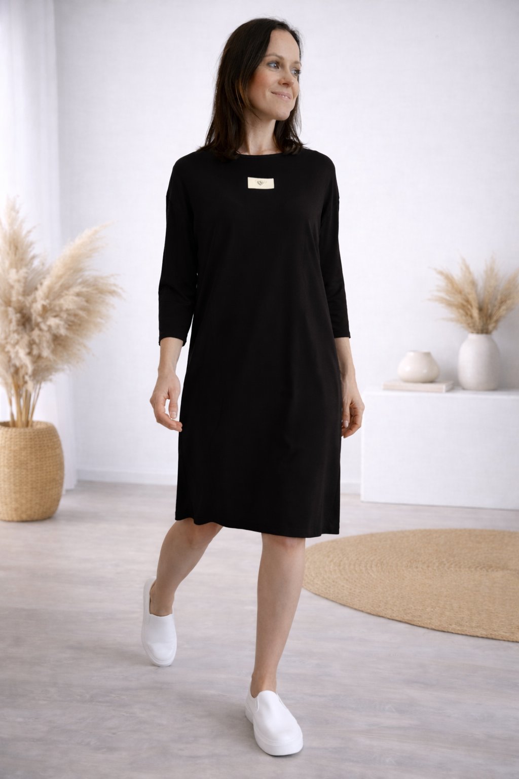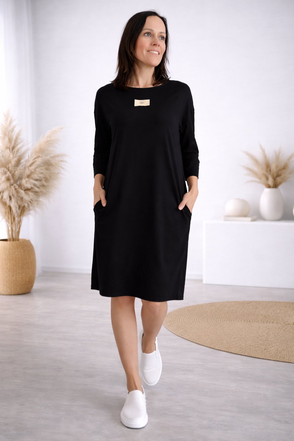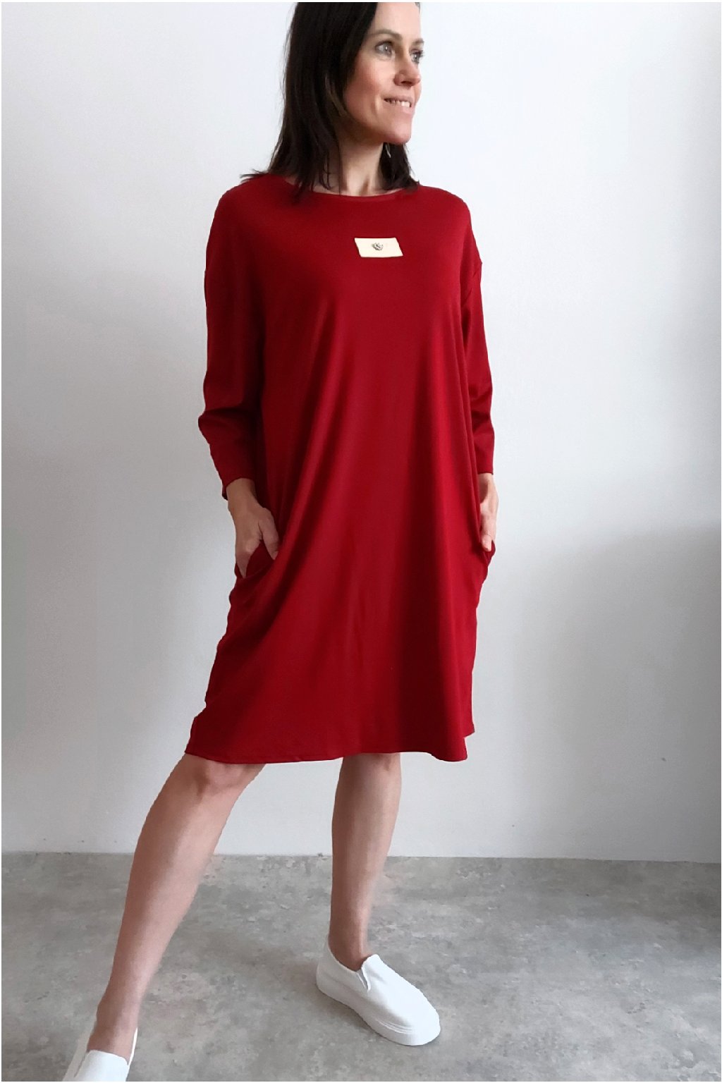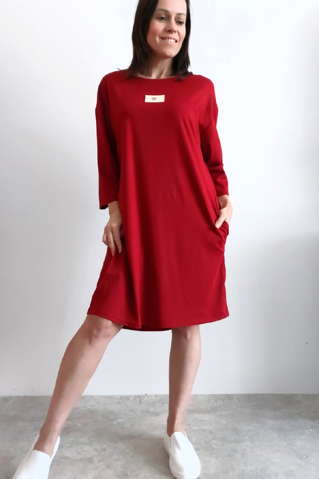 Šaty s 3/4 rukávem. Na předním díle ozdobná nášivka. Boční kapsy. Zadní strana maličko delší. Máslový materiál - jemný, hebký, klouzavý, mírně chladivý. Foceno na vel. XS, výška 156cm.