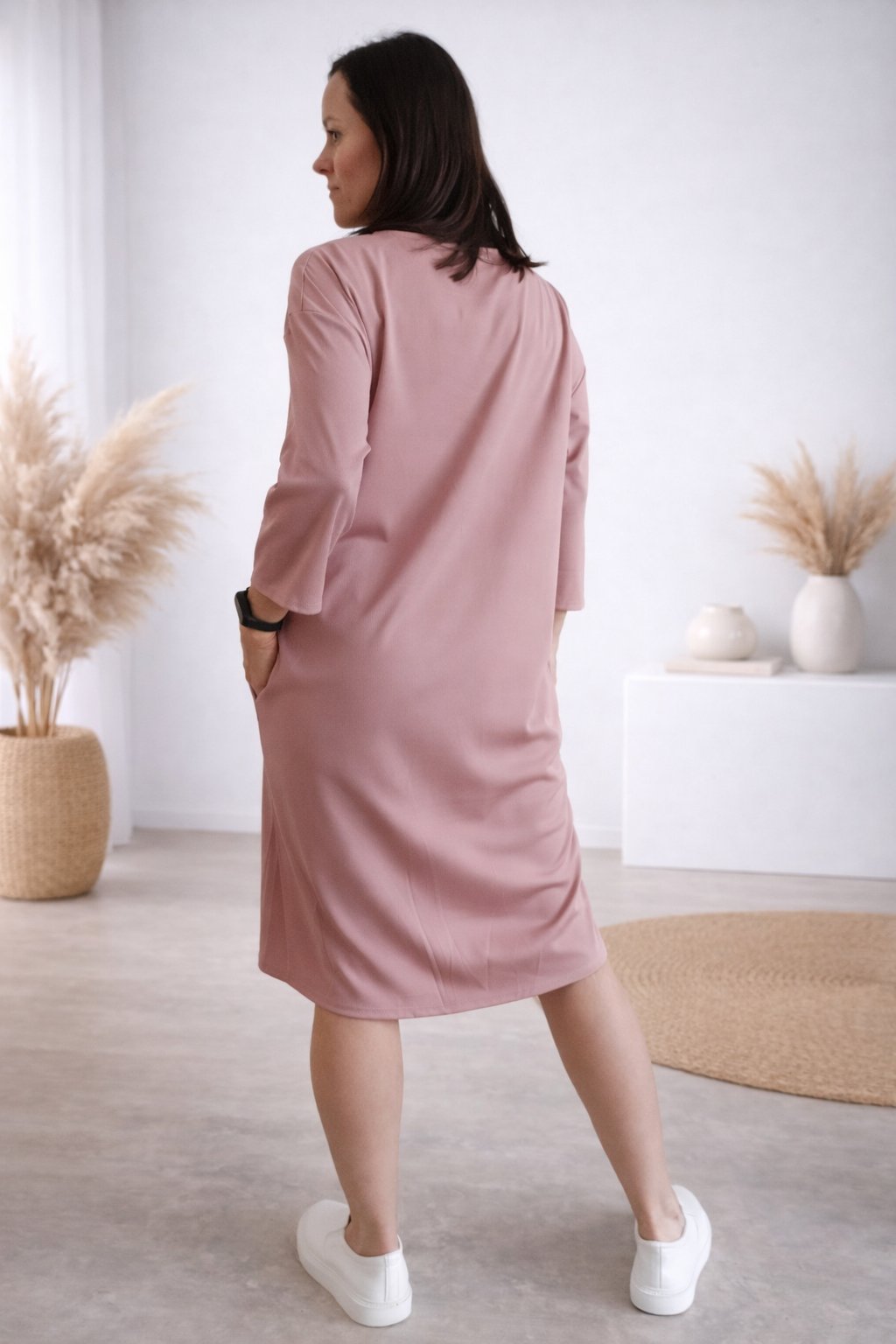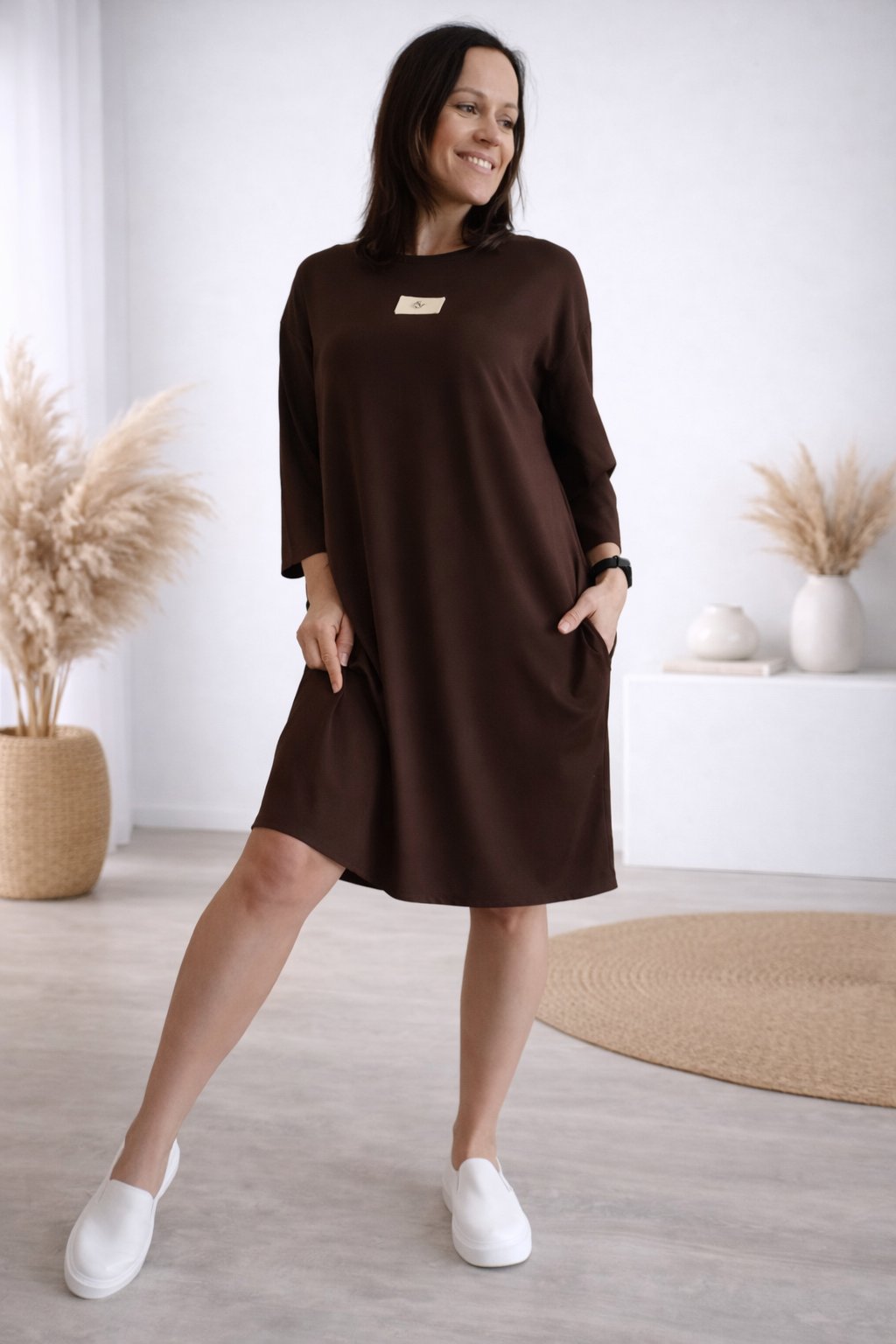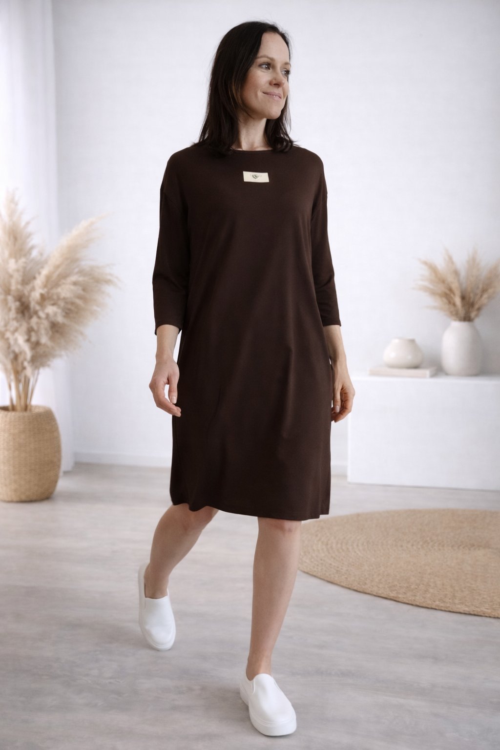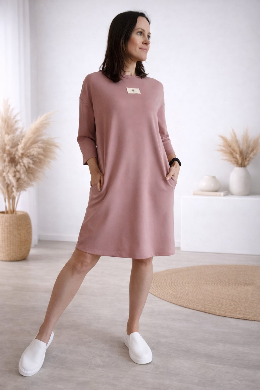 Šaty s 3/4 rukávem. Na předním díle ozdobná nášivka. Boční kapsy. Zadní strana maličko delší. Máslový materiál - jemný, hebký, klouzavý, mírně chladivý. Foceno na vel. XS, výška 156cm.