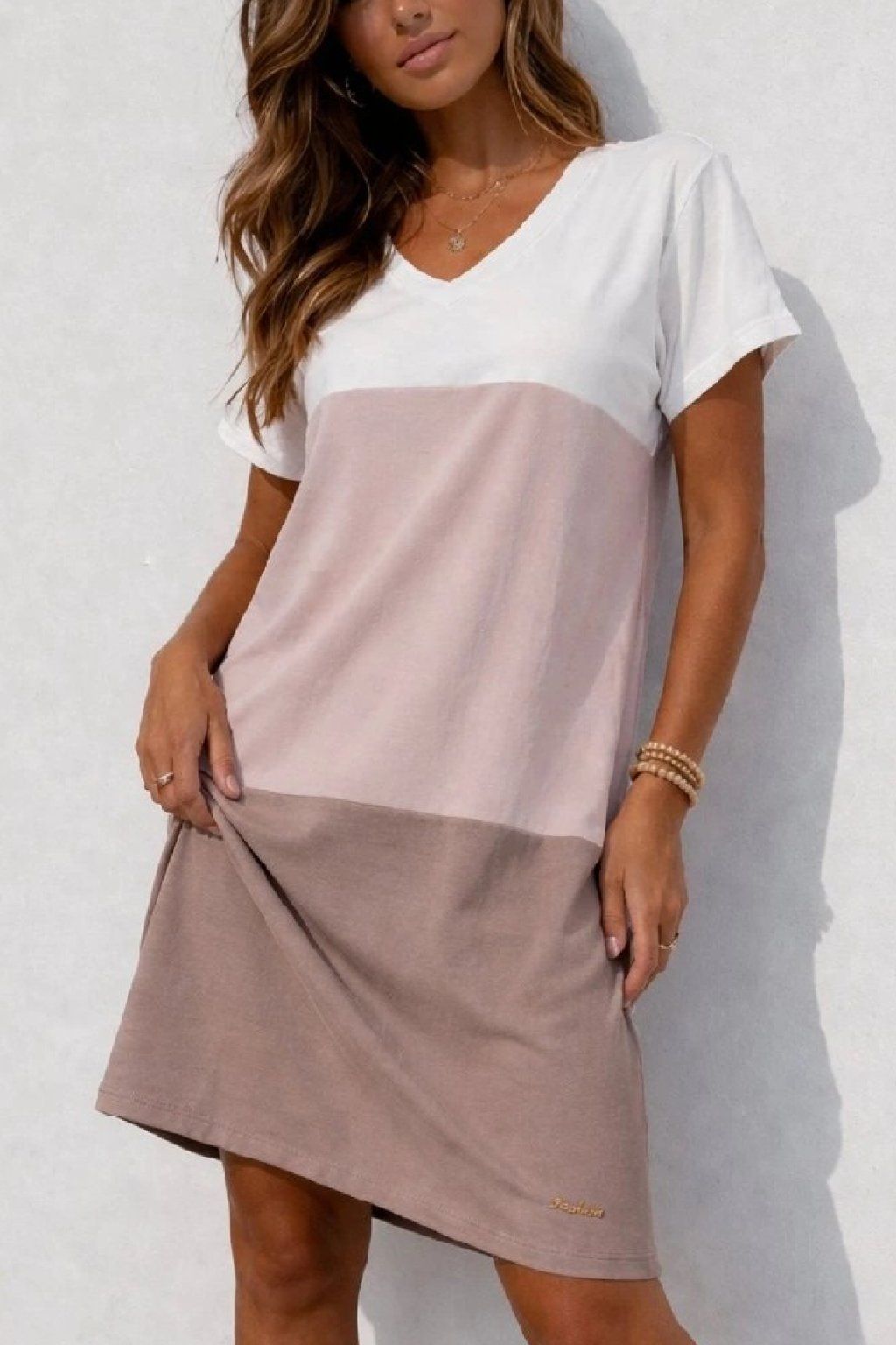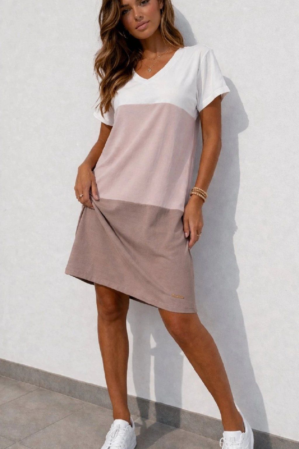 Letní šaty s véčkovým výstřihem v krásných barevných kombinacích. Bez kapes. Rovný, volný střih. Rukávky krátké. Ve spodní části našitá ozdoba nápis Fashion ve zlatém provedení. Materiál máslový - hebký, jemný, klouzavý, splývavý a pružný. Ten si zamiluješ na první obléknutí