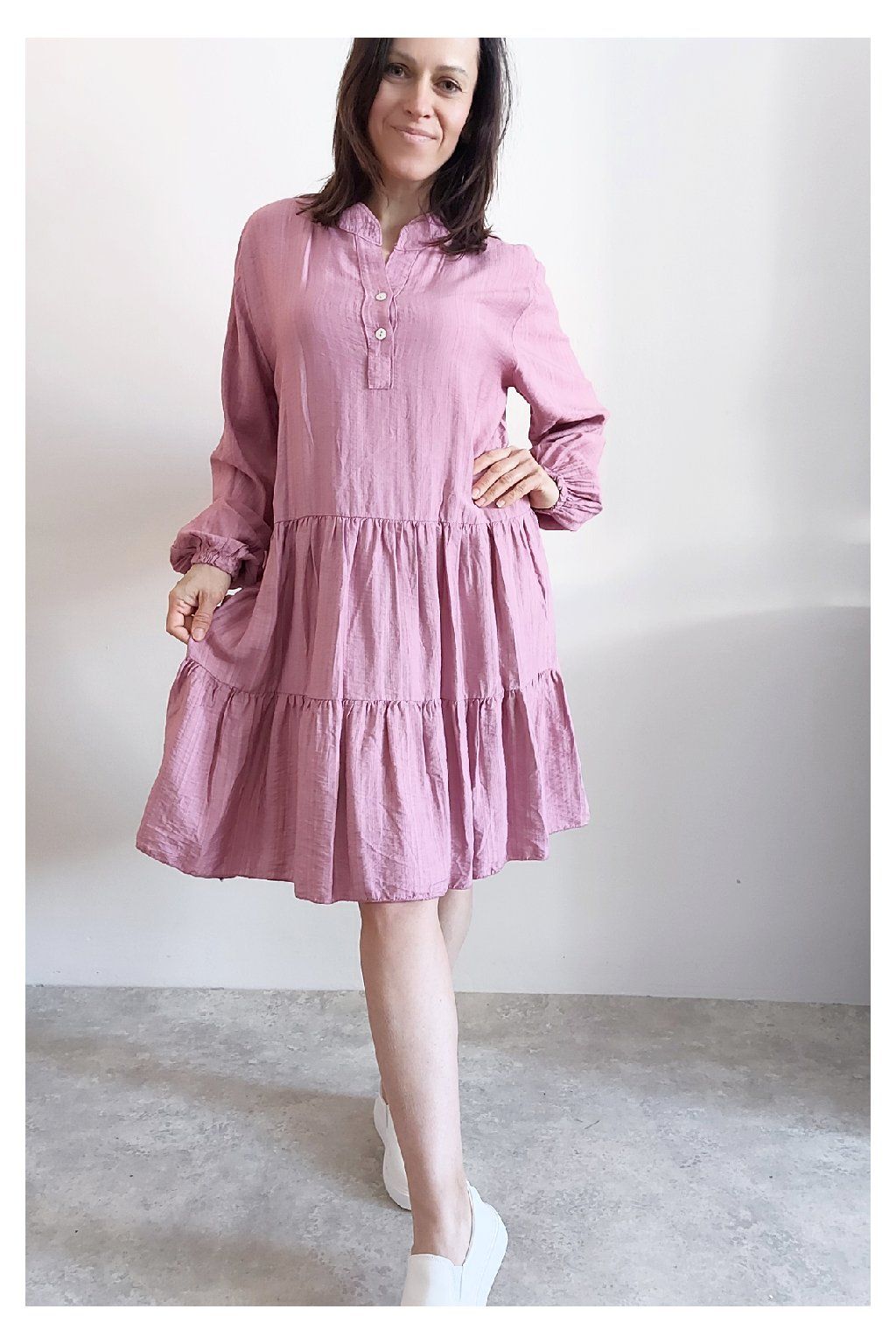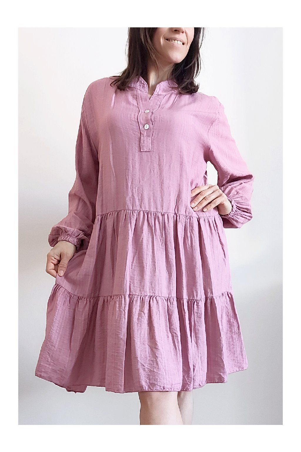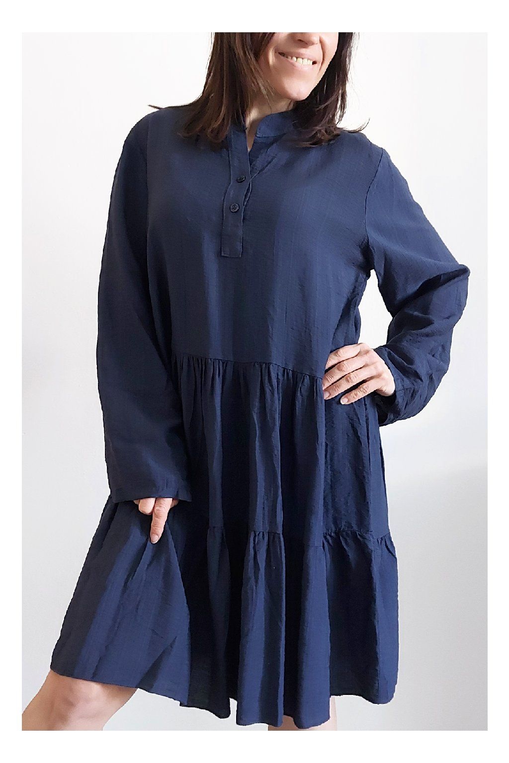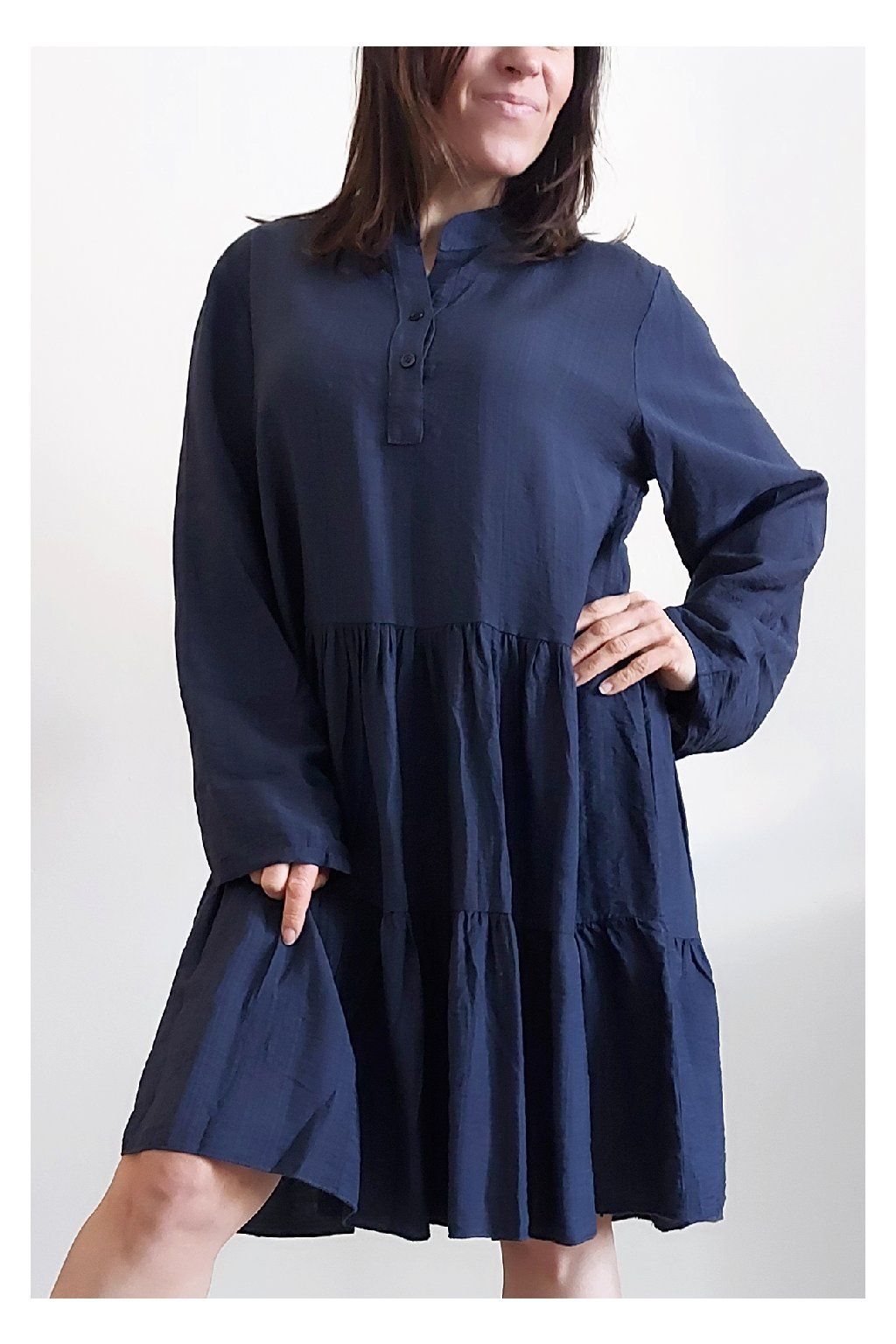 Šaty s kanýry. Výstřih na knoflíčky. Rukávy dlouhé - u barvy khaki a starorůžové jsou ukončené do gumky, u tmavě modré klasicky rovné. Bez kapes. Oversize střih-volný, vhodné tedy i pro větší velikosti. Materiál vzdušný, příjemný ale není pružný. Foceno na vel. XS, výška 156cm.