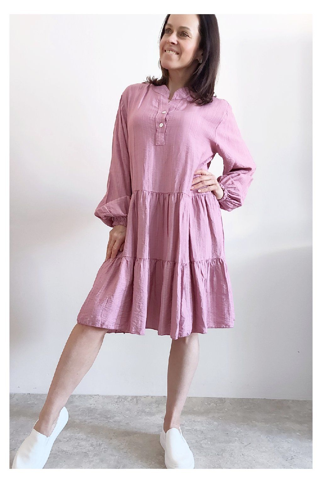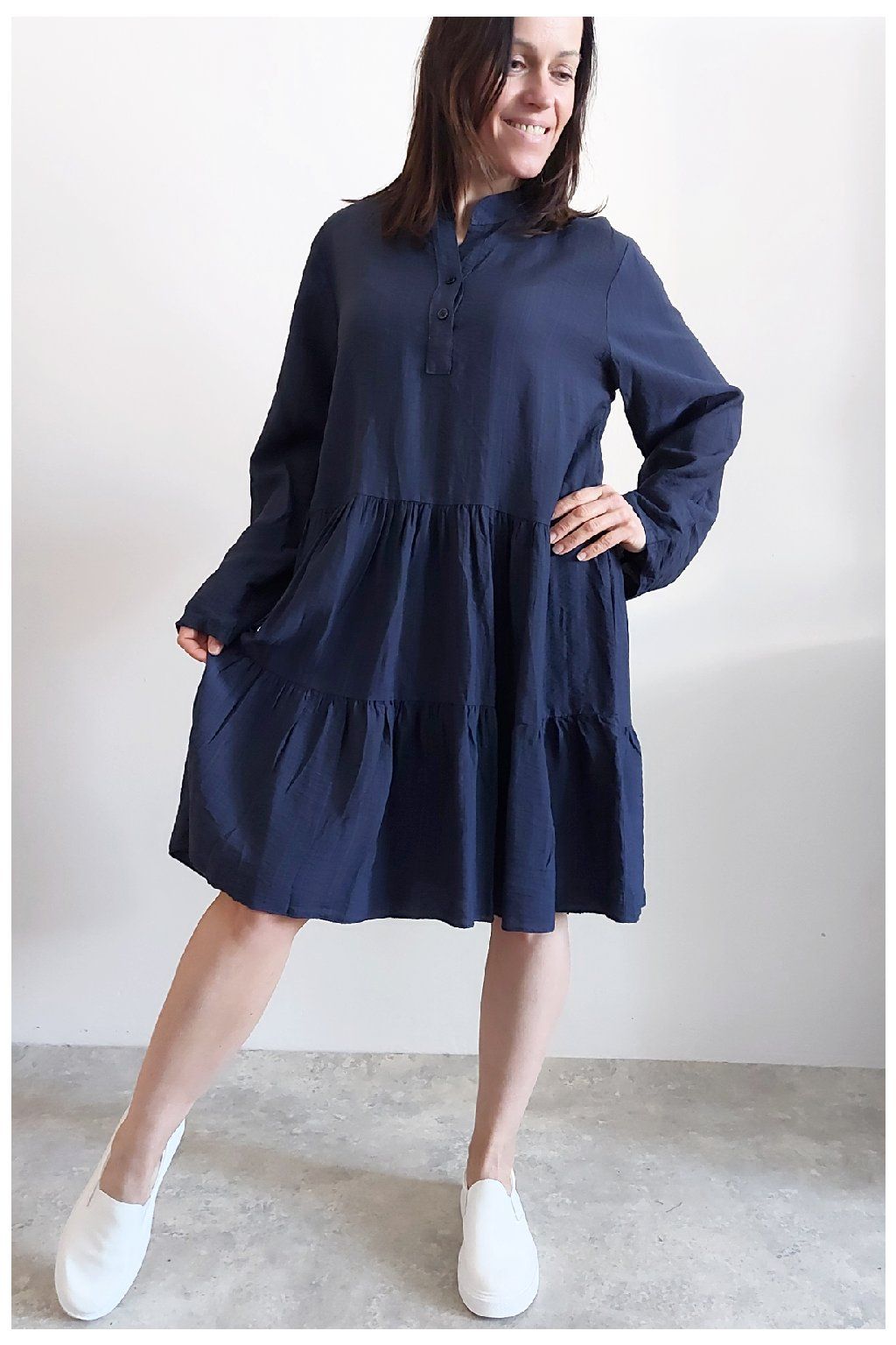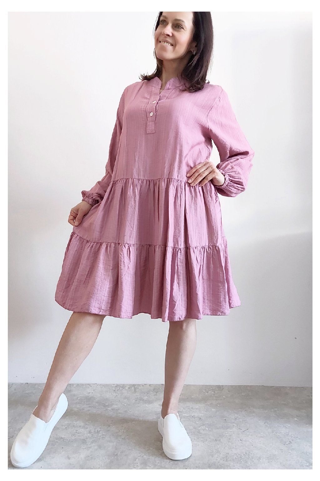 Šaty s kanýry. Výstřih na knoflíčky. Rukávy dlouhé - u barvy khaki a starorůžové jsou ukončené do gumky, u tmavě modré klasicky rovné. Bez kapes. Oversize střih-volný, vhodné tedy i pro větší velikosti. Materiál vzdušný, příjemný ale není pružný. Foceno na vel. XS, výška 156cm.