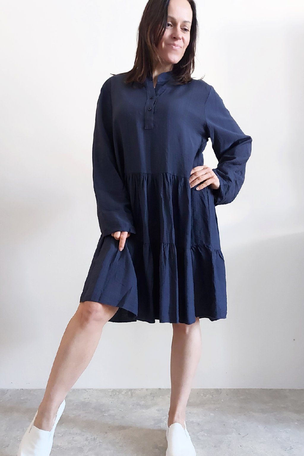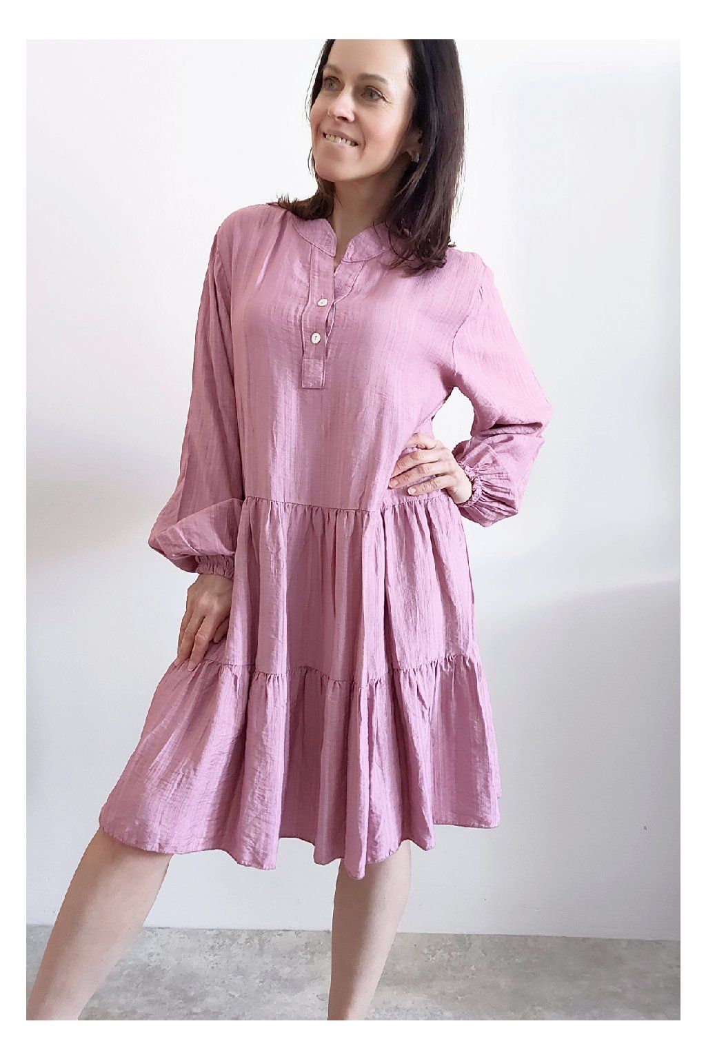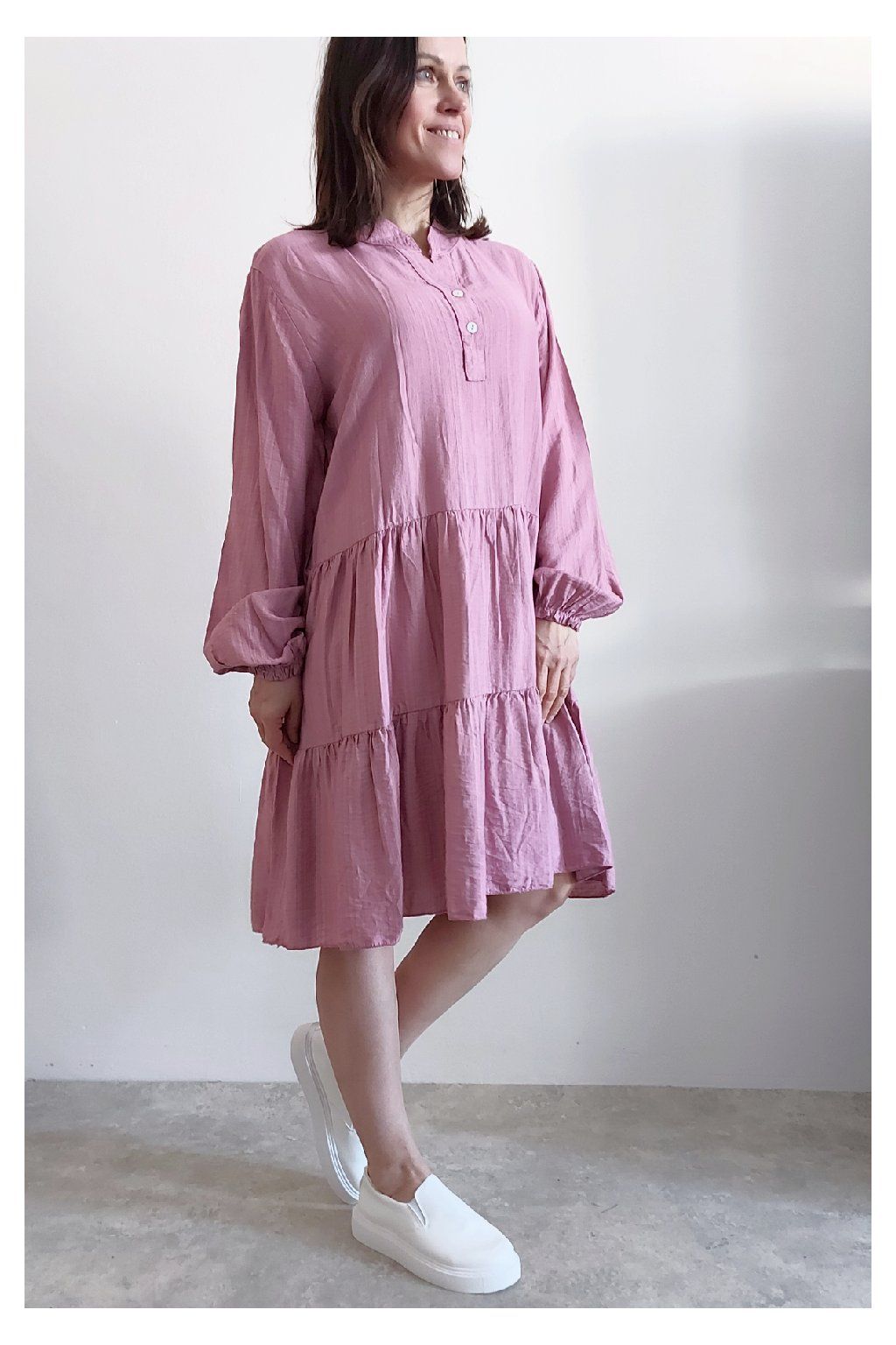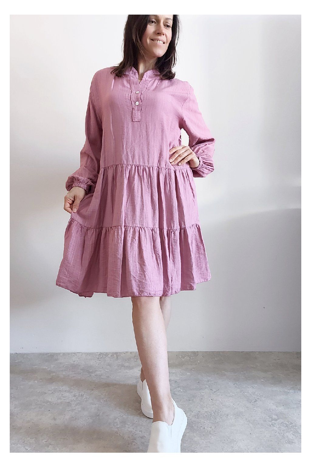 Šaty s kanýry. Výstřih na knoflíčky. Rukávy dlouhé - u barvy khaki a starorůžové jsou ukončené do gumky, u tmavě modré klasicky rovné. Bez kapes. Oversize střih-volný, vhodné tedy i pro větší velikosti. Materiál vzdušný, příjemný ale není pružný. Foceno na vel. XS, výška 156cm.