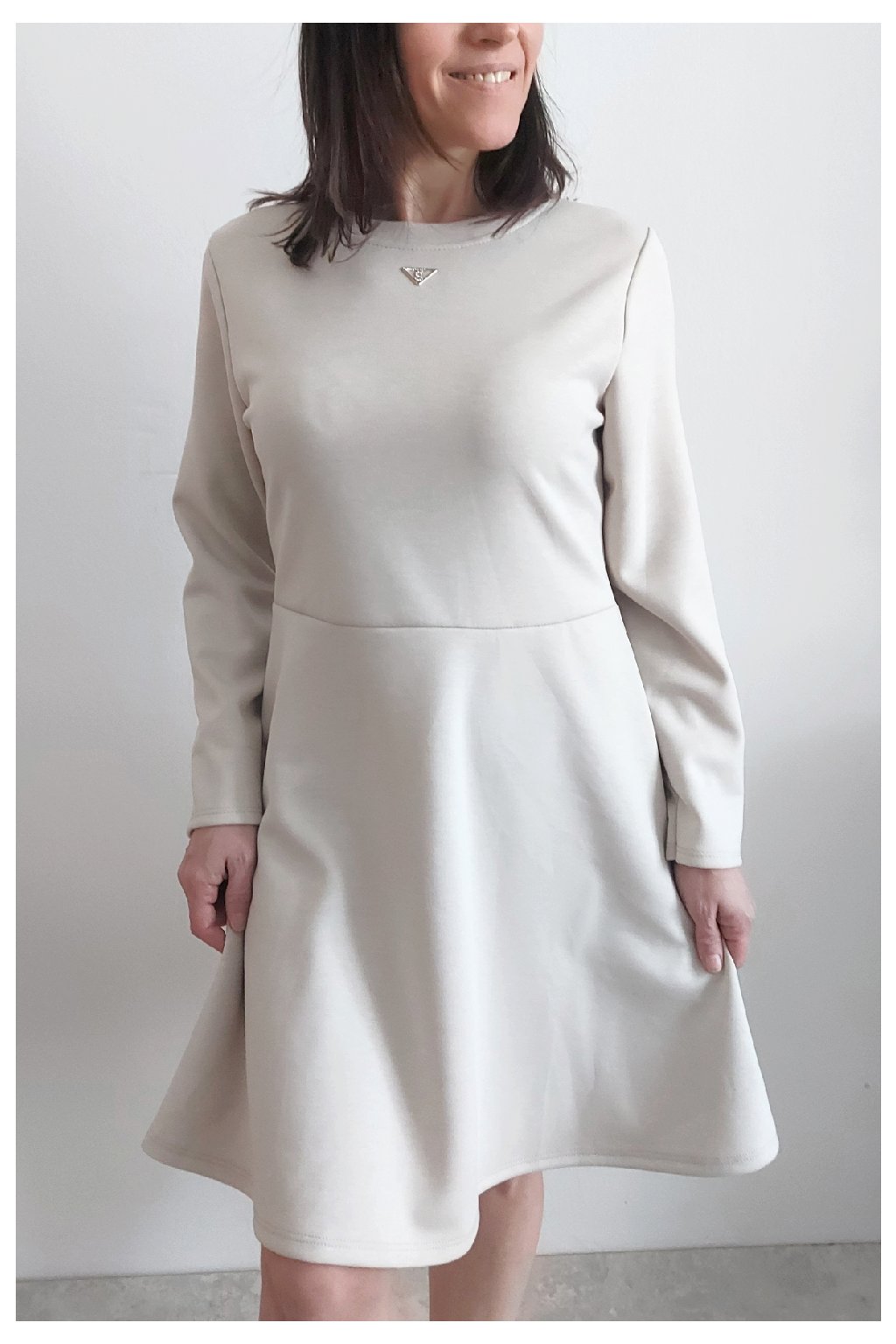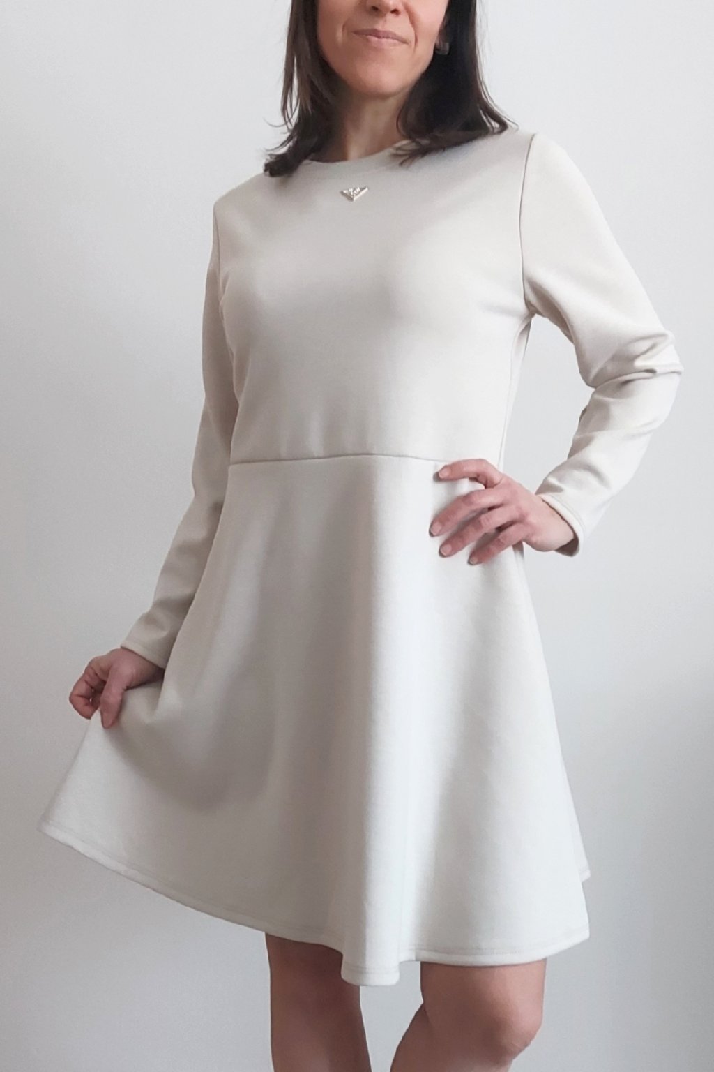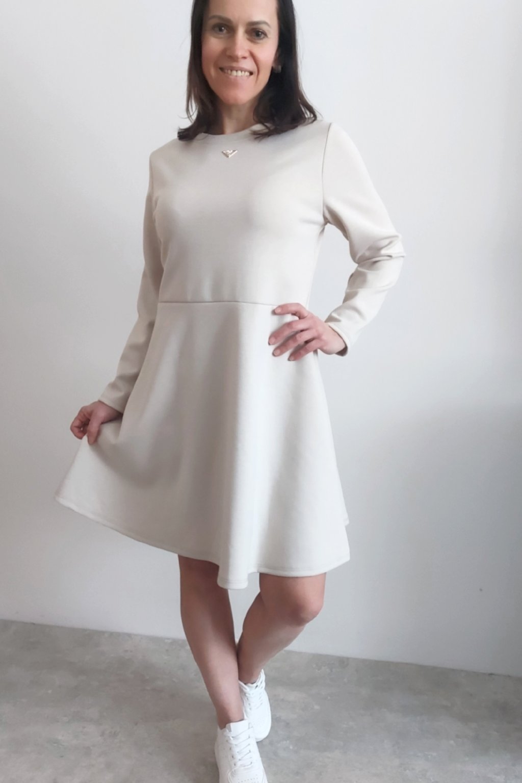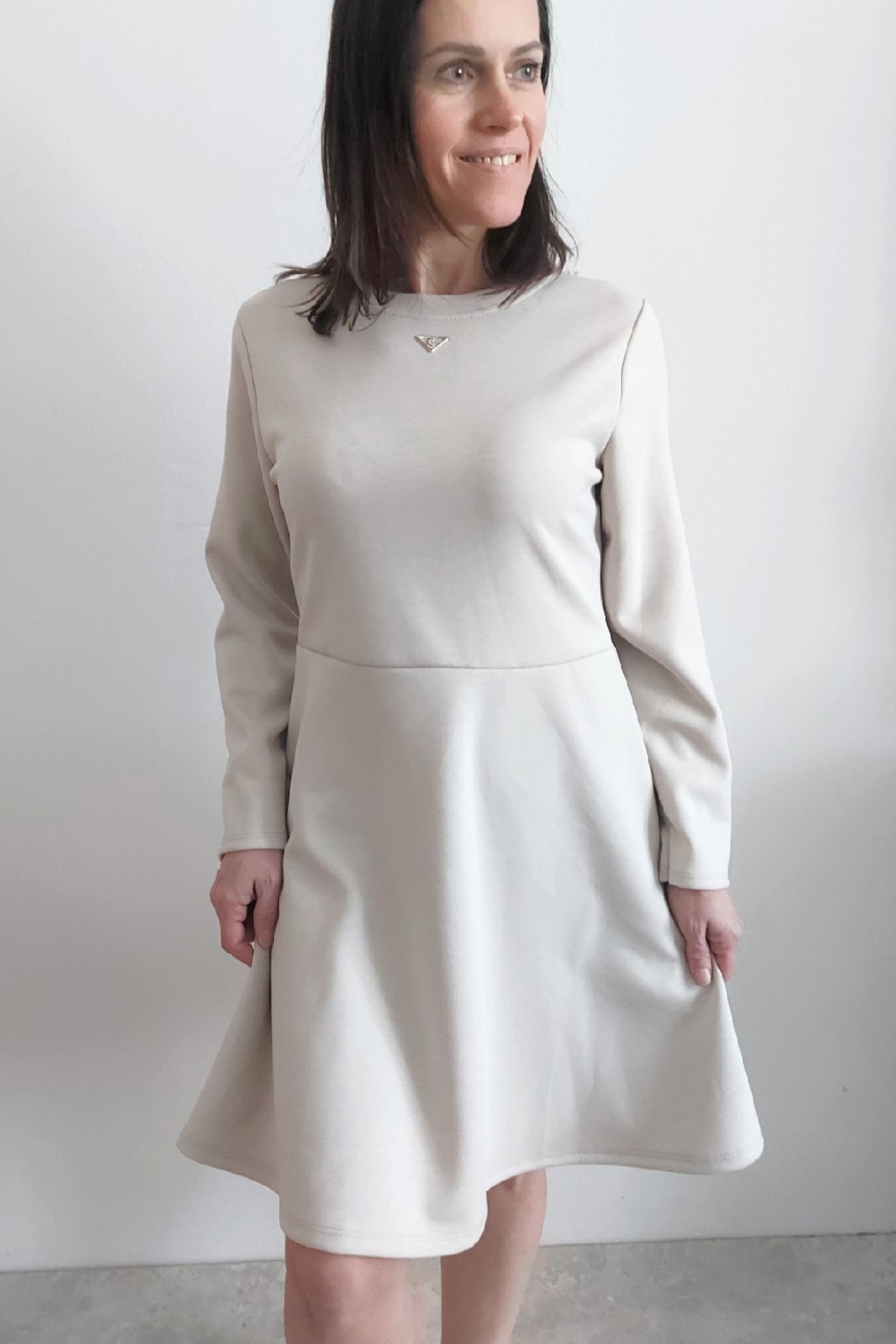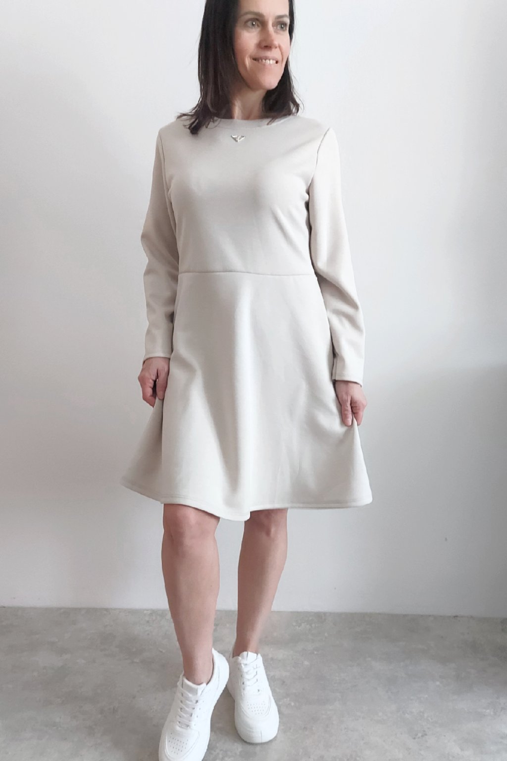 Parádní šaty bez kapes. Vpředu menší ozdůbka zdobená kamínky. Bez kapes - oblékání přes hlavu. Rukávy jsou 7/8. V pase střižené - sukně je kolová. Materiál prémiový máslový - hebký, jemný, drží tvar, hodně elastický. Foceno na vel. XS, výška 156cm.