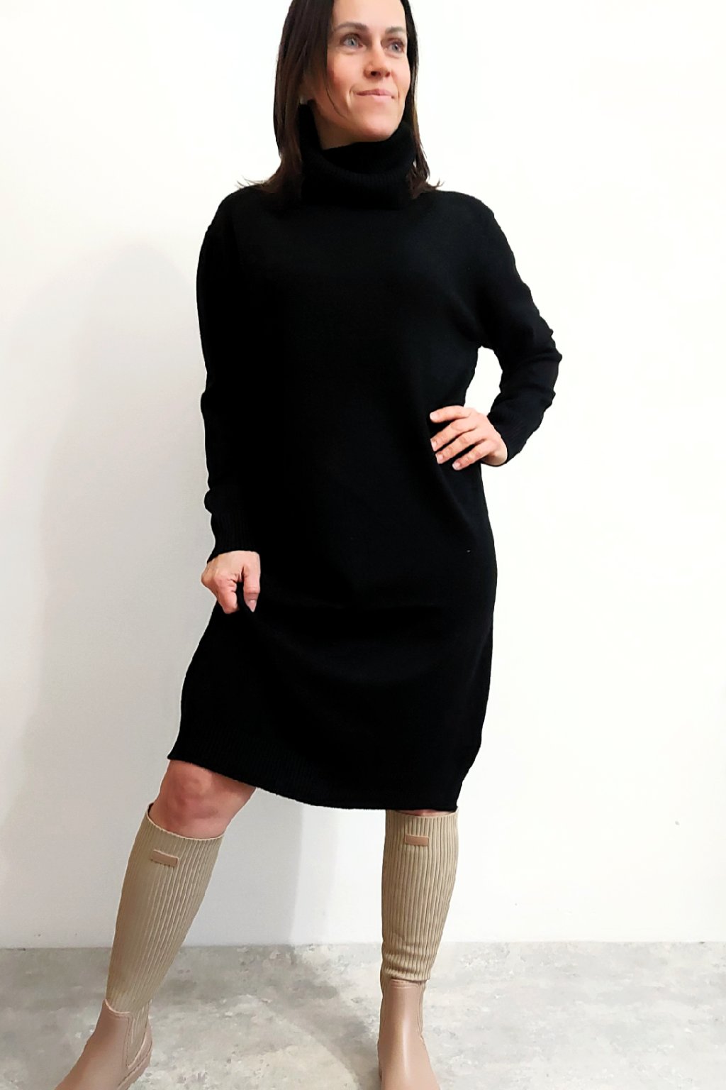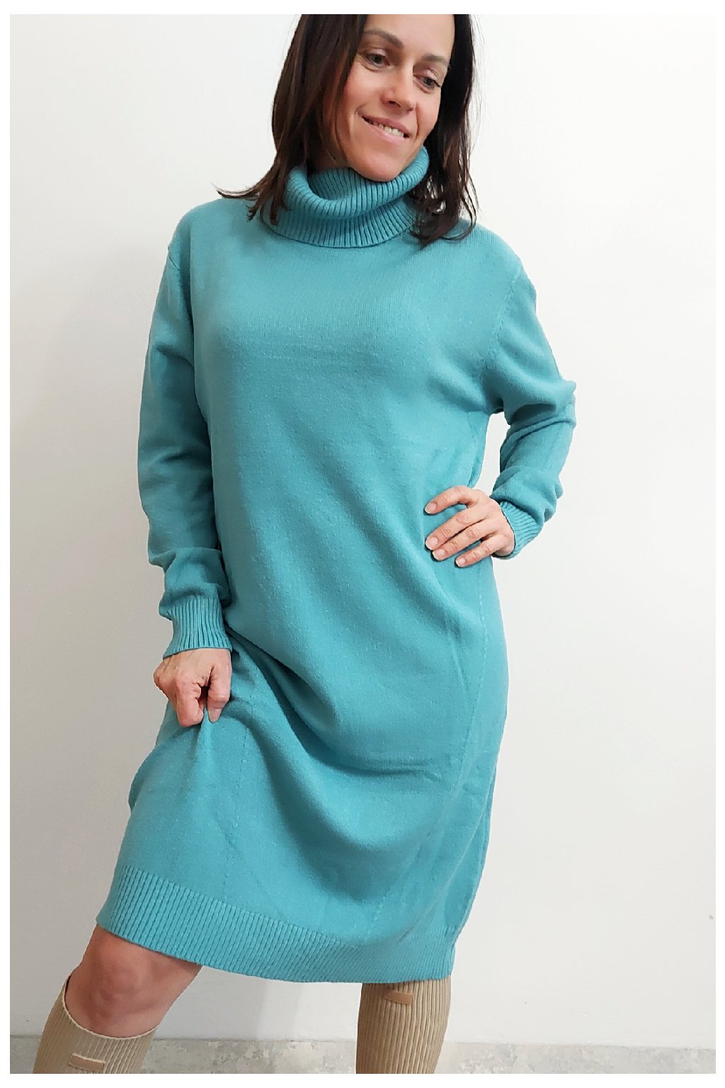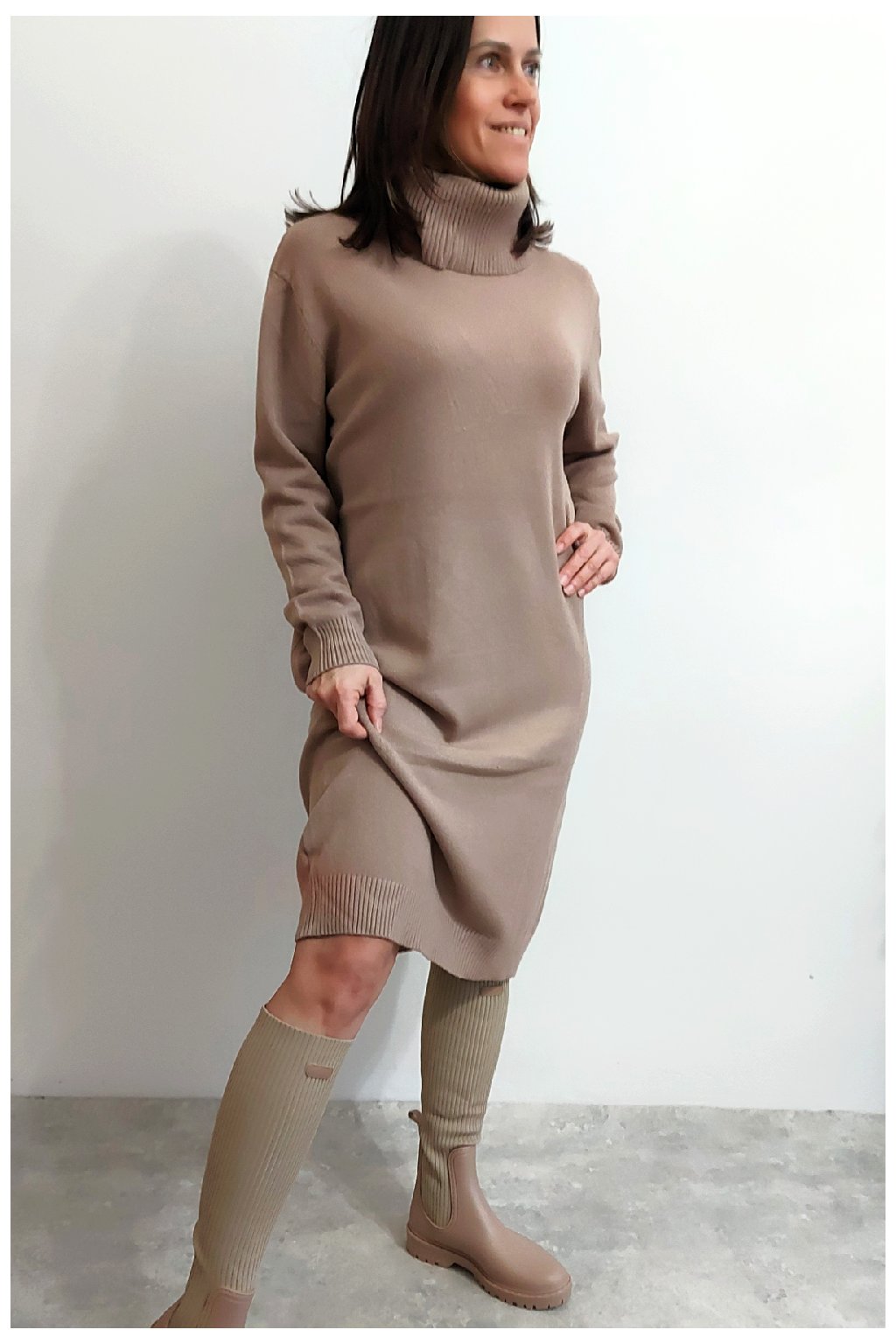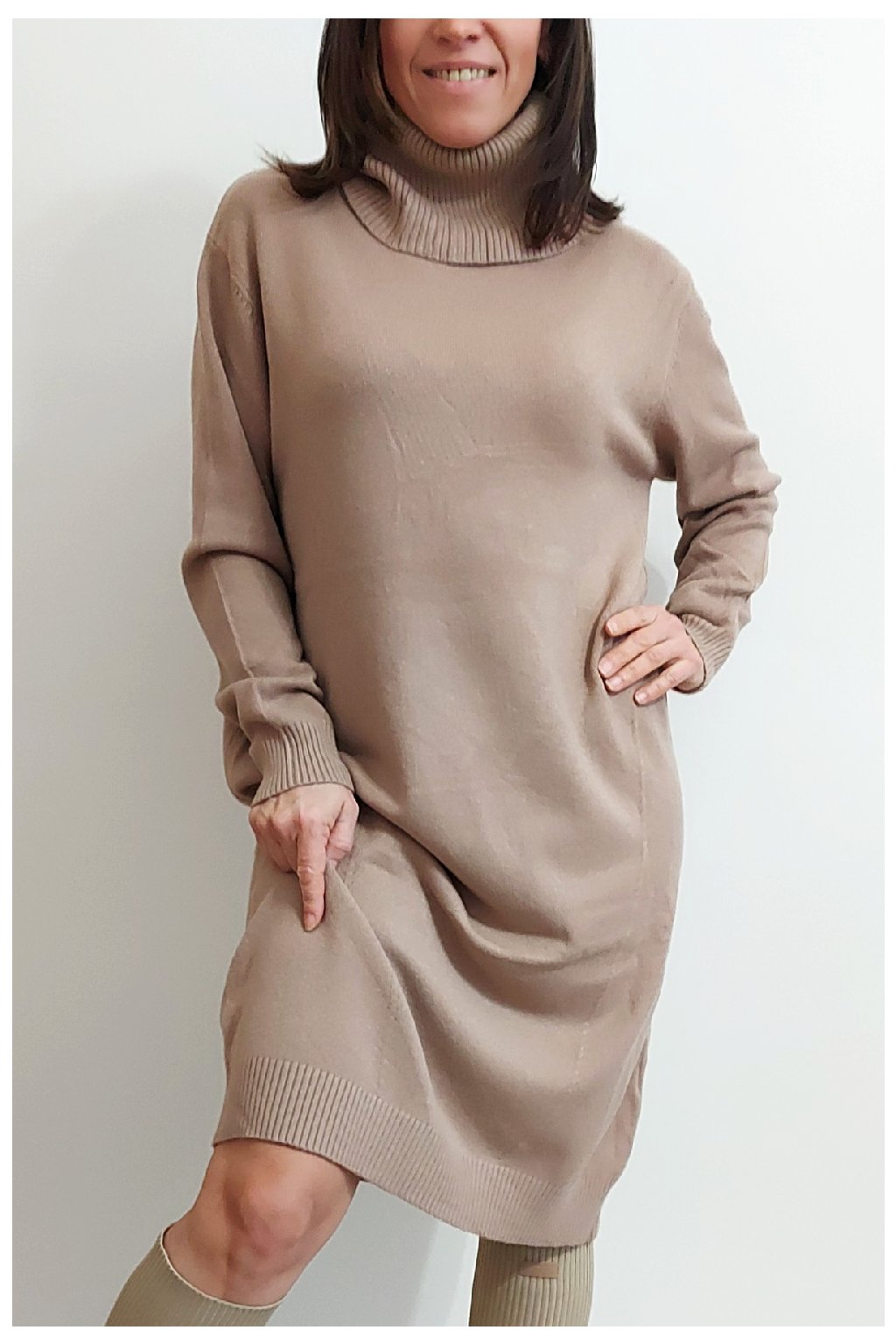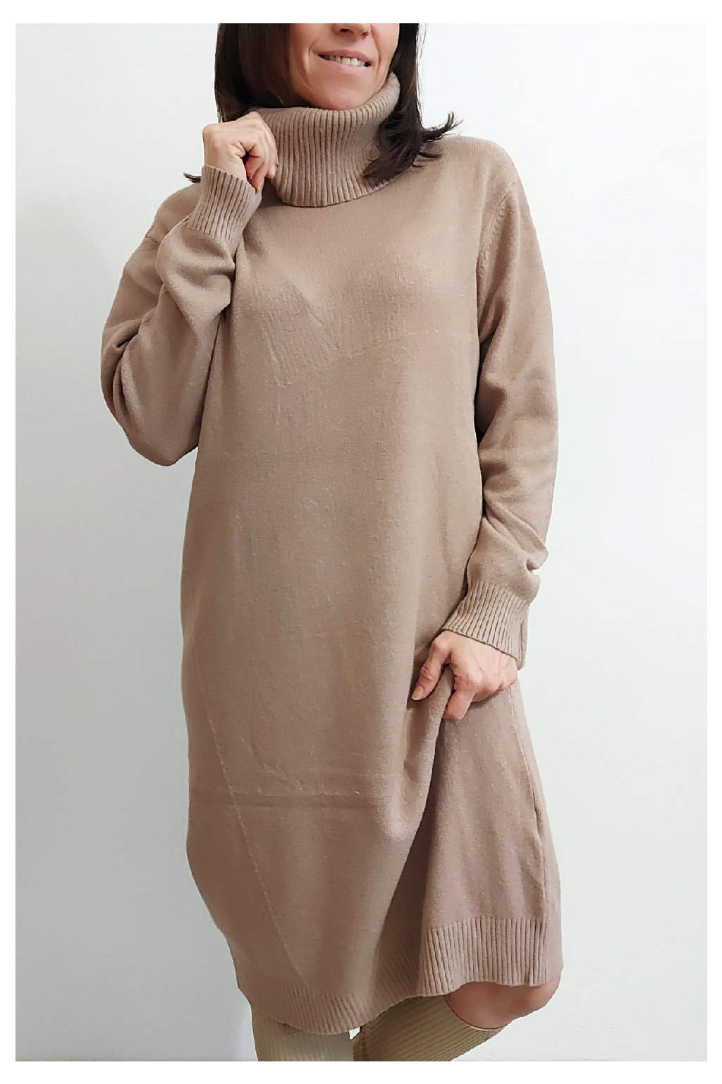 Úpletové šaty s velkým rolákem. Oblékání přes hlavu, bez kapes. Rukávy dlouhé. Vysoce kvalitní, hebký a nekousavý materiál, který je i velmi pružný. Vel. L/XL focena na vel. XS, výška 156cm a vel. XXL/XXXL focena na vel. 2XL (prsa 116cm, pas 110cm, boky 120cm), výška 165cm.