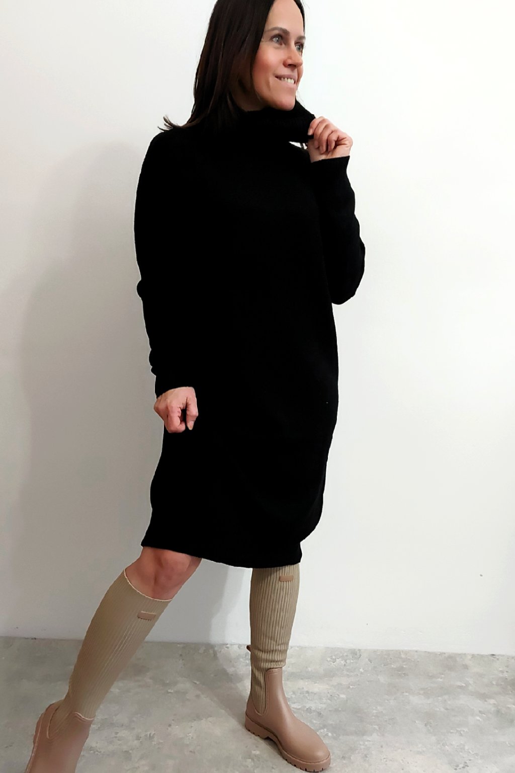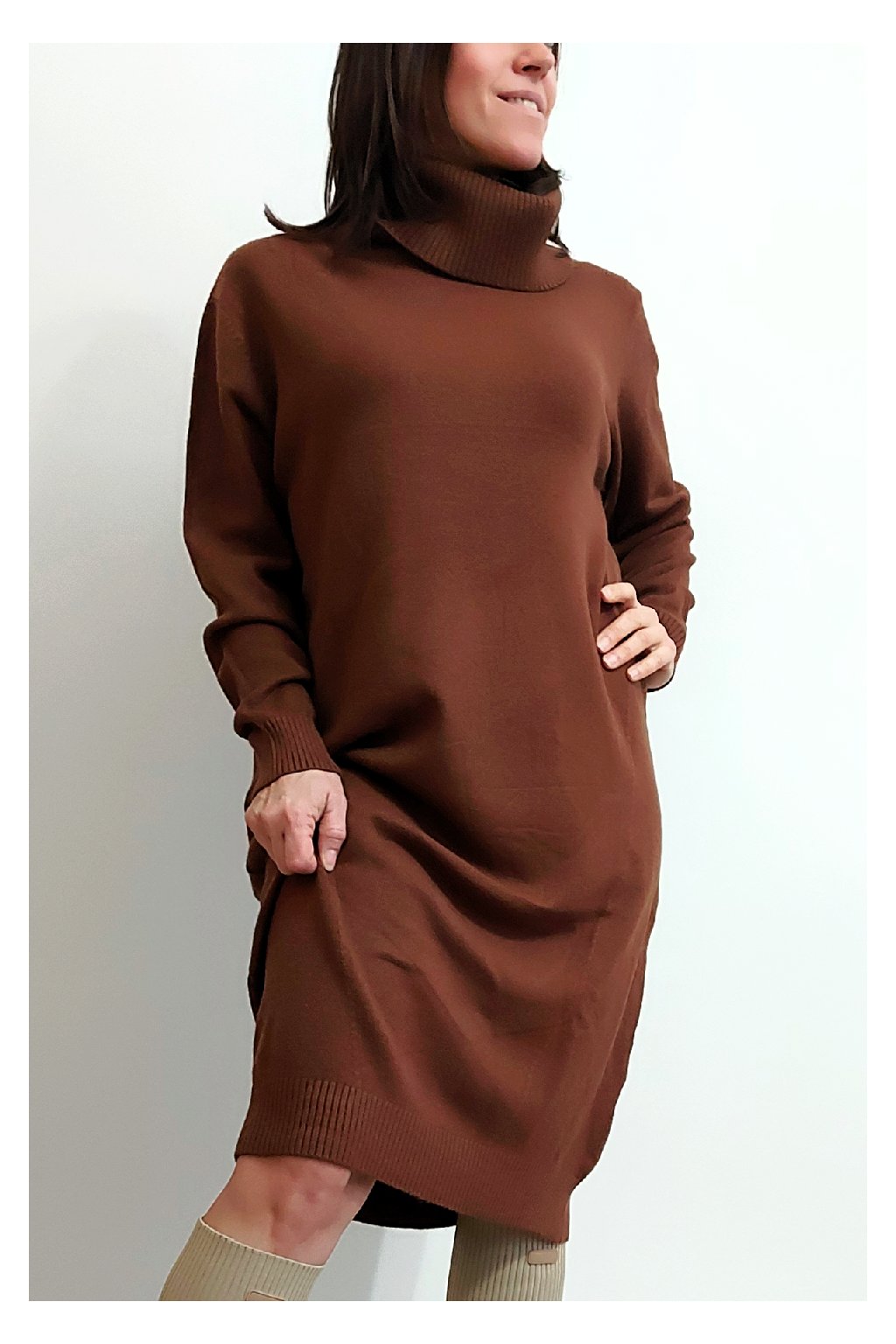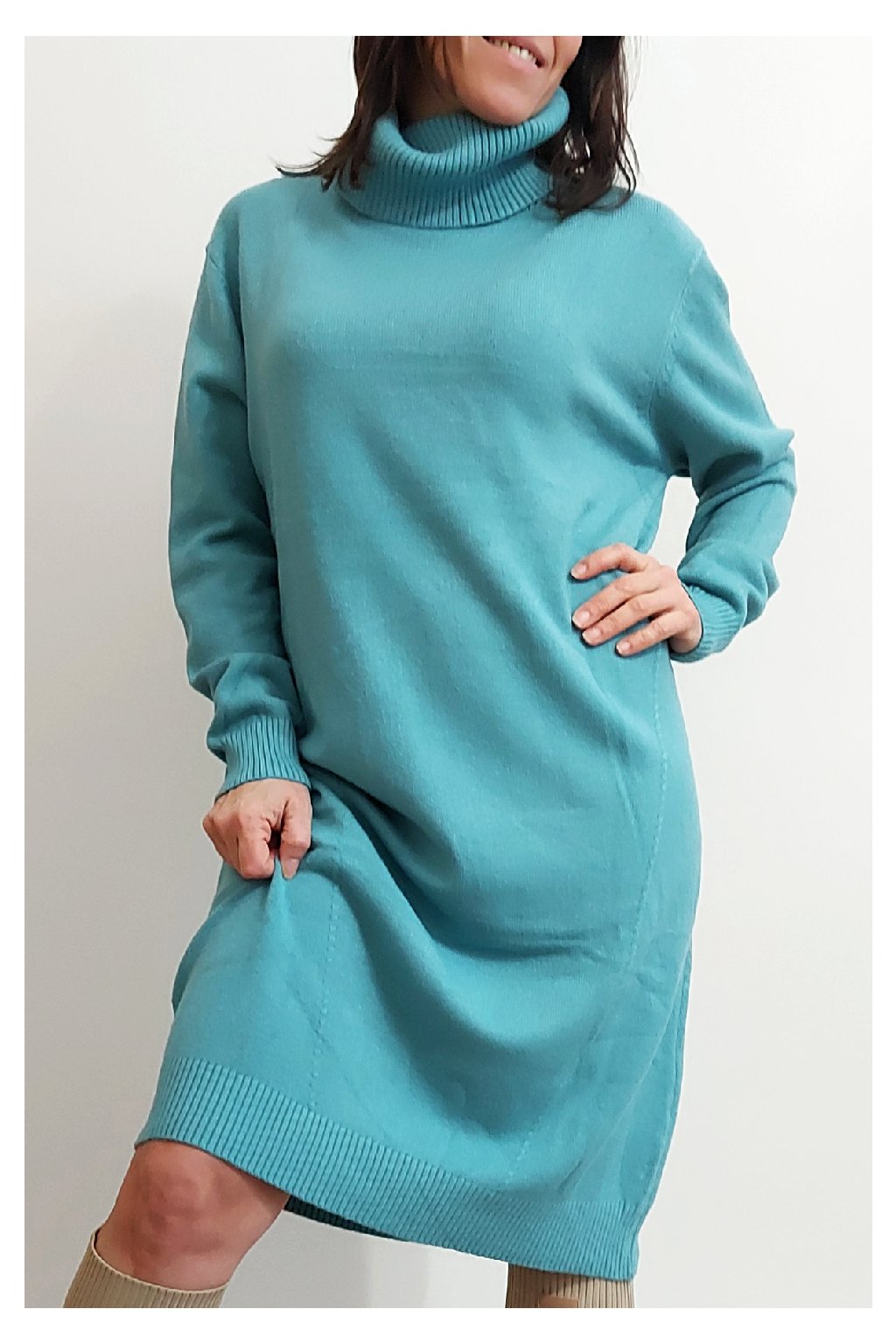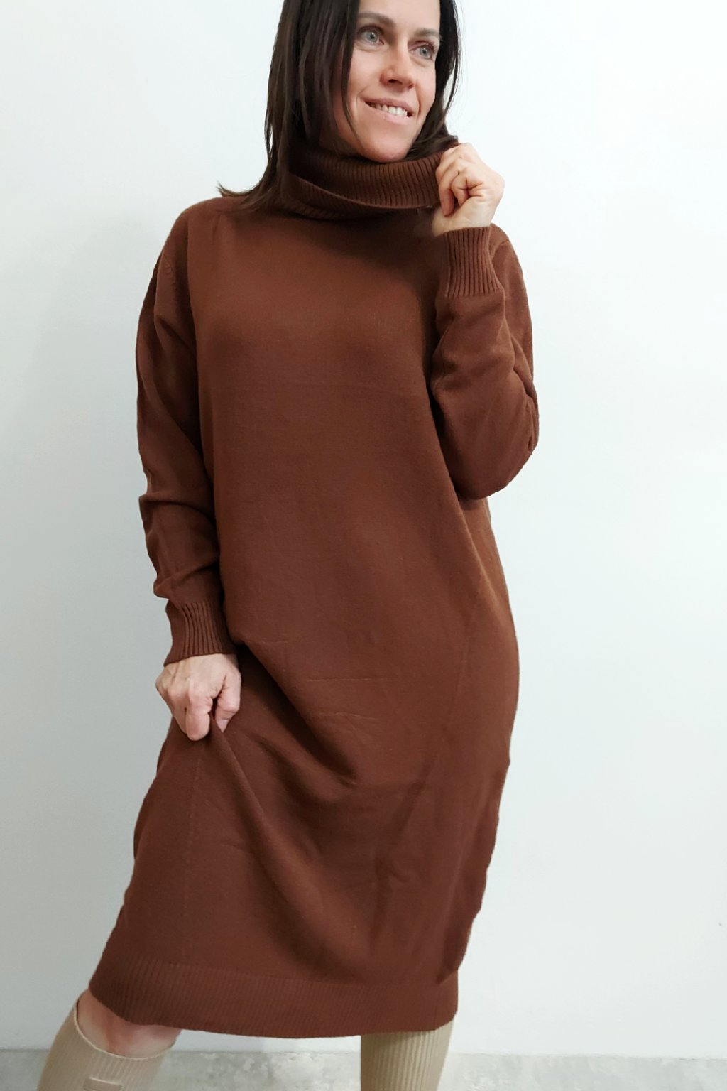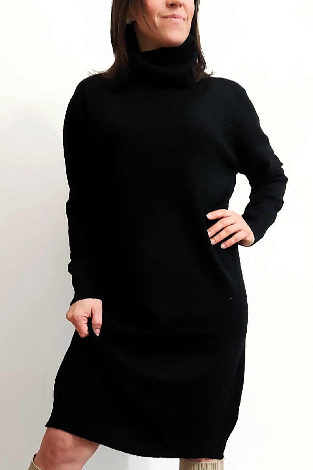 Úpletové šaty s velkým rolákem. Oblékání přes hlavu, bez kapes. Rukávy dlouhé. Vysoce kvalitní, hebký a nekousavý materiál, který je i velmi pružný. Vel. L/XL focena na vel. XS, výška 156cm a vel. XXL/XXXL focena na vel. 2XL (prsa 116cm, pas 110cm, boky 120cm), výška 165cm.