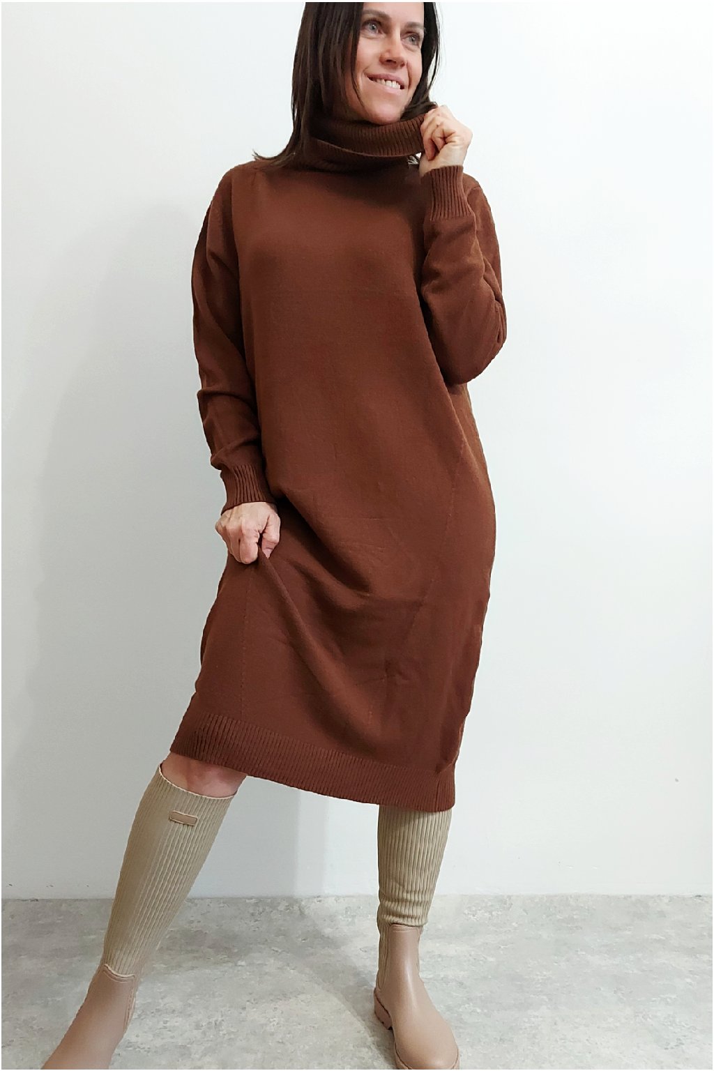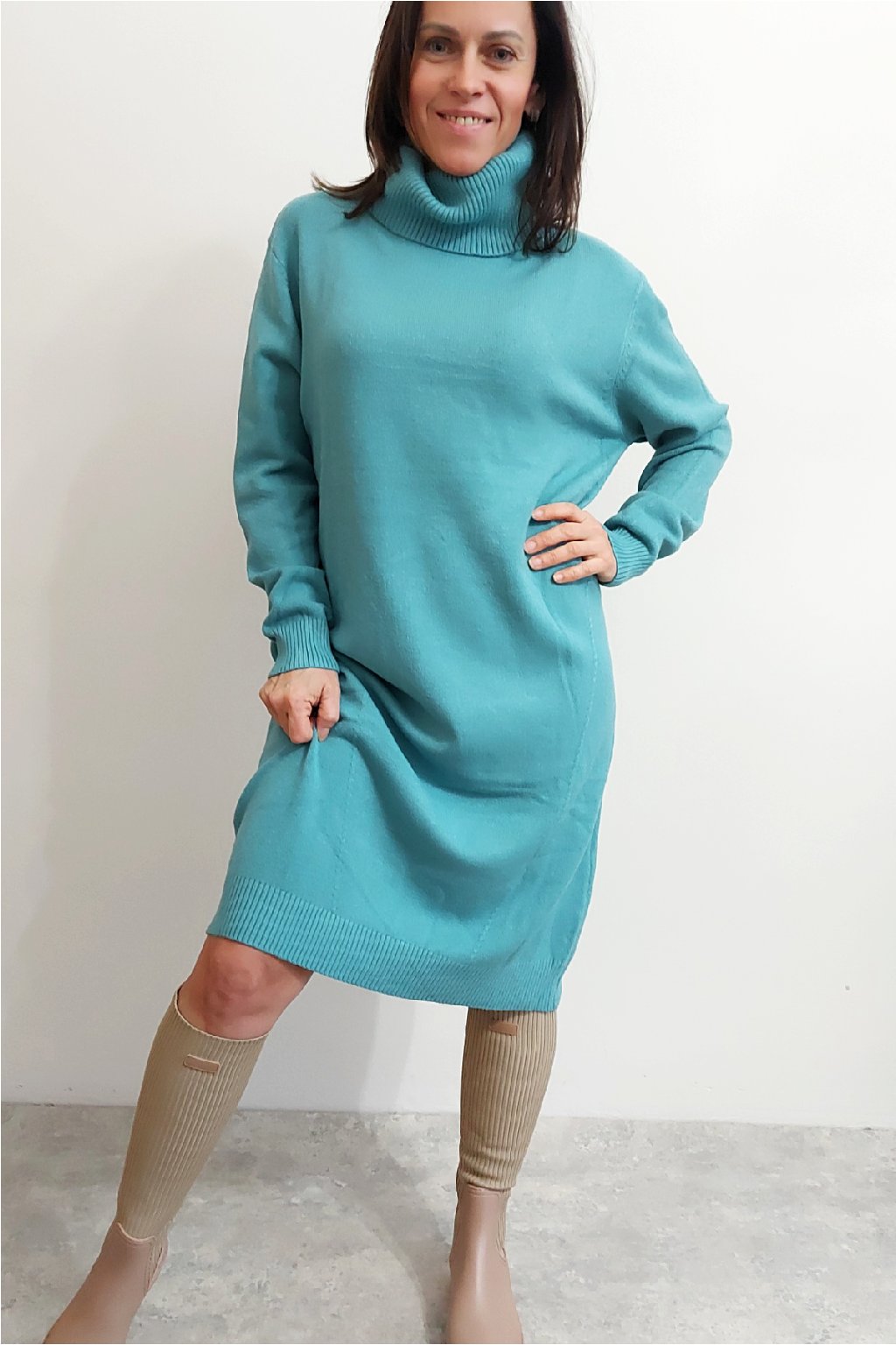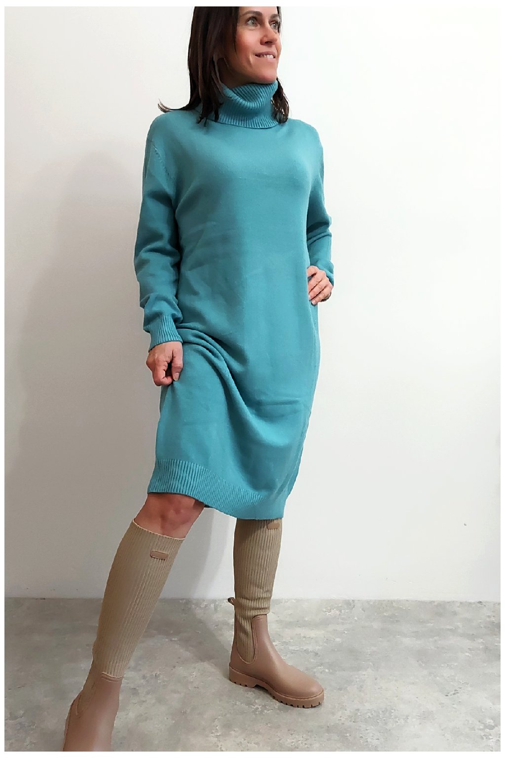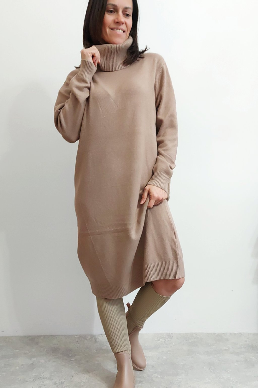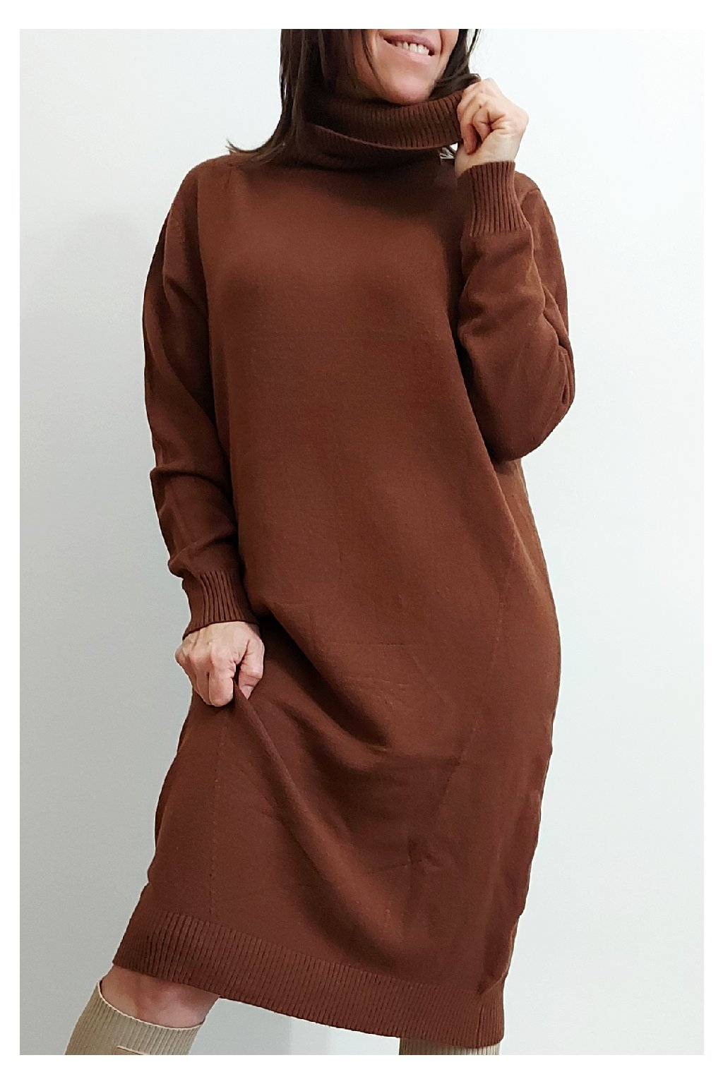 Úpletové šaty s velkým rolákem. Oblékání přes hlavu, bez kapes. Rukávy dlouhé. Vysoce kvalitní, hebký a nekousavý materiál, který je i velmi pružný. Vel. L/XL focena na vel. XS, výška 156cm a vel. XXL/XXXL focena na vel. 2XL (prsa 116cm, pas 110cm, boky 120cm), výška 165cm.