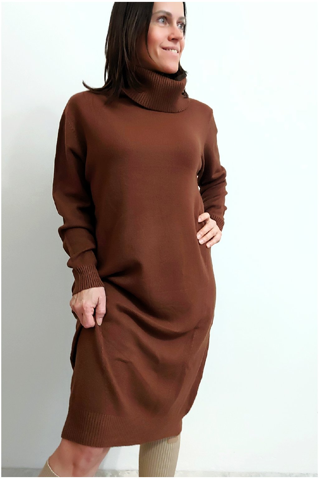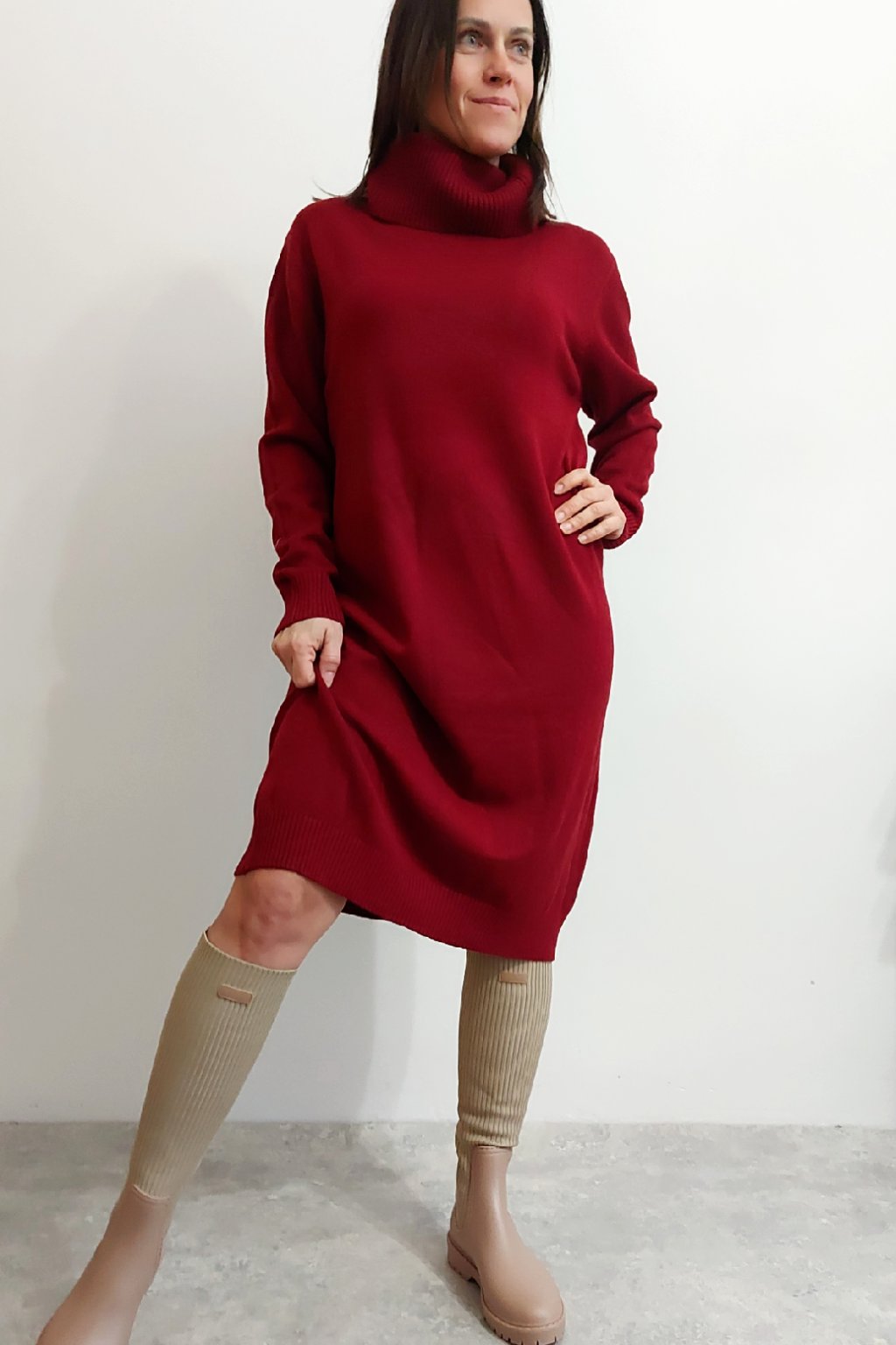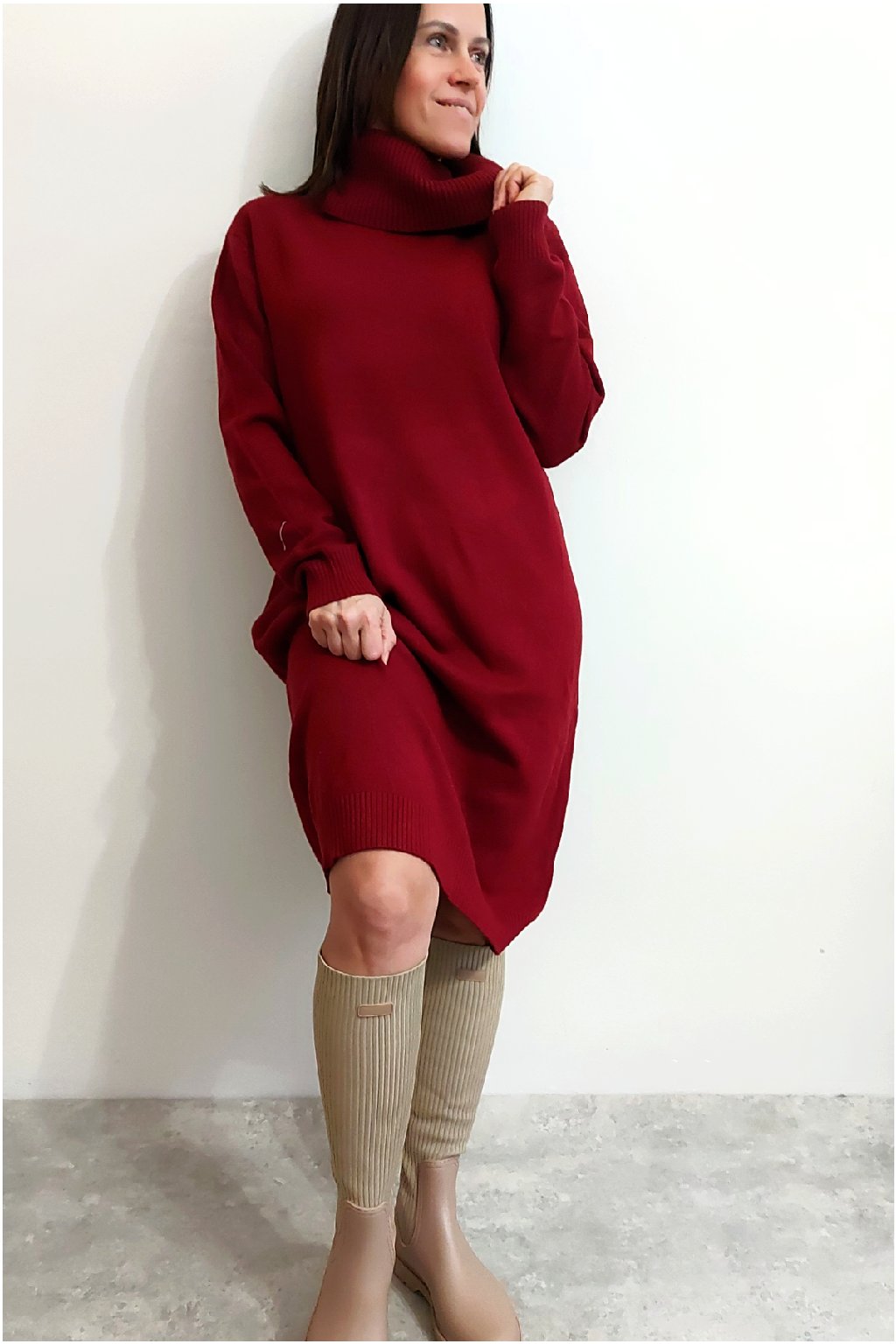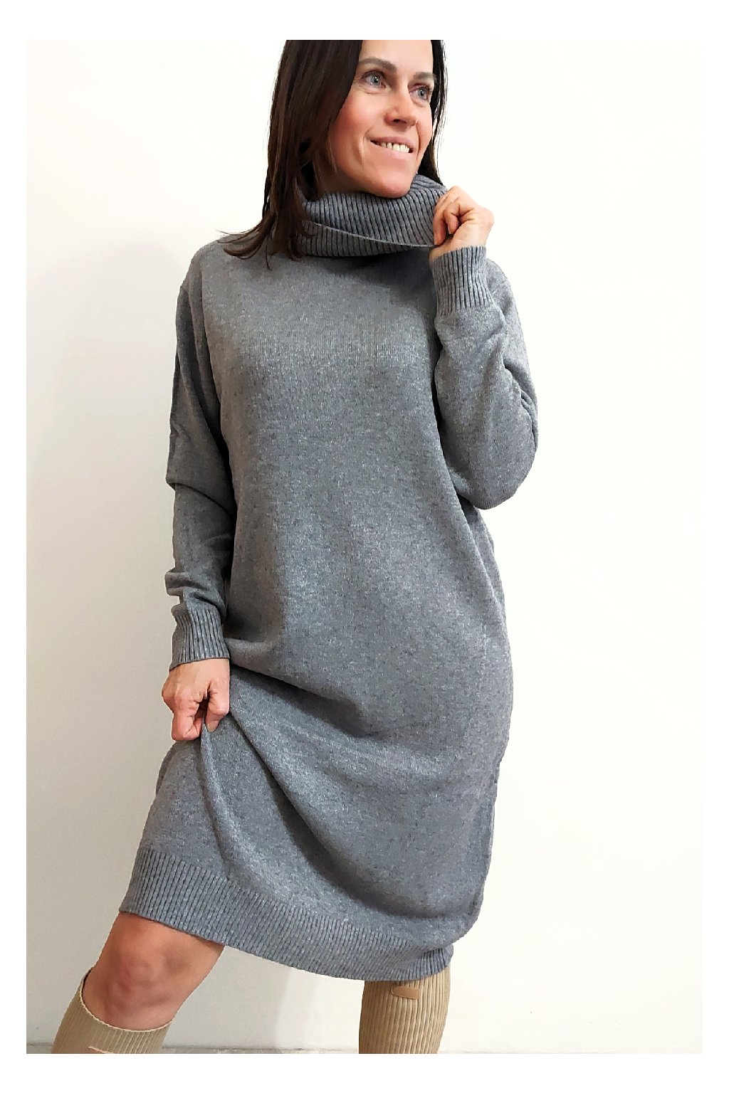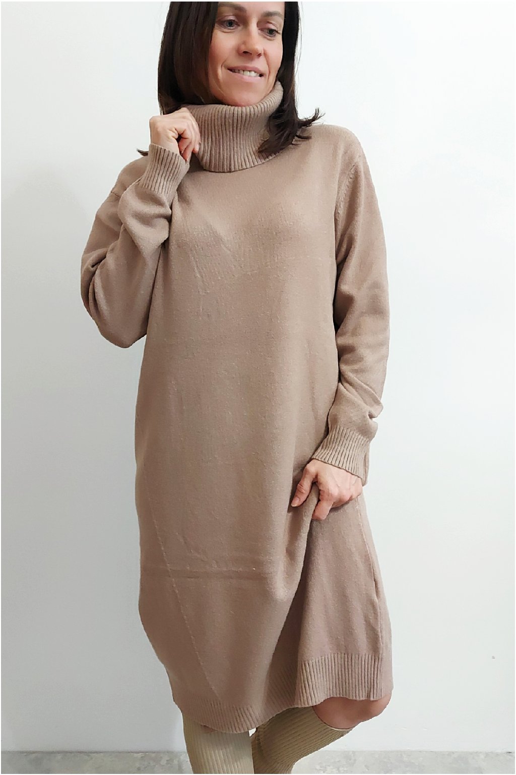 Úpletové šaty s velkým rolákem. Oblékání přes hlavu, bez kapes. Rukávy dlouhé. Vysoce kvalitní, hebký a nekousavý materiál, který je i velmi pružný. Vel. L/XL focena na vel. XS, výška 156cm a vel. XXL/XXXL focena na vel. 2XL (prsa 116cm, pas 110cm, boky 120cm), výška 165cm.