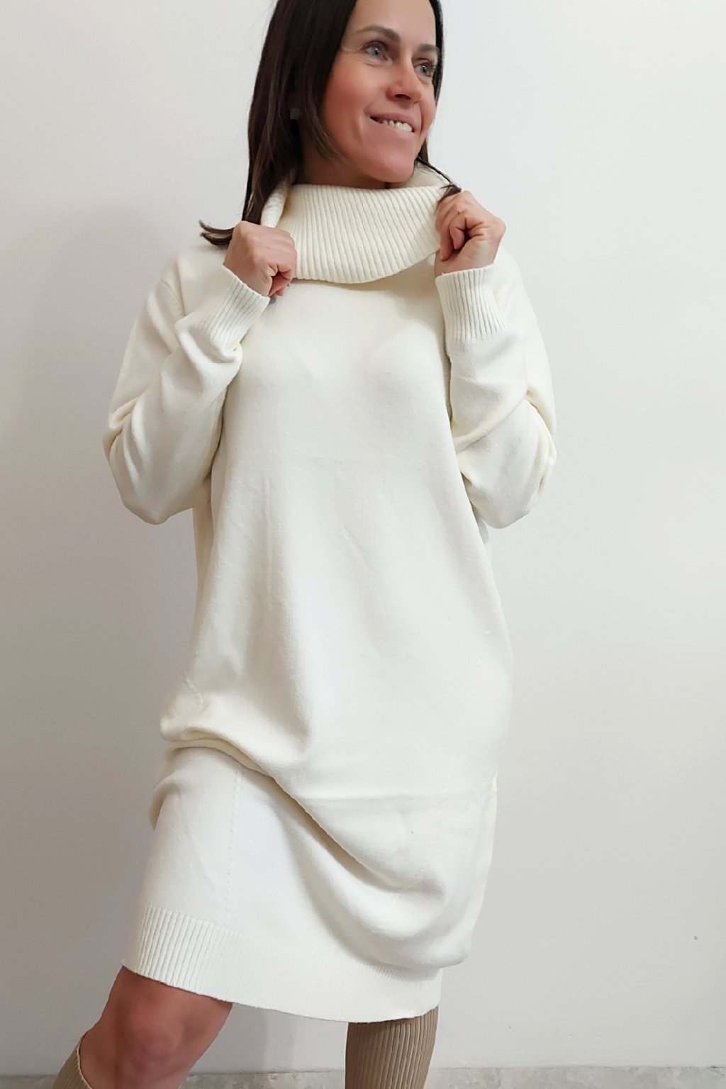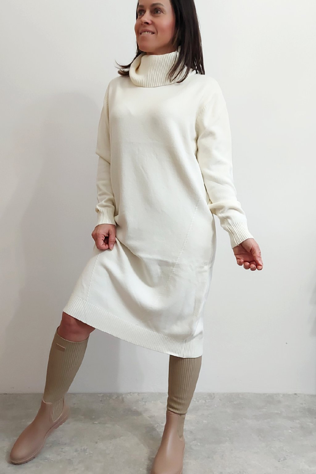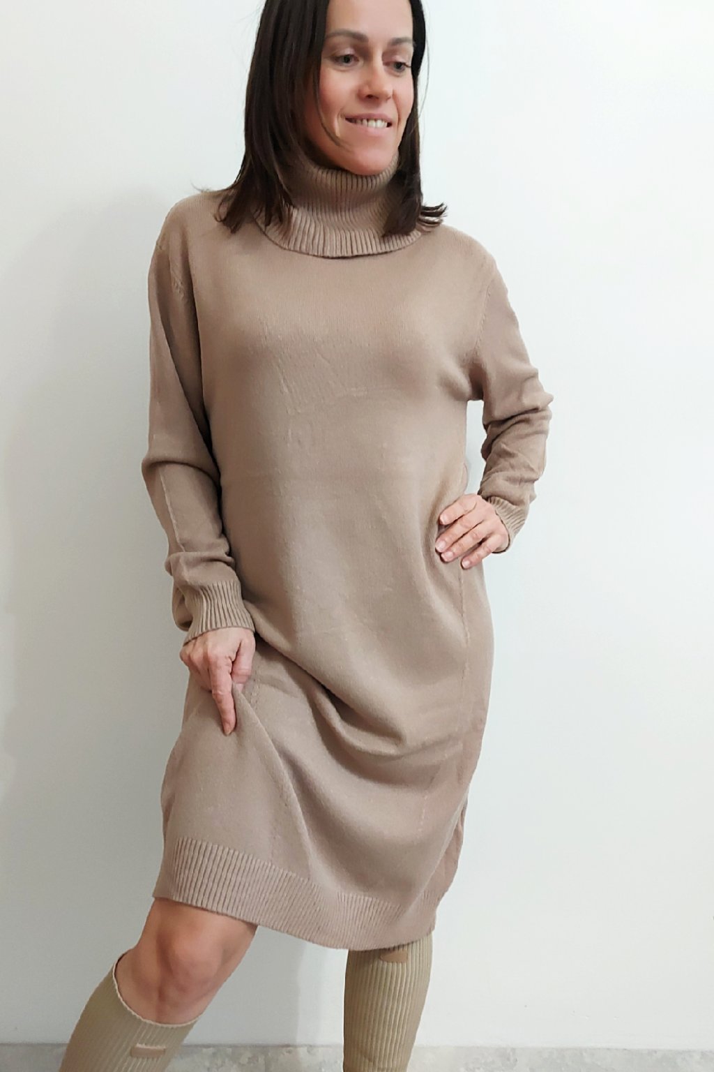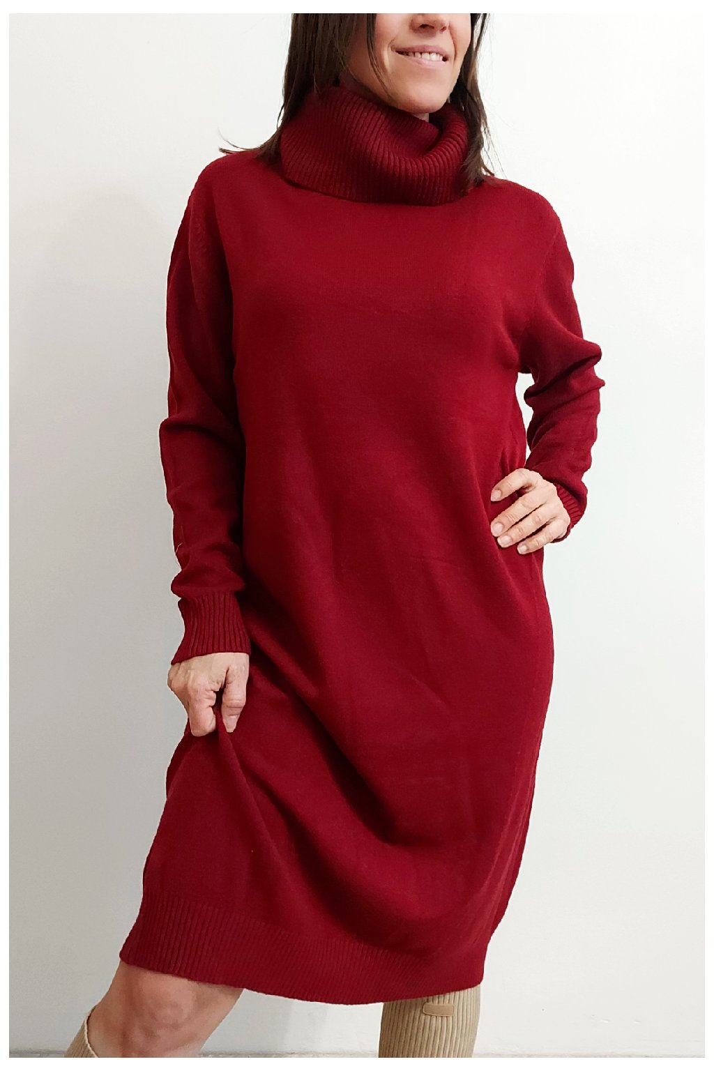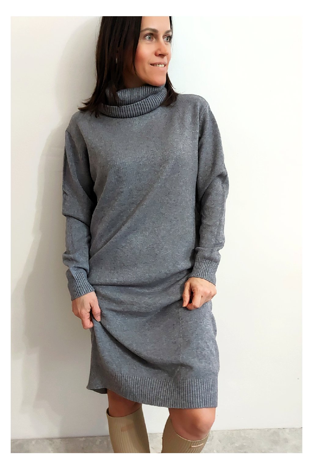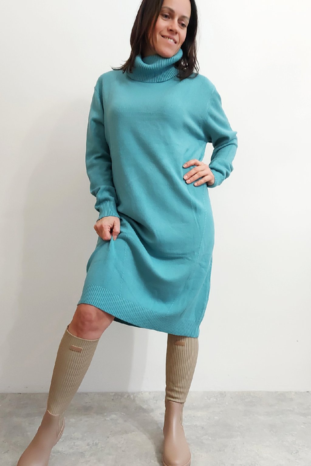 Úpletové šaty s velkým rolákem. Oblékání přes hlavu, bez kapes. Rukávy dlouhé. Vysoce kvalitní, hebký a nekousavý materiál, který je i velmi pružný. Vel. L/XL focena na vel. XS, výška 156cm a vel. XXL/XXXL focena na vel. 2XL (prsa 116cm, pas 110cm, boky 120cm), výška 165cm.