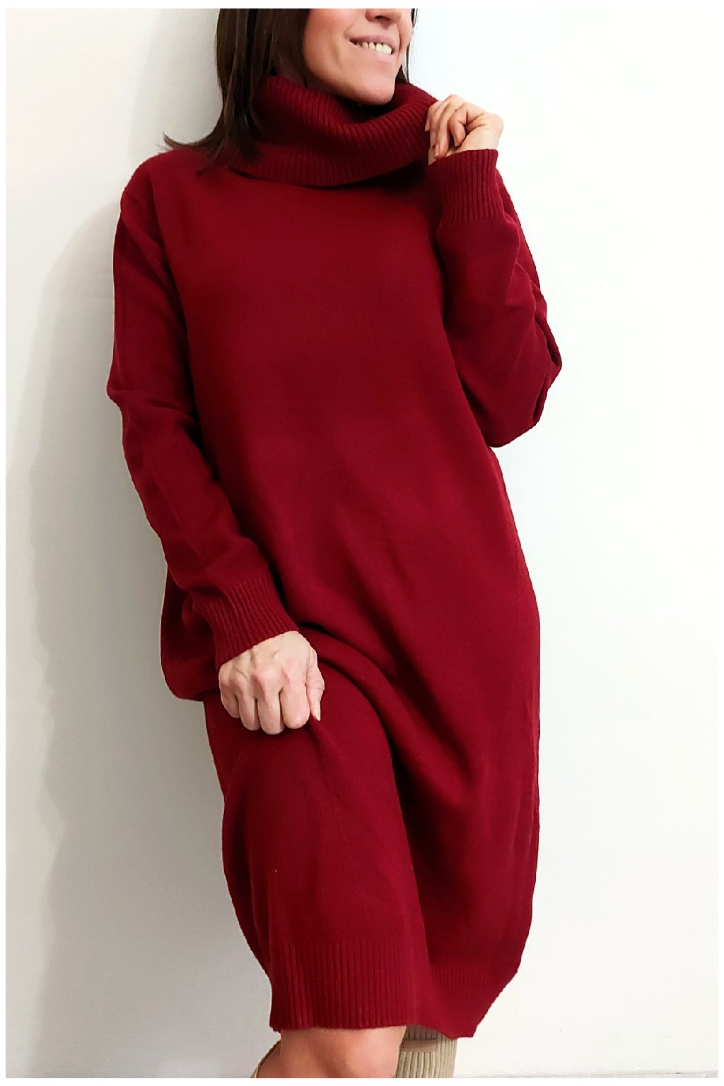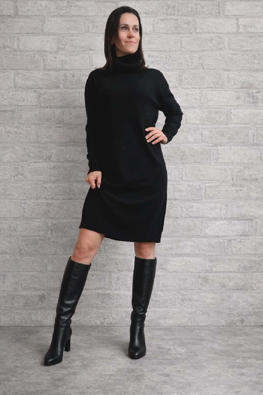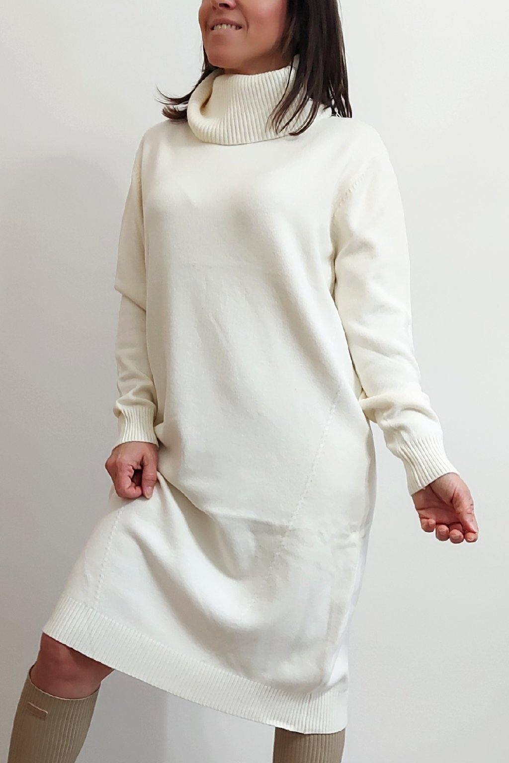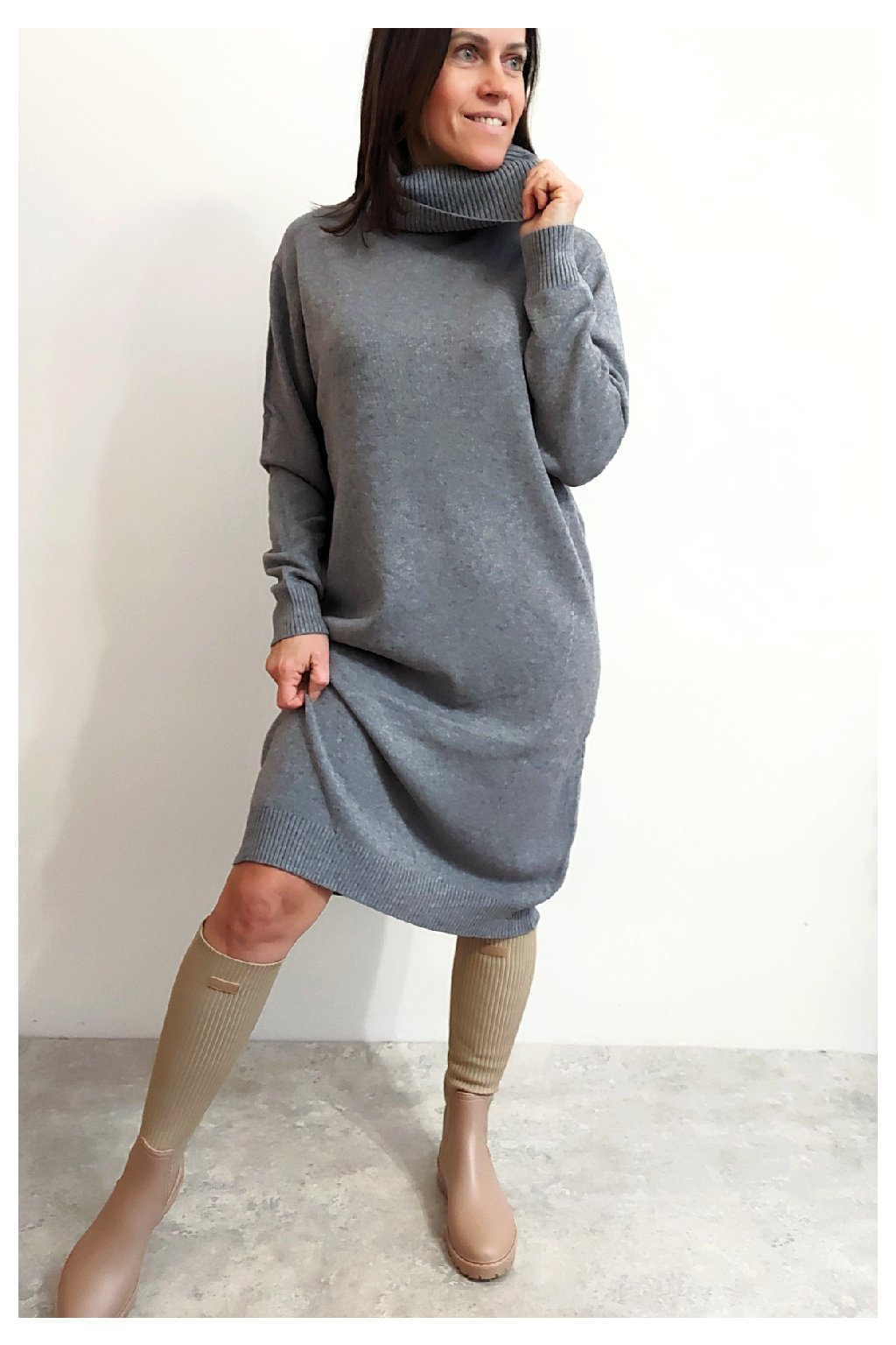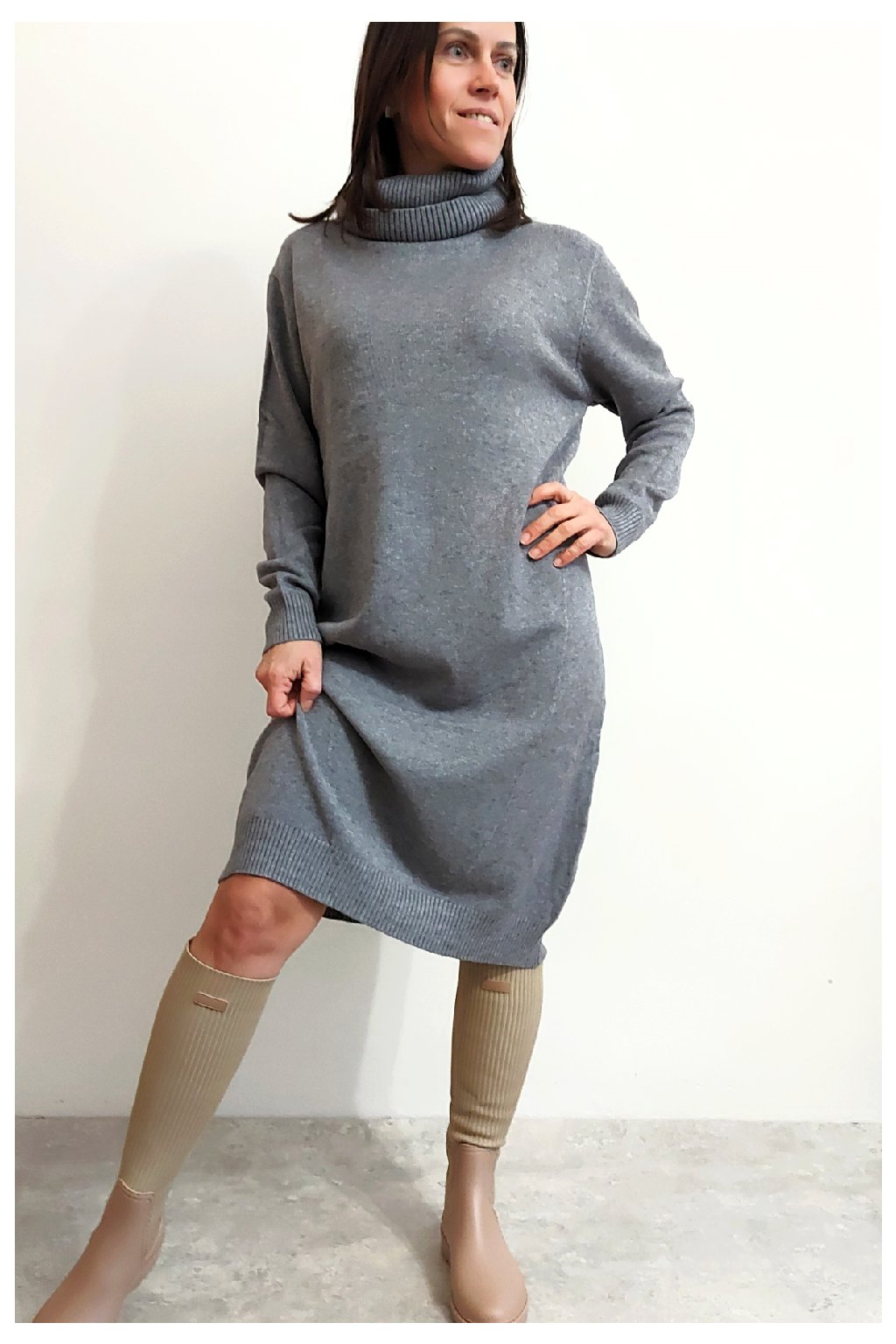 Úpletové šaty s velkým rolákem. Oblékání přes hlavu, bez kapes. Rukávy dlouhé. Vysoce kvalitní, hebký a nekousavý materiál, který je i velmi pružný. Vel. L/XL focena na vel. XS, výška 156cm a vel. XXL/XXXL focena na vel. 2XL (prsa 116cm, pas 110cm, boky 120cm), výška 165cm.