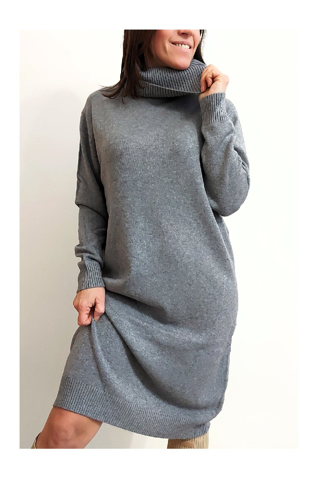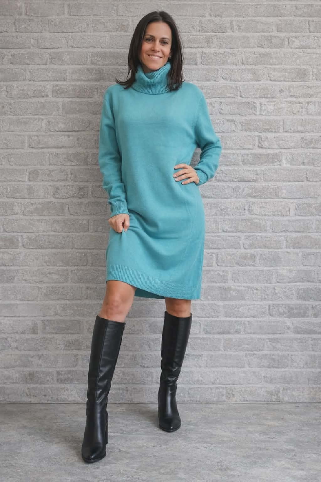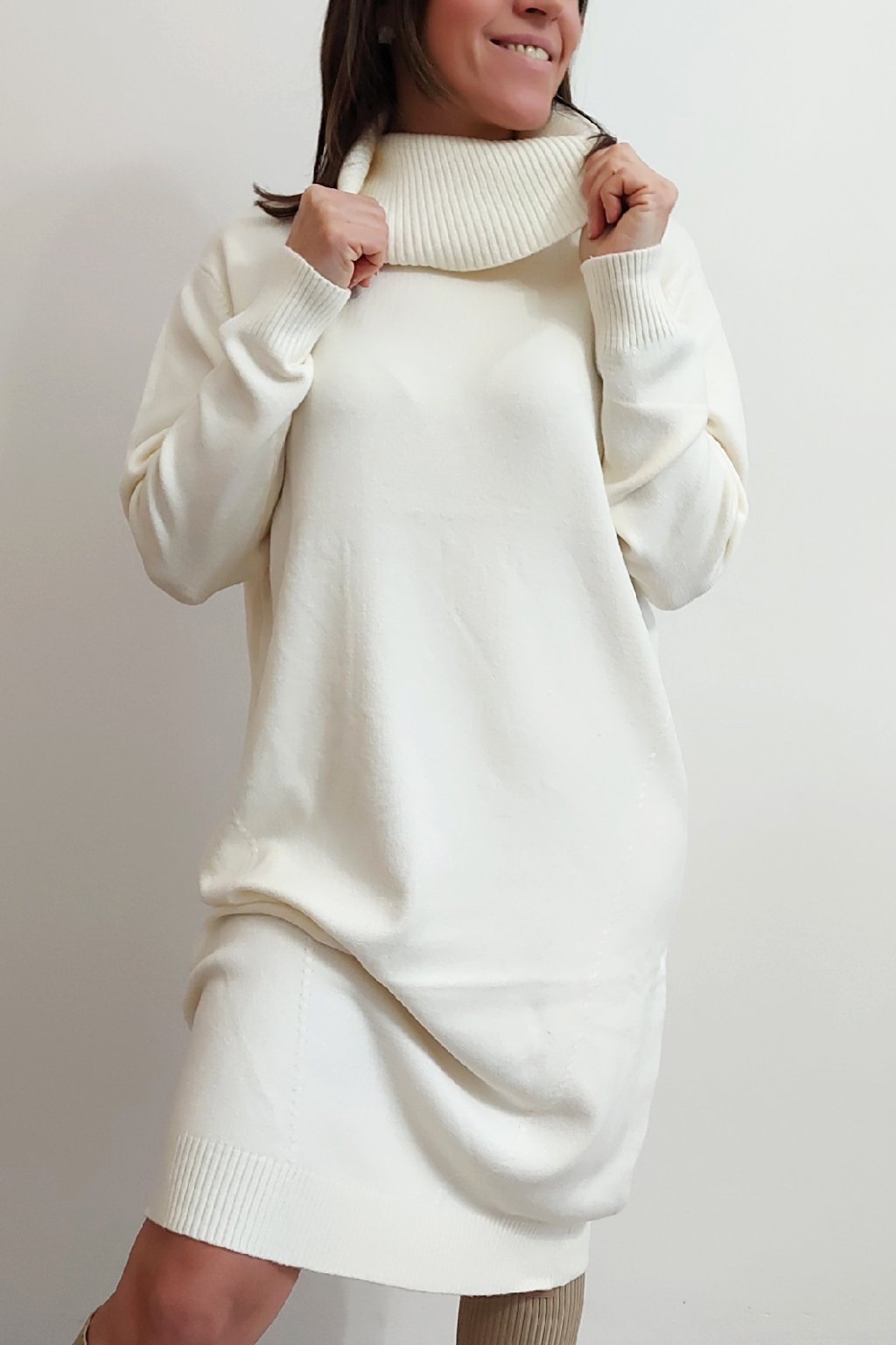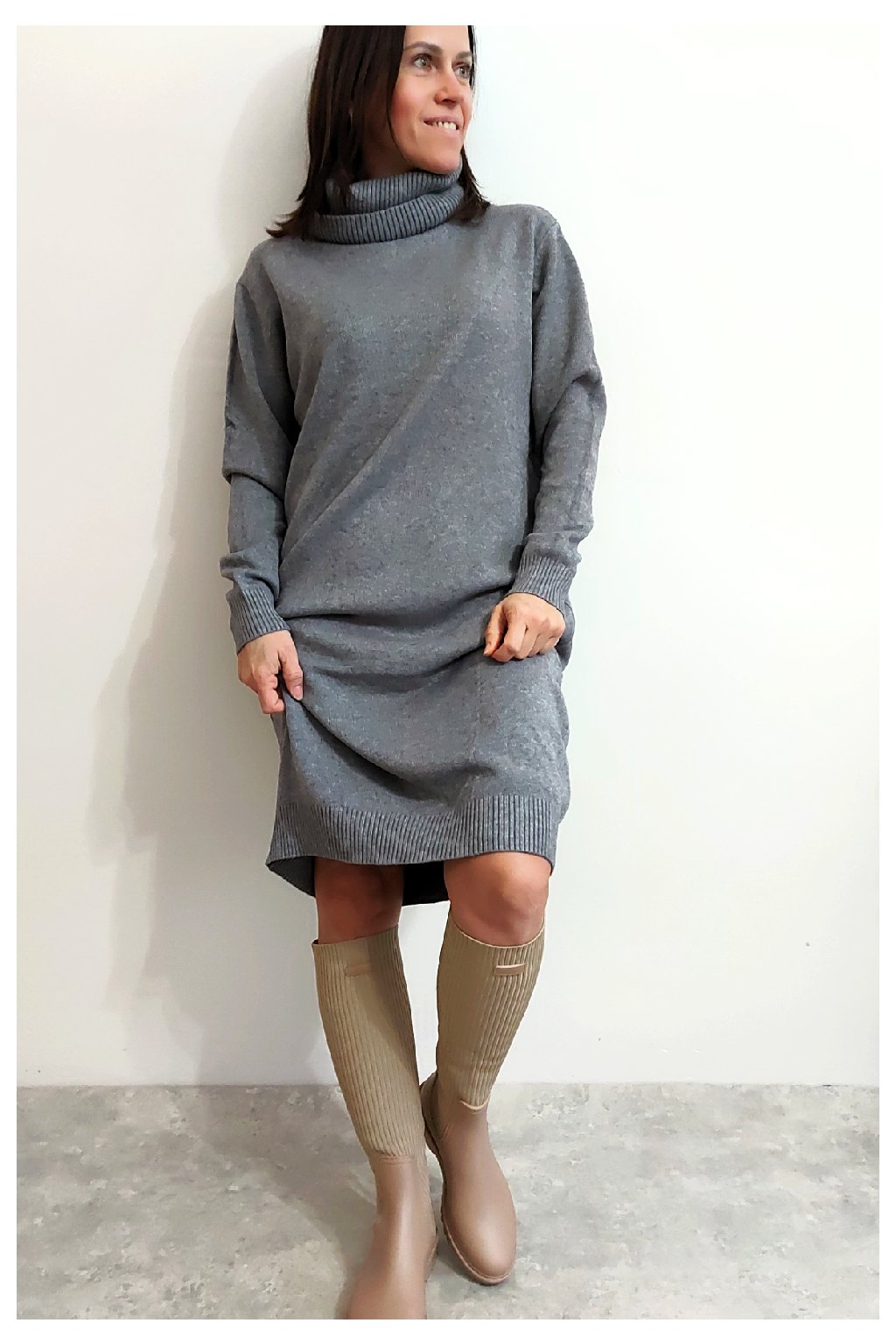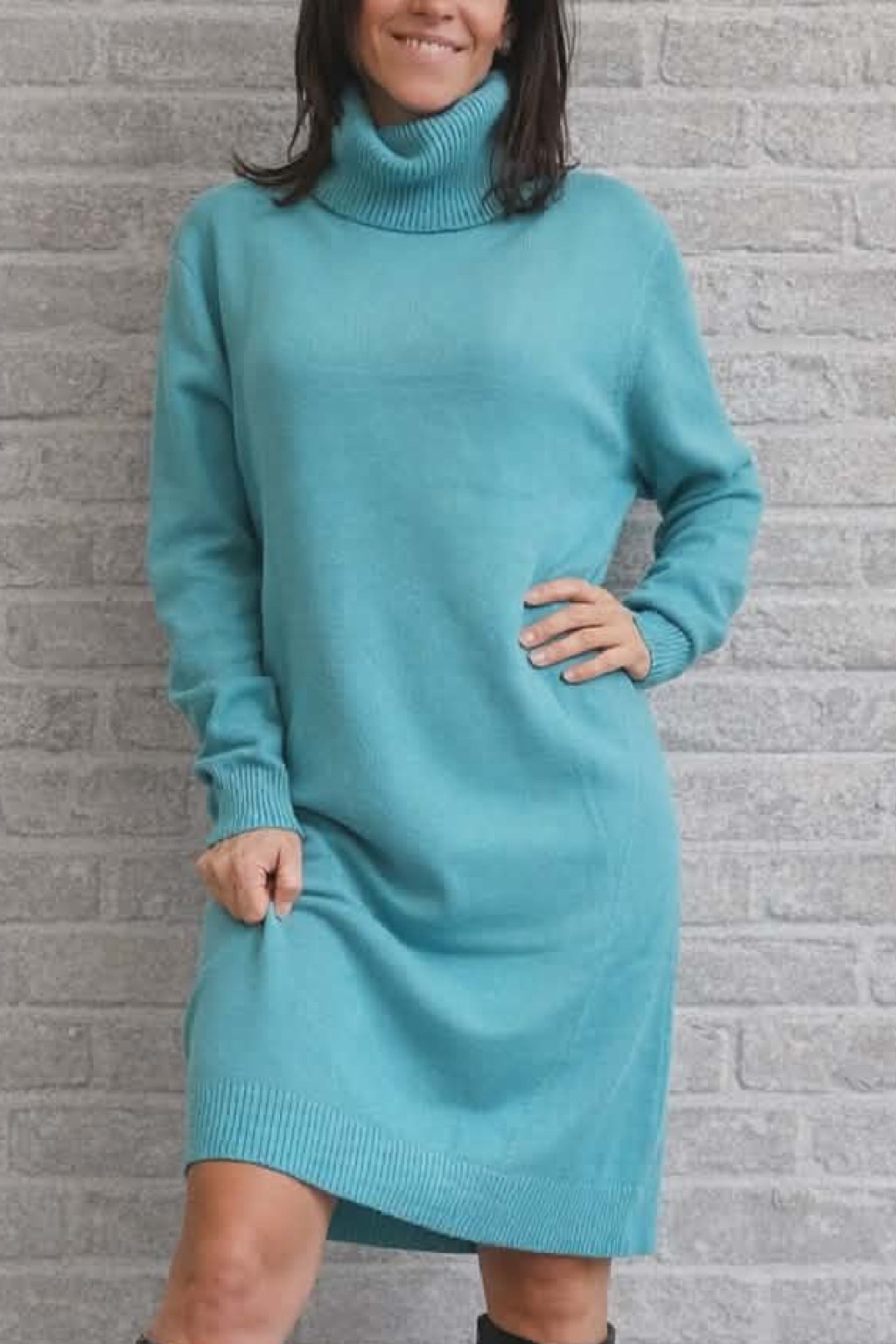 Úpletové šaty s velkým rolákem. Oblékání přes hlavu, bez kapes. Rukávy dlouhé. Vysoce kvalitní, hebký a nekousavý materiál, který je i velmi pružný. Vel. L/XL focena na vel. XS, výška 156cm a vel. XXL/XXXL focena na vel. 2XL (prsa 116cm, pas 110cm, boky 120cm), výška 165cm.