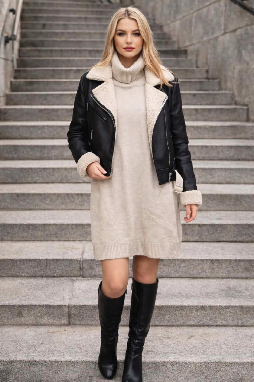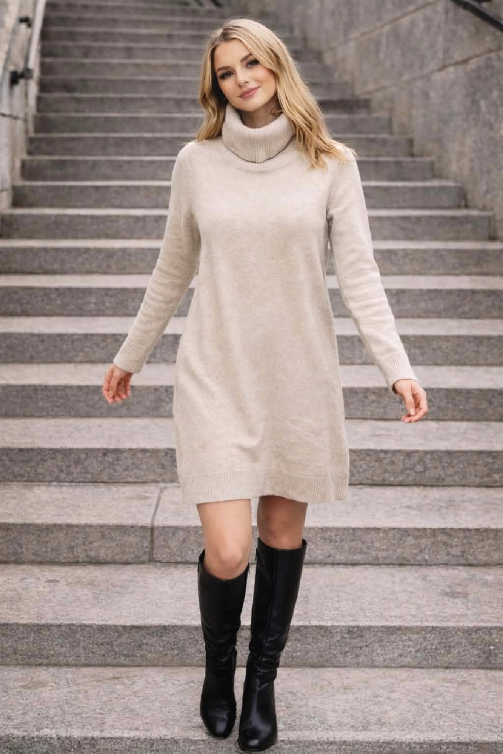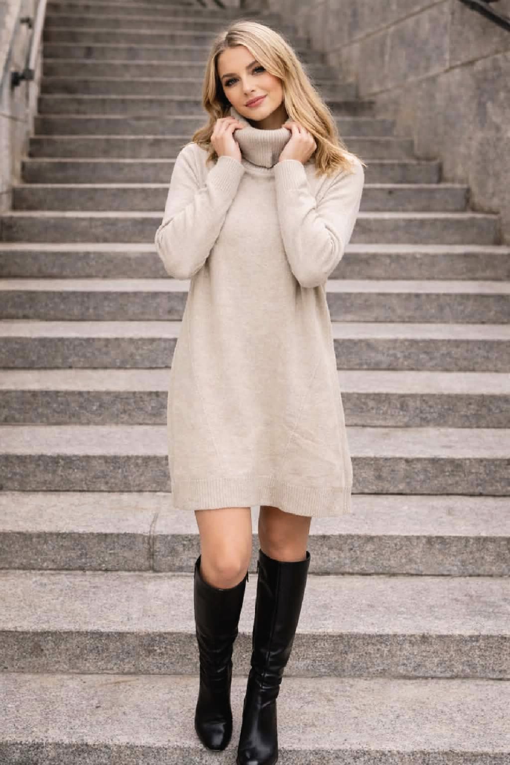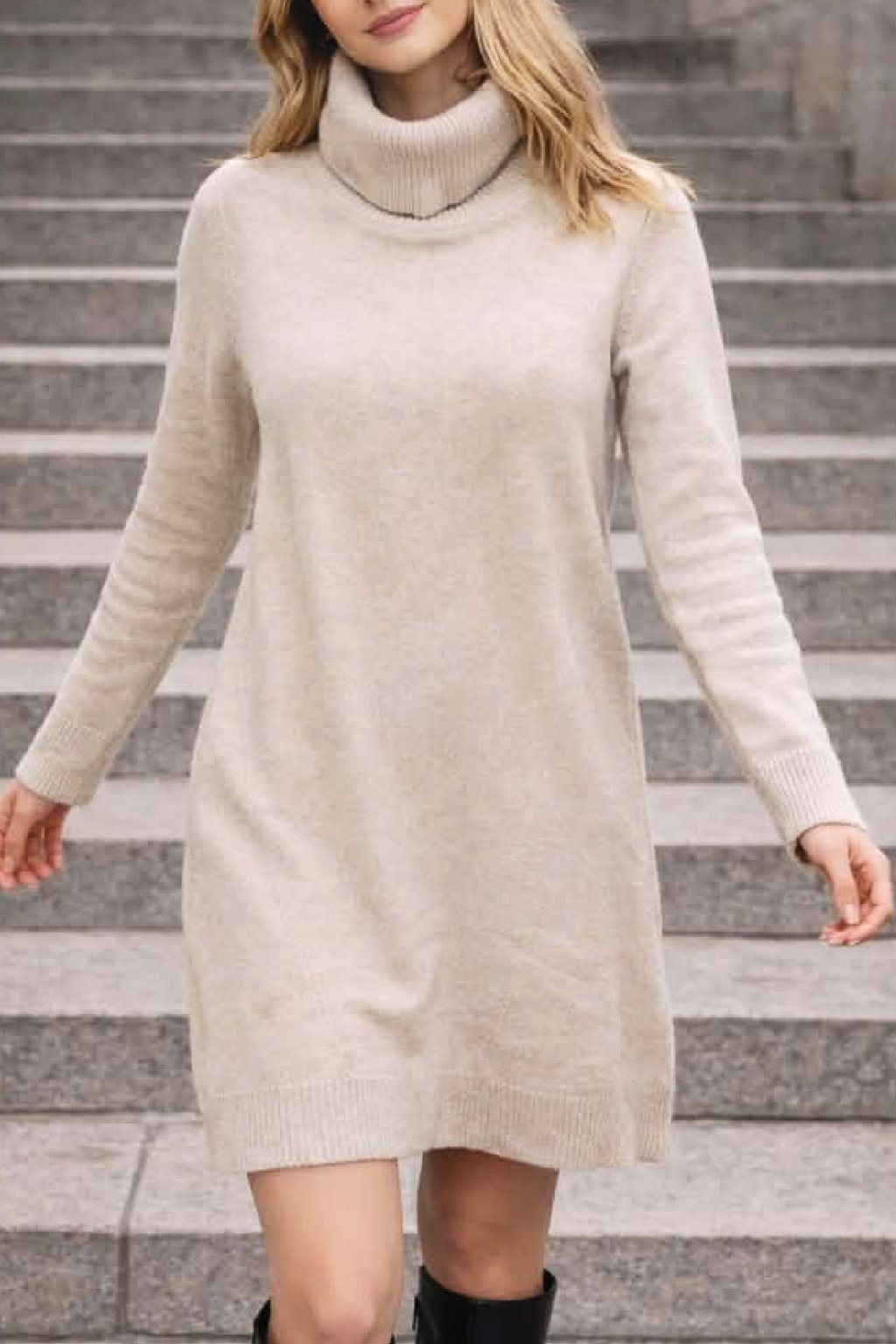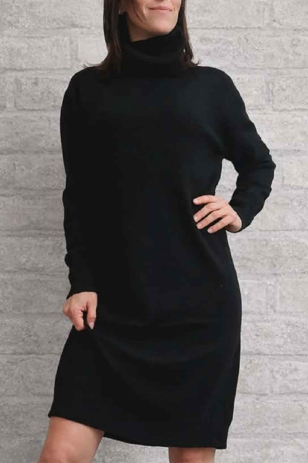 Úpletové šaty s velkým rolákem. Oblékání přes hlavu, bez kapes. Rukávy dlouhé. Vysoce kvalitní, hebký a nekousavý materiál, který je i velmi pružný. Vel. L/XL focena na vel. XS, výška 156cm a vel. XXL/XXXL focena na vel. 2XL (prsa 116cm, pas 110cm, boky 120cm), výška 165cm.