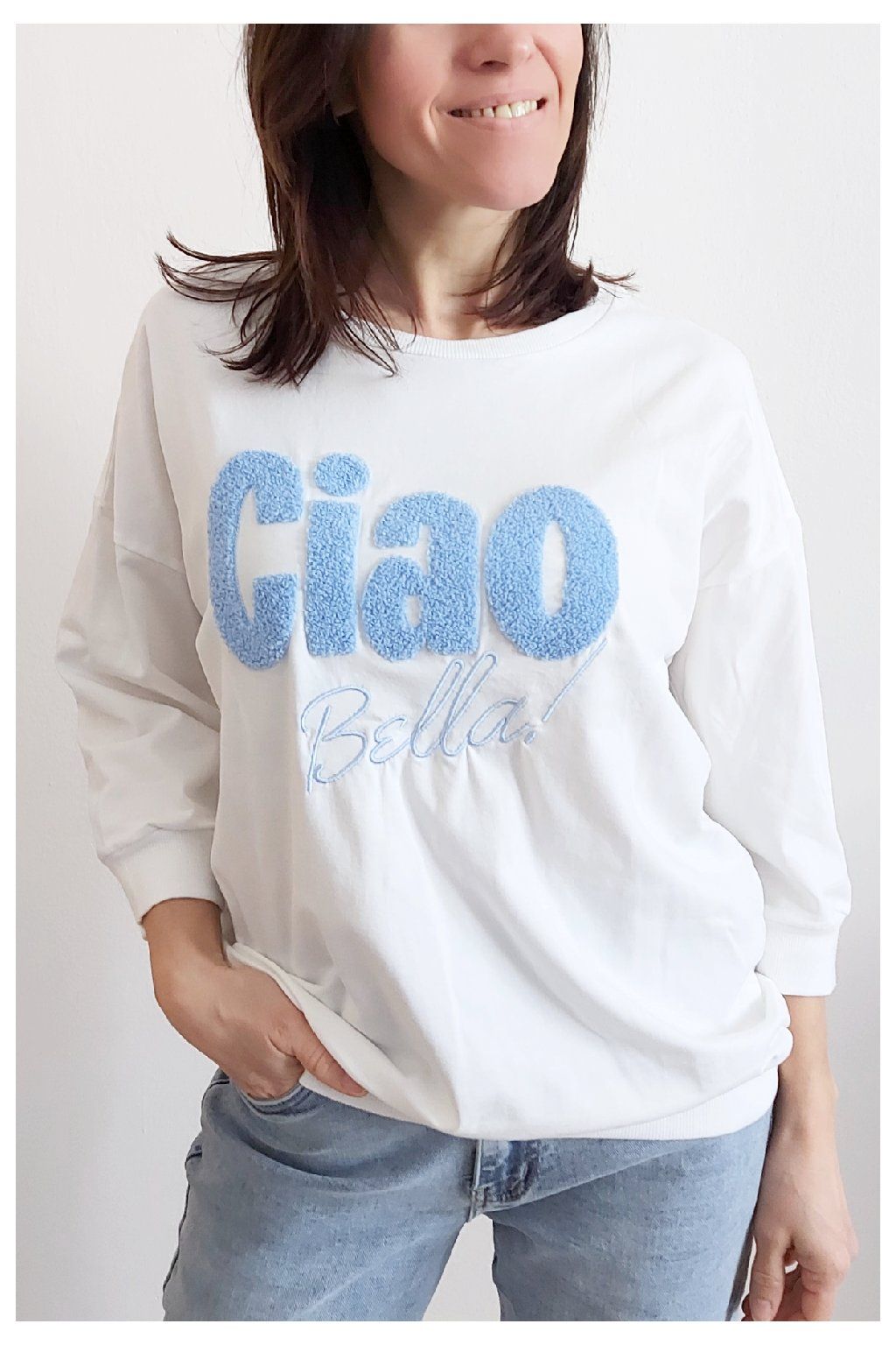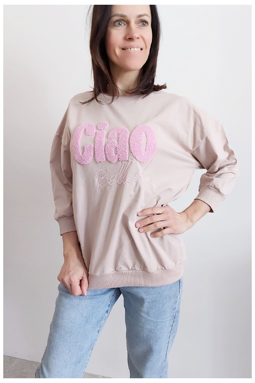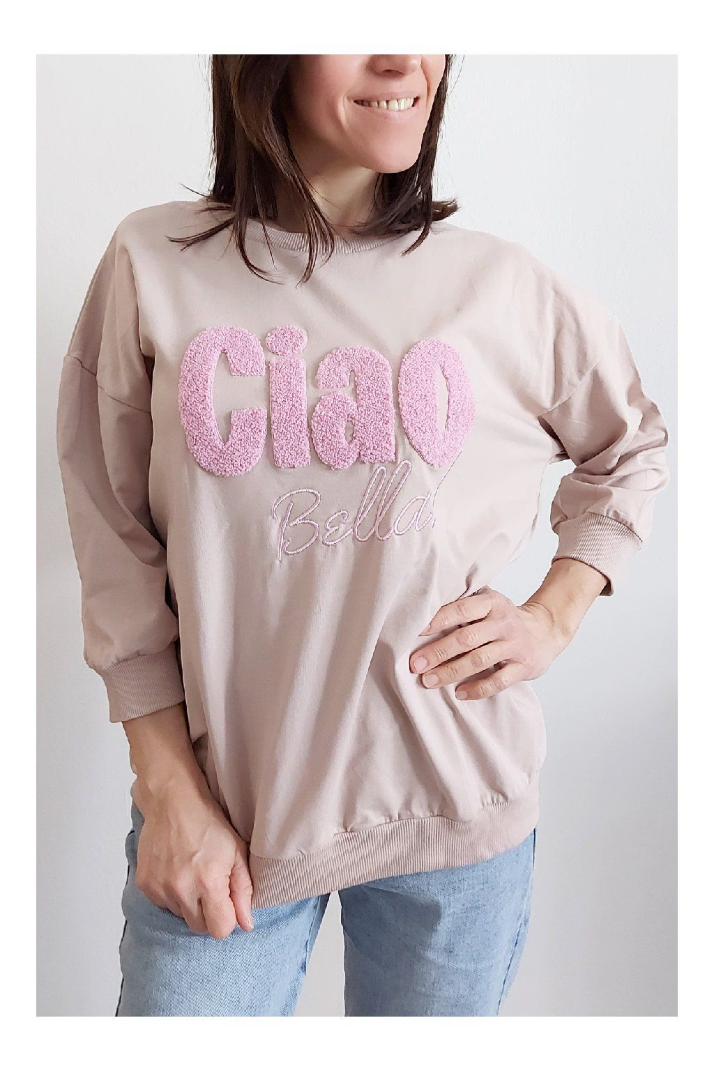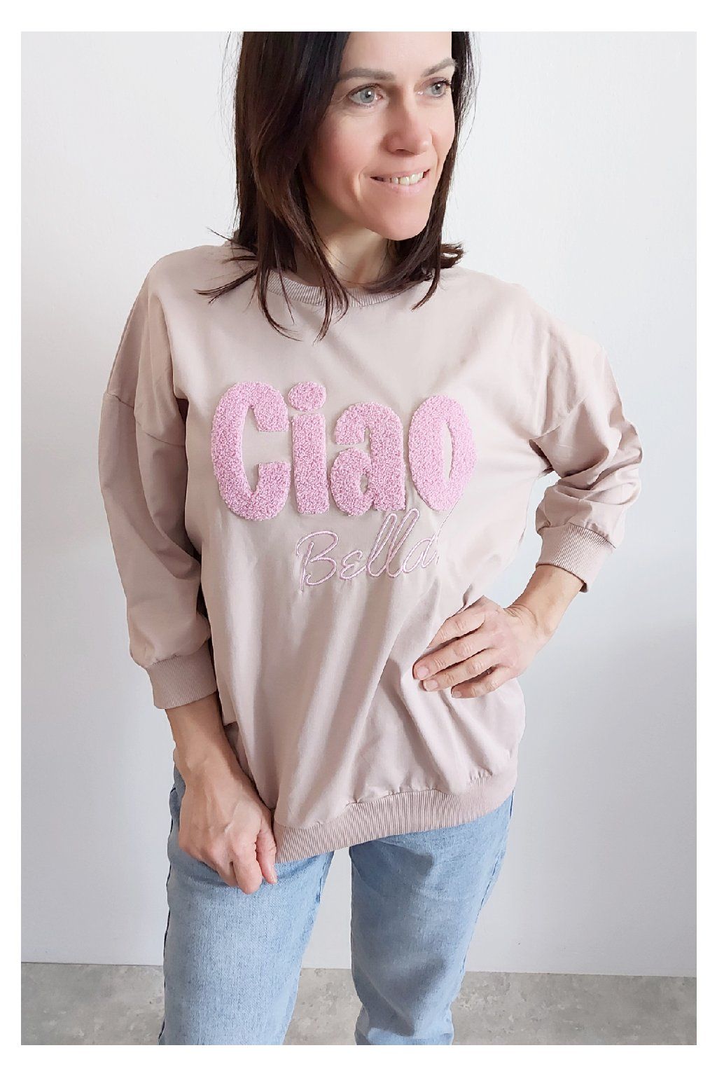 Trendy mikina přes hlavu. Vpředu na prsou je nápis Ciao Bella, který je lehce vystouplý a vyplněný chlupatým materiálem slovo bella je vyšité. Rukávy jsou 3/4 délky. Jsou ukončené pružným lemem. Tím je ukončený i spodní díl mikiny. Materiál je tenčí, ale bavlna vysoké gramáže - top kvalita. Foceno na vel. XS, výška 156cm.