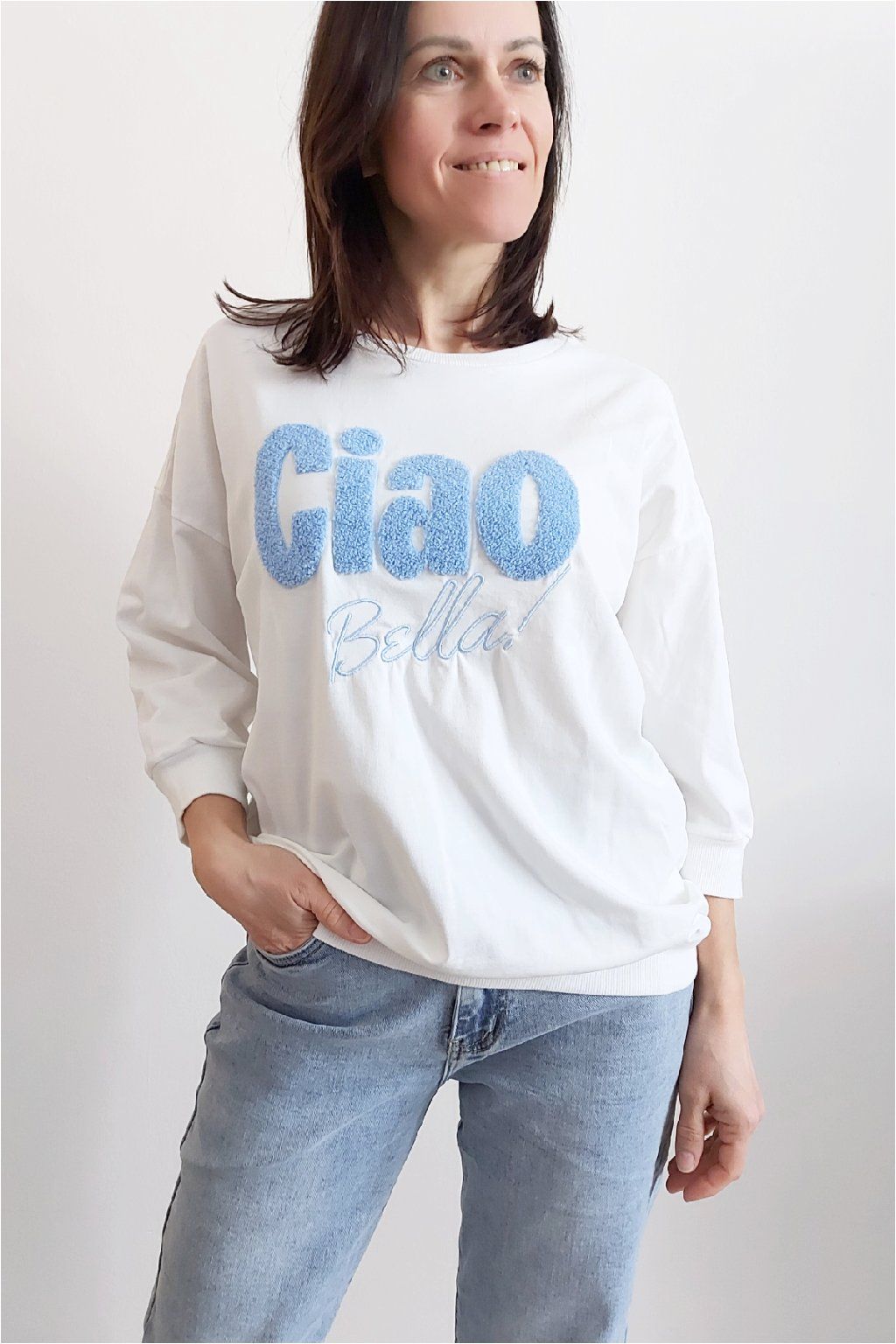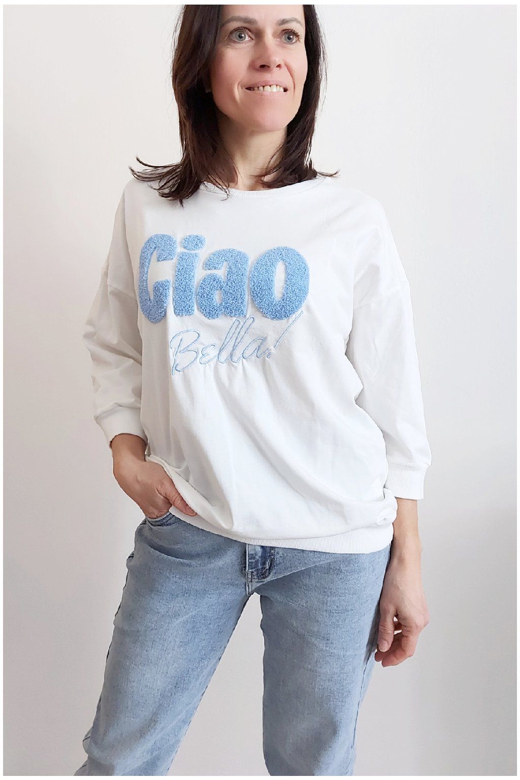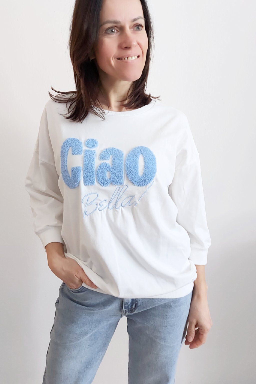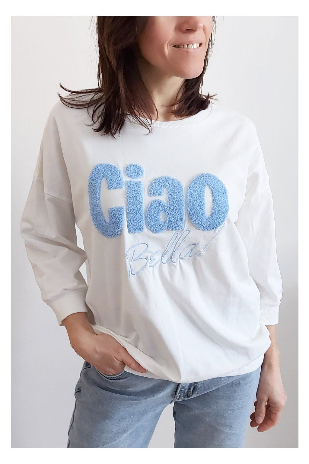 Trendy mikina přes hlavu. Vpředu na prsou je nápis Ciao Bella, který je lehce vystouplý a vyplněný chlupatým materiálem slovo bella je vyšité. Rukávy jsou 3/4 délky. Jsou ukončené pružným lemem. Tím je ukončený i spodní díl mikiny. Materiál je tenčí, ale bavlna vysoké gramáže - top kvalita. Foceno na vel. XS, výška 156cm.
