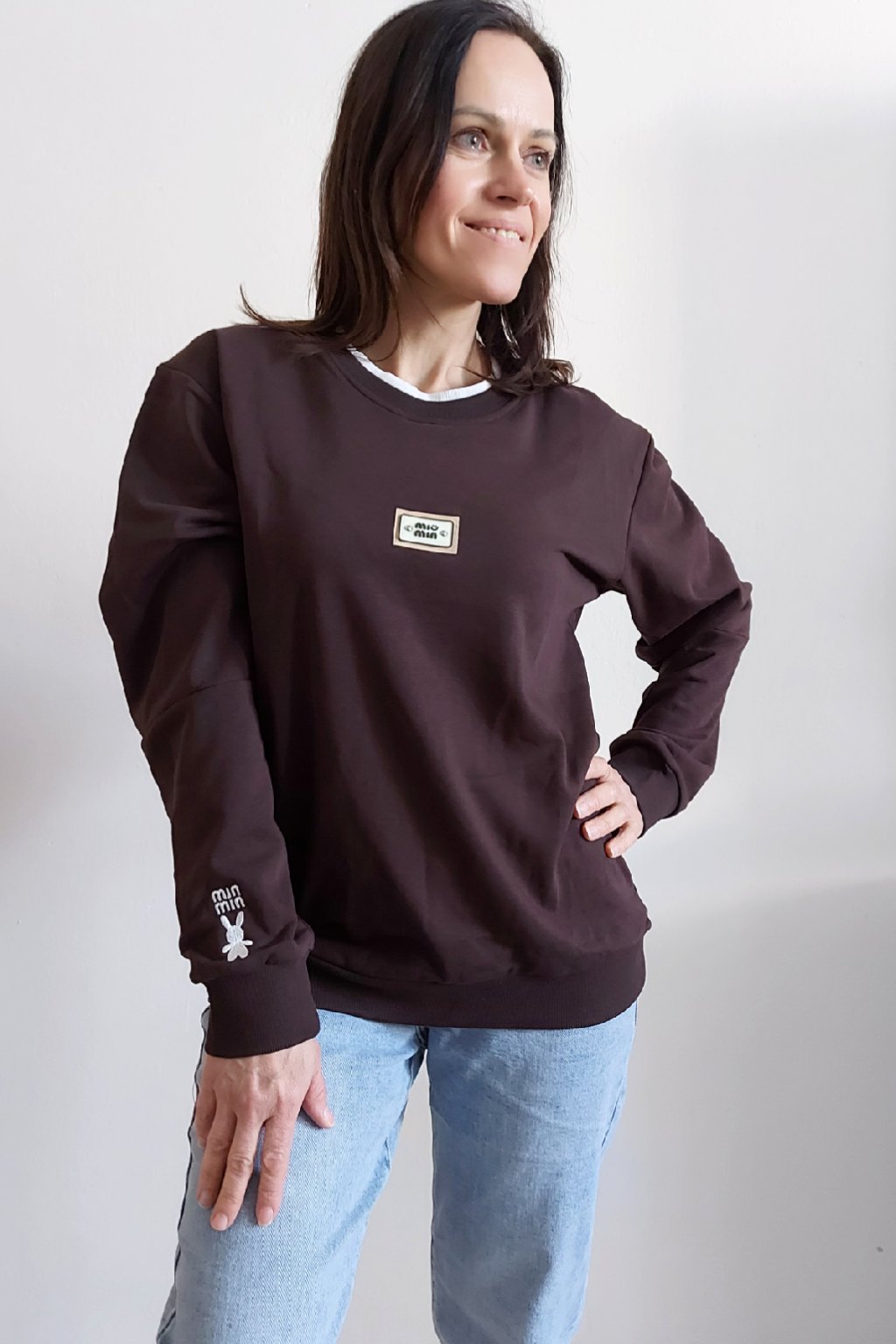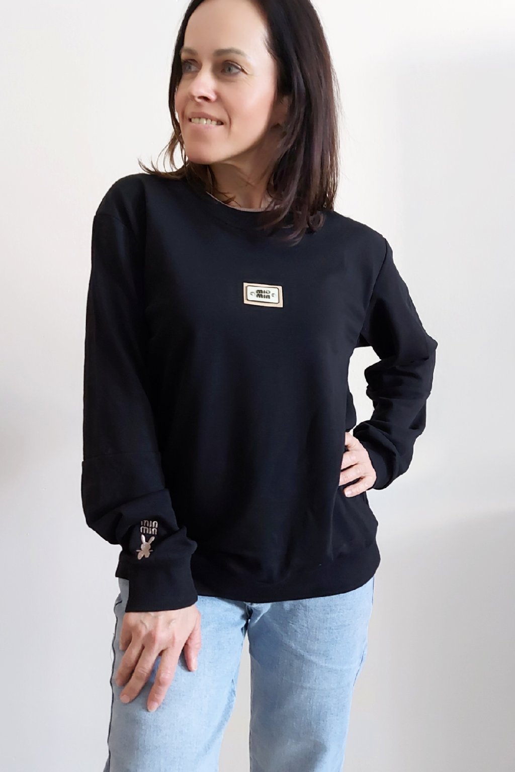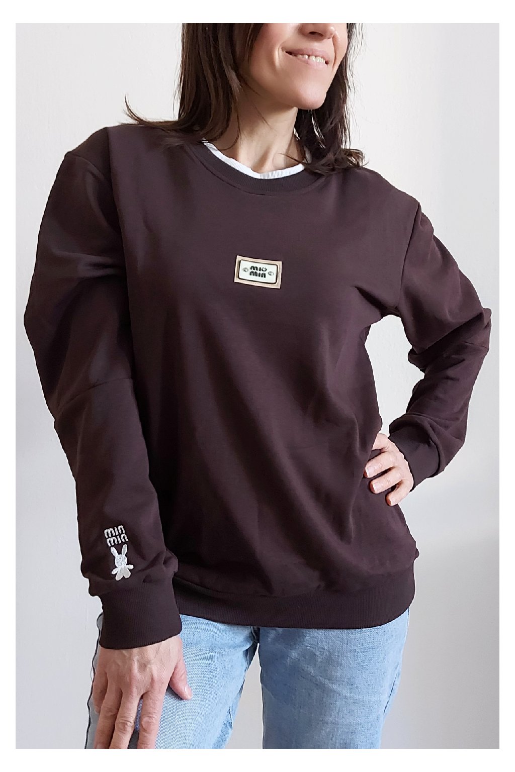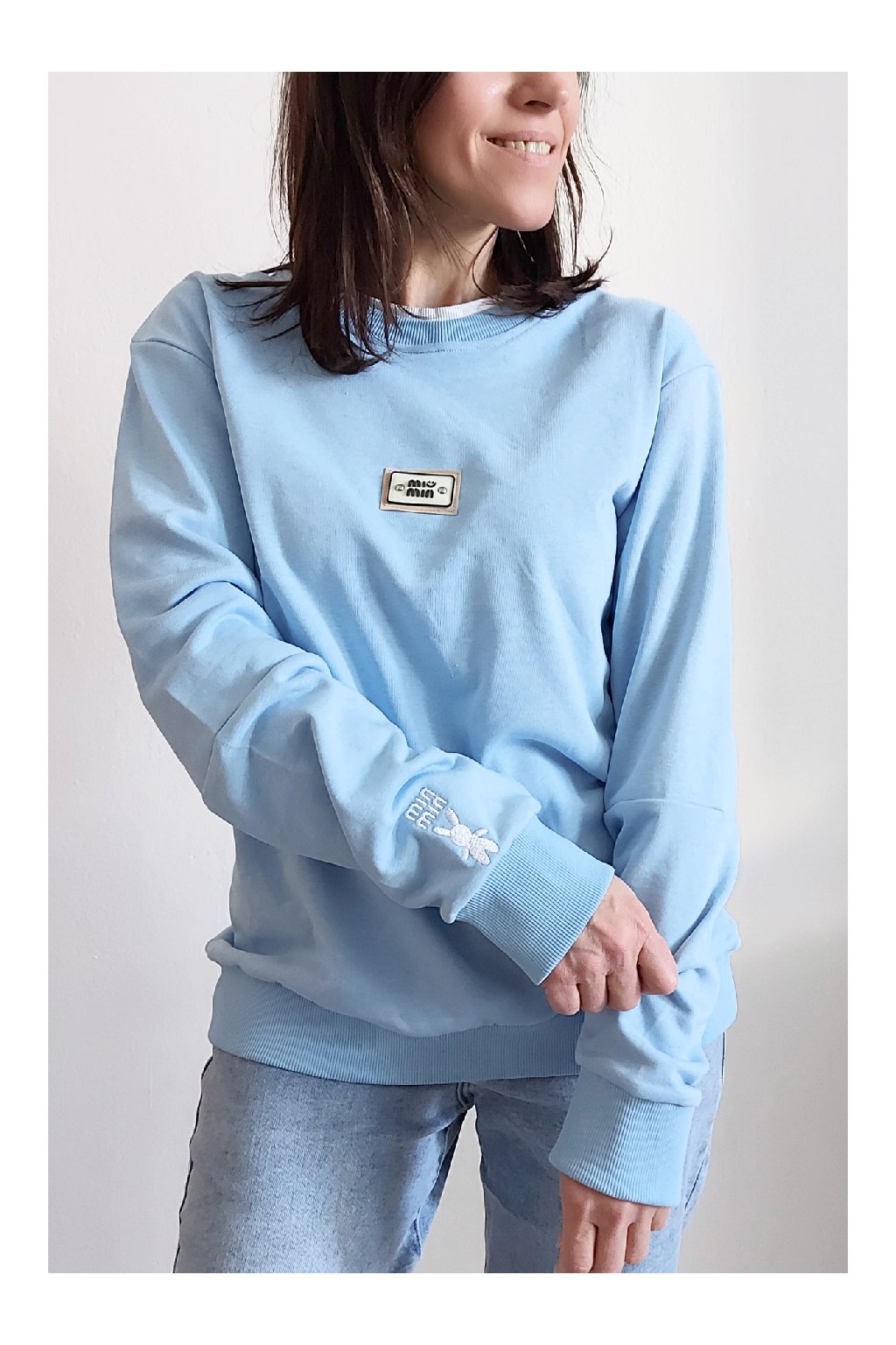 Bavlněná mikina s ozdobou na prsou a výšivkou na rukávu. Výstřih je kulatý a je podšitý i jinou barvou. Rukávy dlouhé ukončené úpletem. Spodní lem také zakončen úpletem. Na prsou ozdobná placka, na jednom z rukávu vyšitý módní detail v podobě králíčka a nápisu min min. Materiál bavlněný, není silný, je ideální na jaro a podzim. Foceno na vel. XS, výška 156cm.