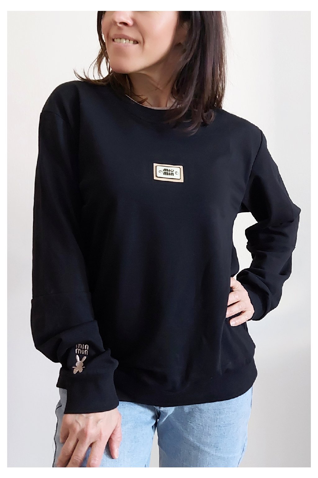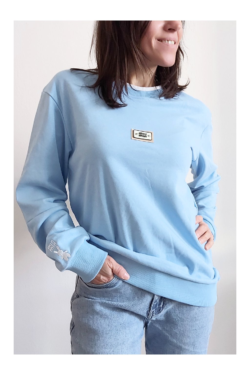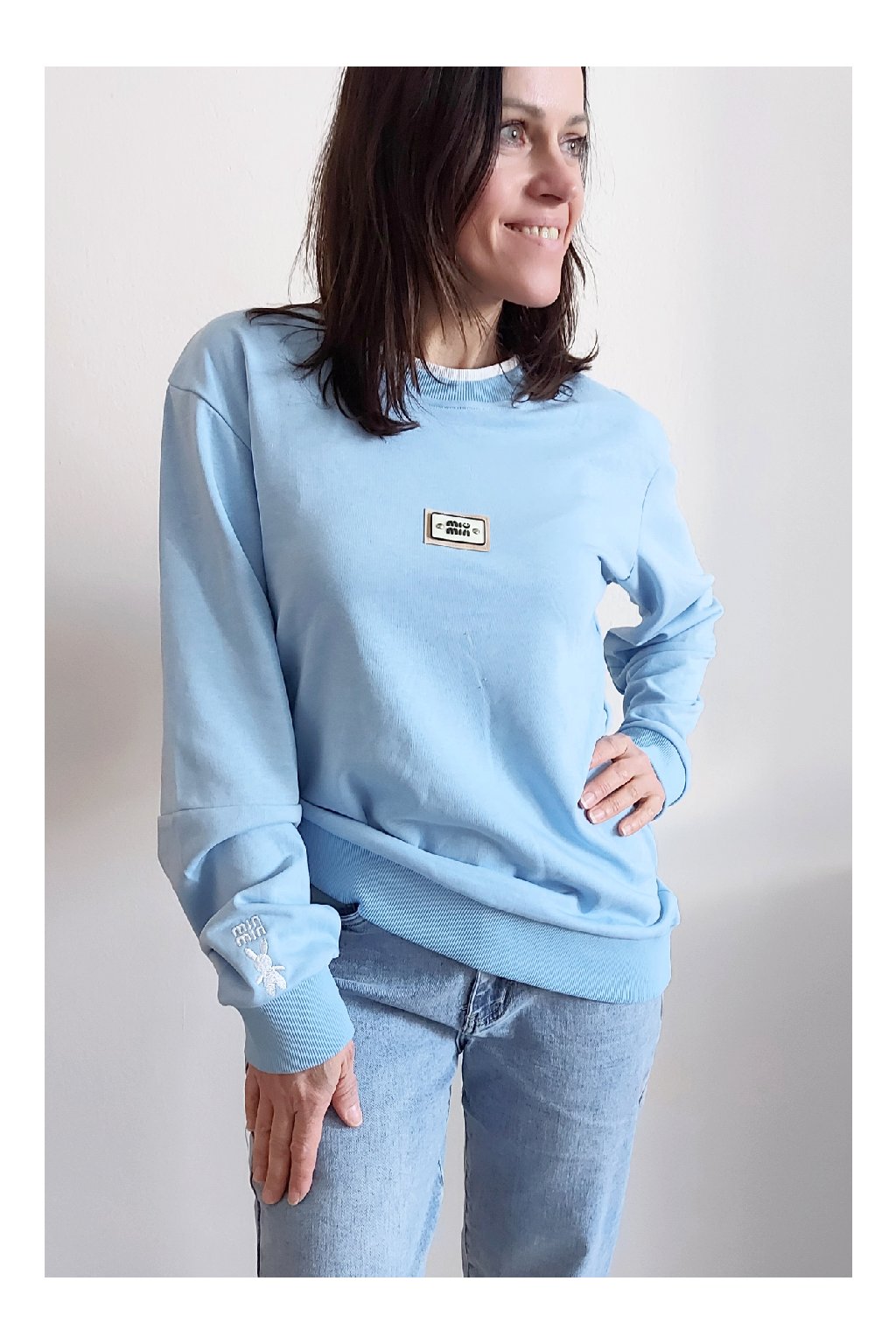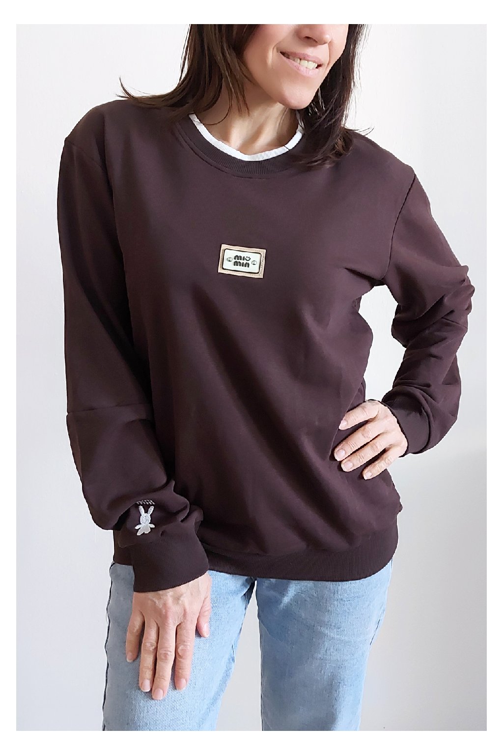 Bavlněná mikina s ozdobou na prsou a výšivkou na rukávu. Výstřih je kulatý a je podšitý i jinou barvou. Rukávy dlouhé ukončené úpletem. Spodní lem také zakončen úpletem. Na prsou ozdobná placka, na jednom z rukávu vyšitý módní detail v podobě králíčka a nápisu min min. Materiál bavlněný, není silný, je ideální na jaro a podzim. Foceno na vel. XS, výška 156cm.