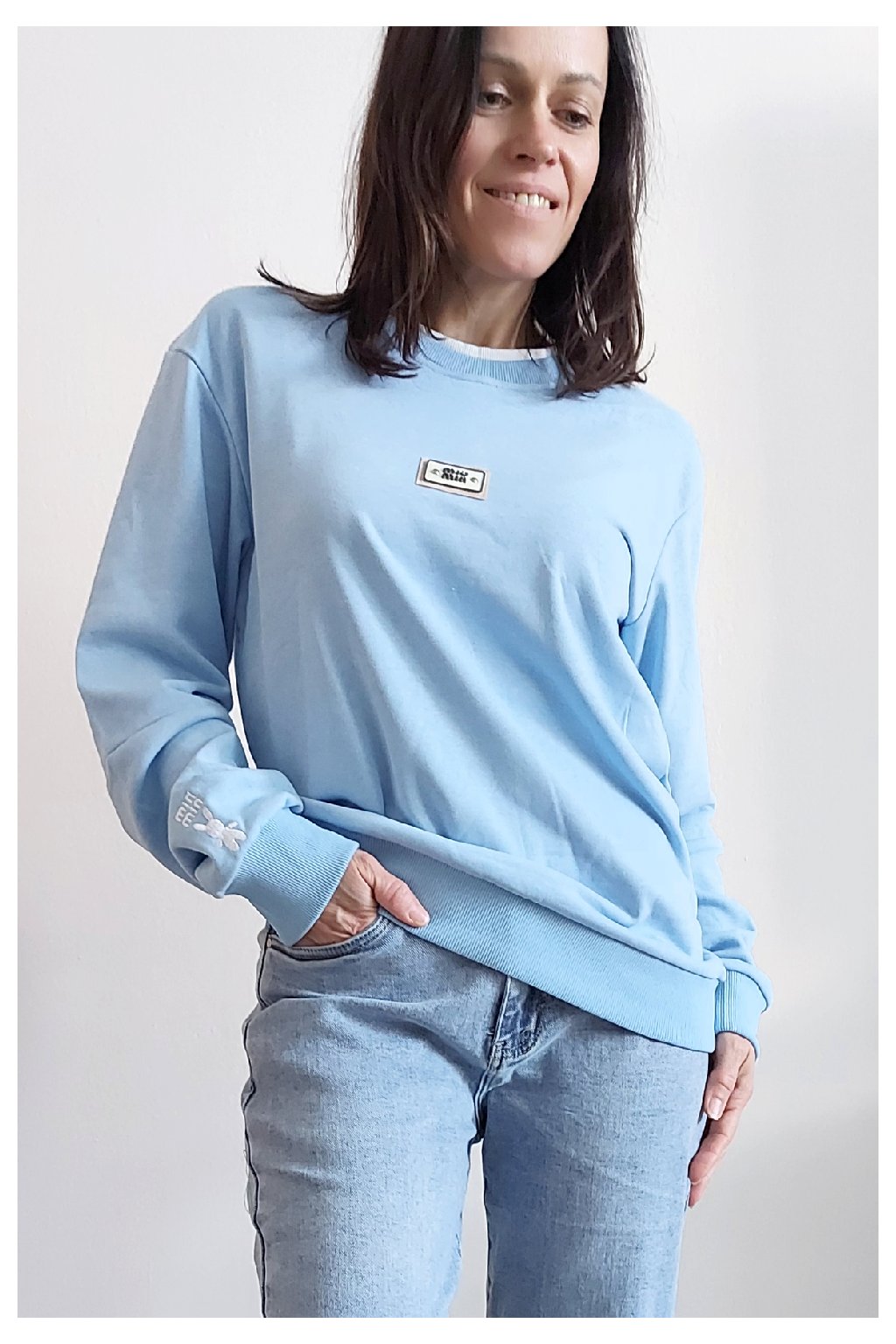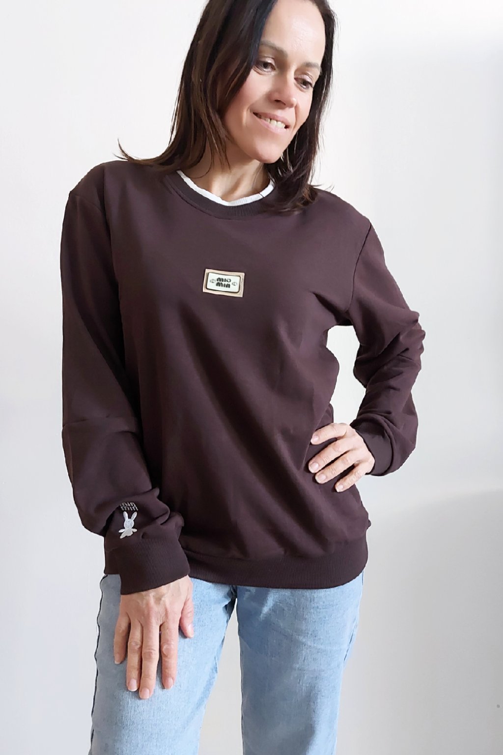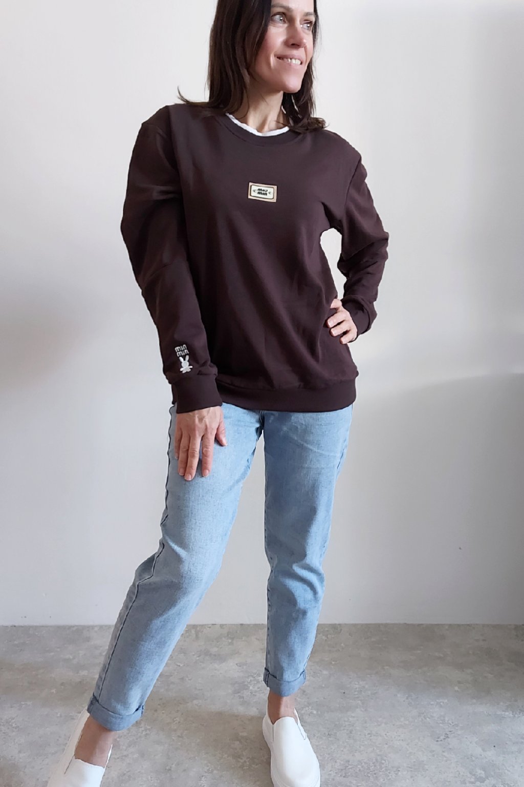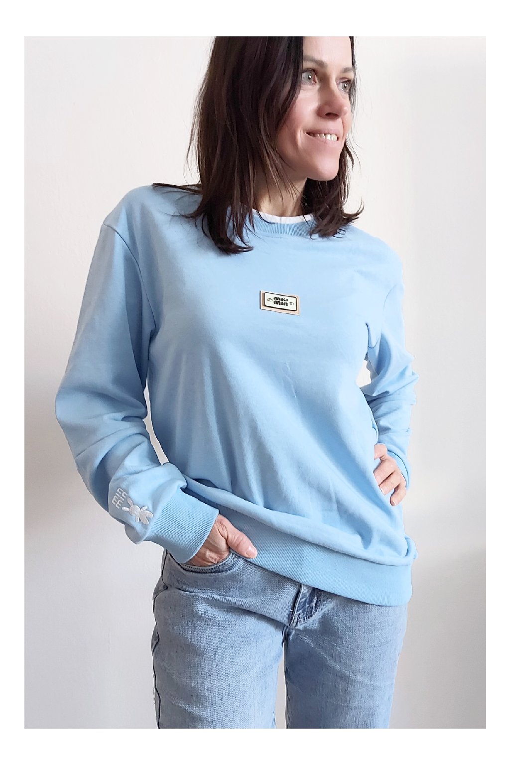 Bavlněná mikina s ozdobou na prsou a výšivkou na rukávu. Výstřih je kulatý a je podšitý i jinou barvou. Rukávy dlouhé ukončené úpletem. Spodní lem také zakončen úpletem. Na prsou ozdobná placka, na jednom z rukávu vyšitý módní detail v podobě králíčka a nápisu min min. Materiál bavlněný, není silný, je ideální na jaro a podzim. Foceno na vel. XS, výška 156cm.