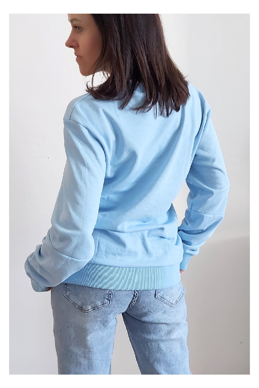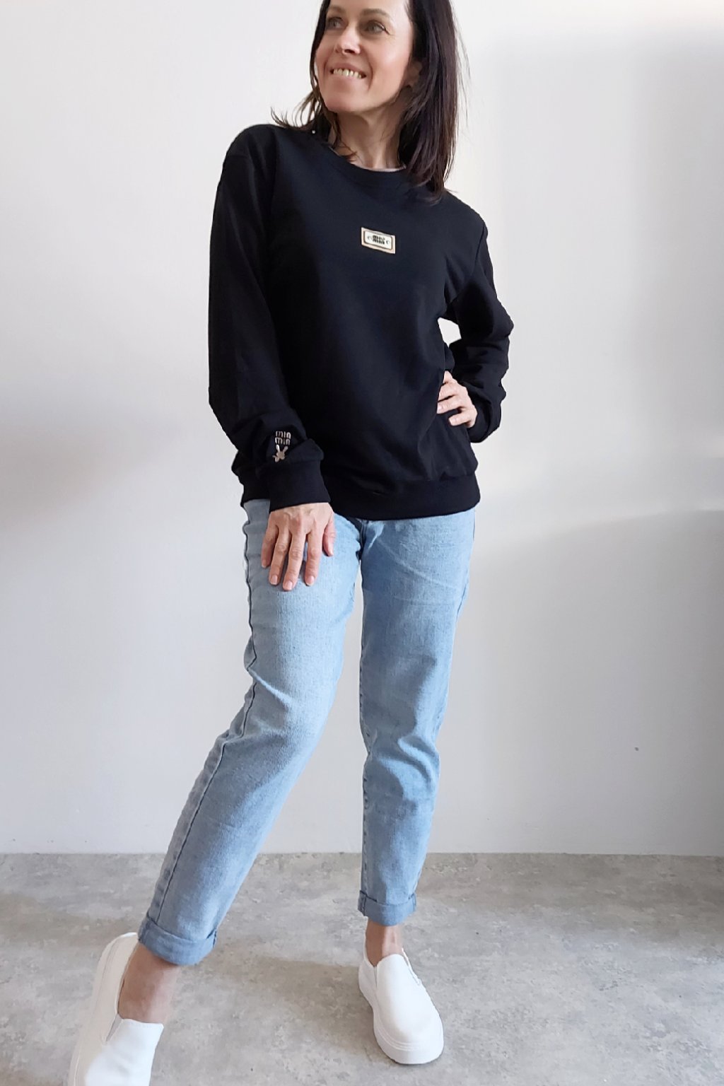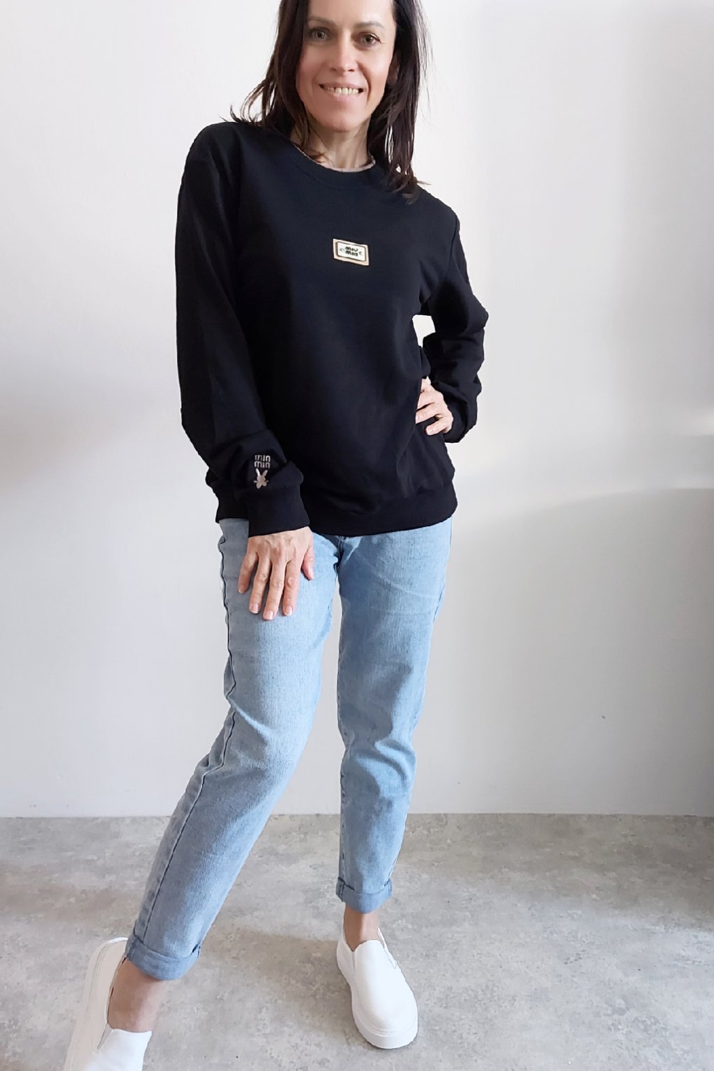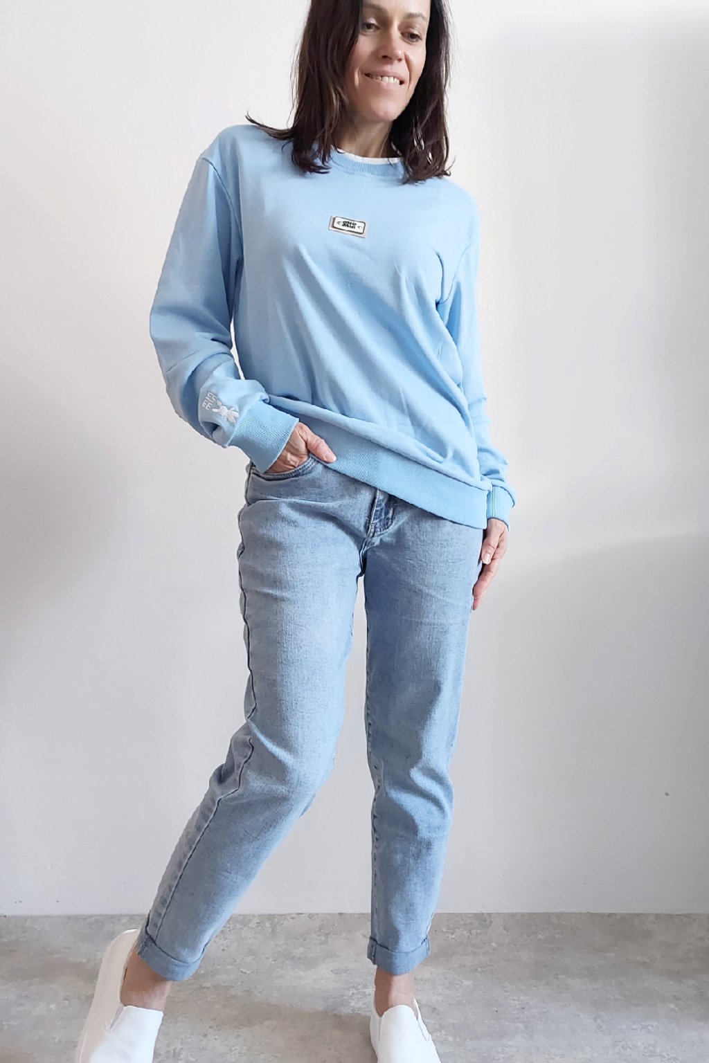 Bavlněná mikina s ozdobou na prsou a výšivkou na rukávu. Výstřih je kulatý a je podšitý i jinou barvou. Rukávy dlouhé ukončené úpletem. Spodní lem také zakončen úpletem. Na prsou ozdobná placka, na jednom z rukávu vyšitý módní detail v podobě králíčka a nápisu min min. Materiál bavlněný, není silný, je ideální na jaro a podzim. Foceno na vel. XS, výška 156cm.
