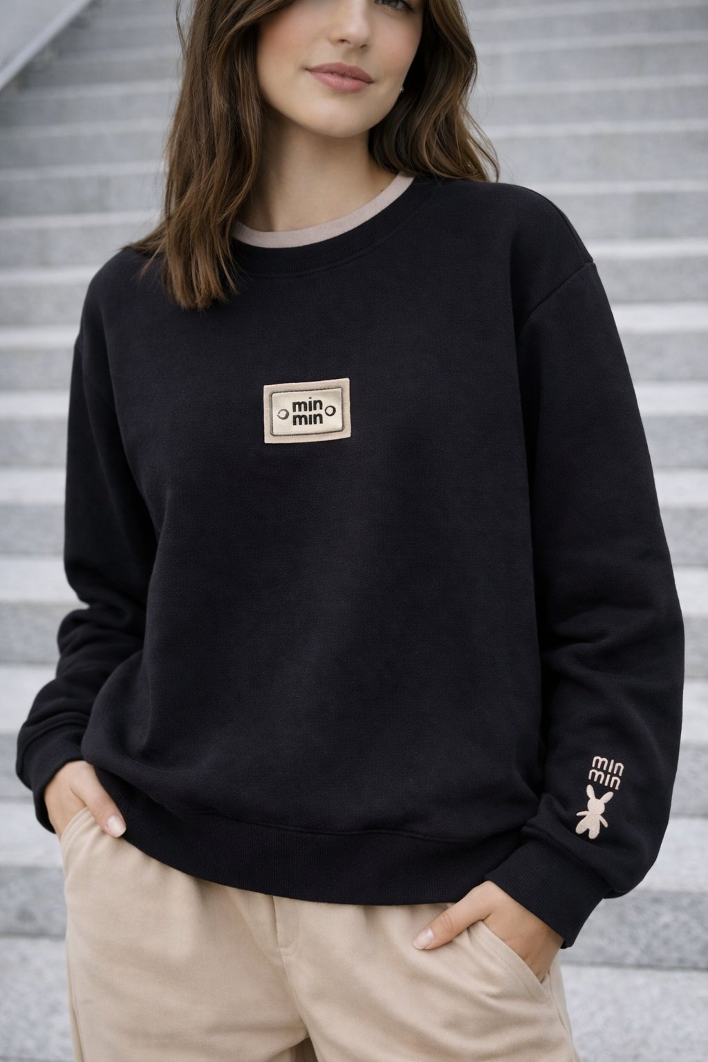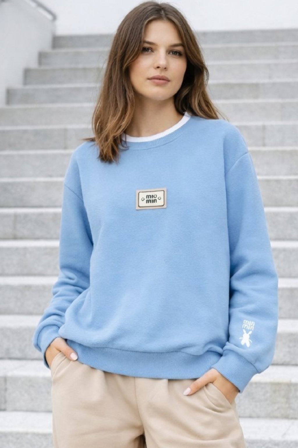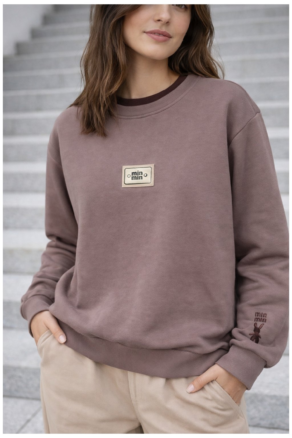 Bavlněná mikina s ozdobou na prsou a výšivkou na rukávu. Výstřih je kulatý a je podšitý i jinou barvou. Rukávy dlouhé ukončené úpletem. Spodní lem také zakončen úpletem. Na prsou ozdobná placka, na jednom z rukávu vyšitý módní detail v podobě králíčka a nápisu min min. Materiál bavlněný, není silný, je ideální na jaro a podzim.