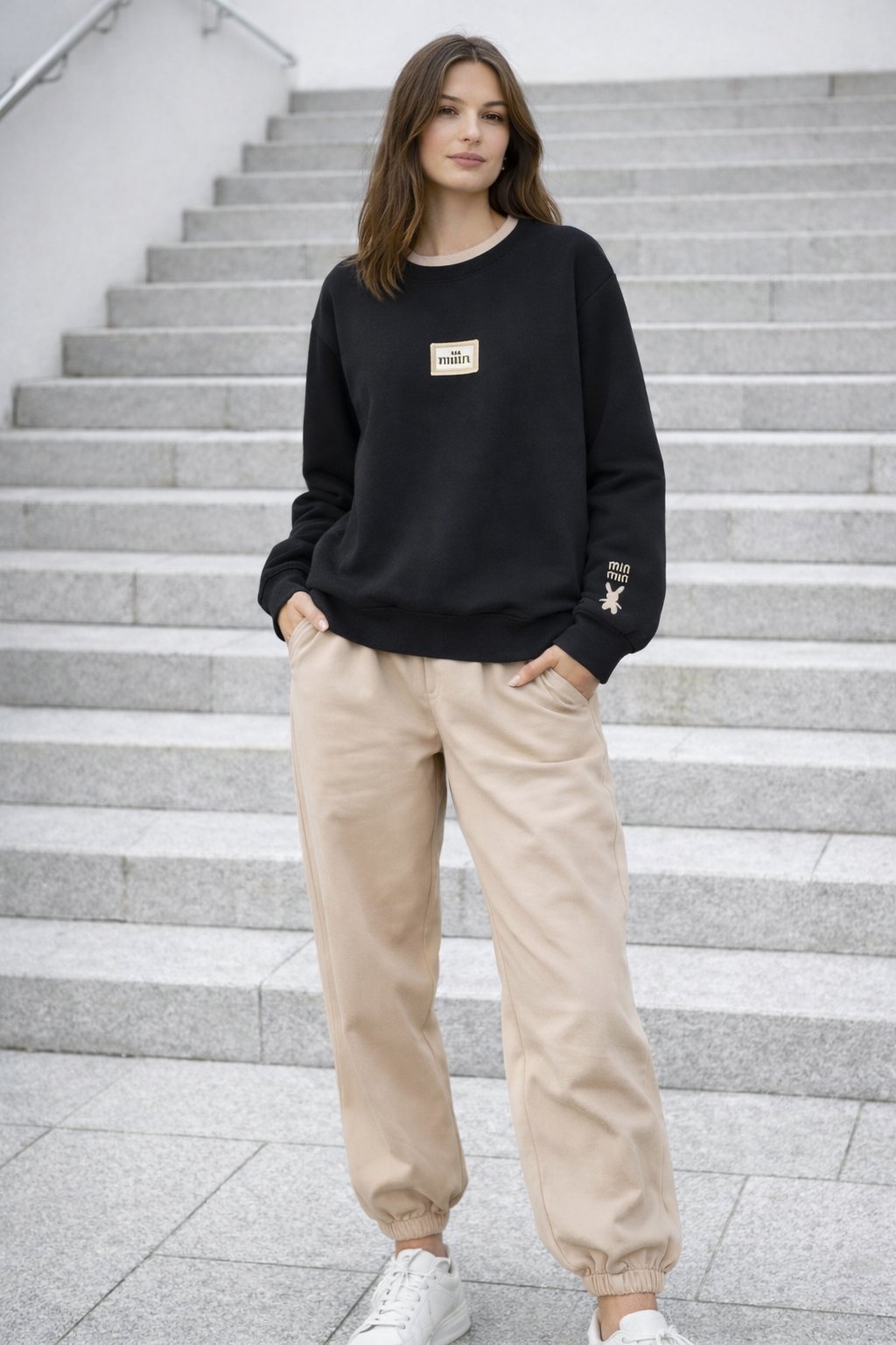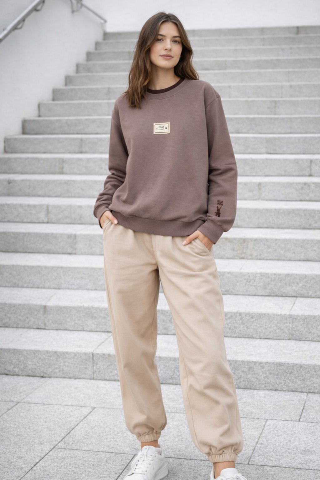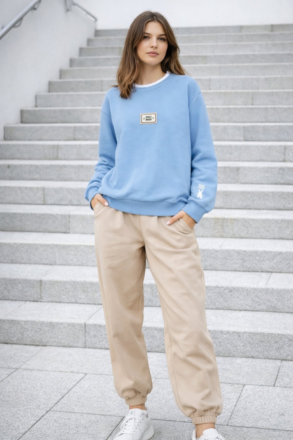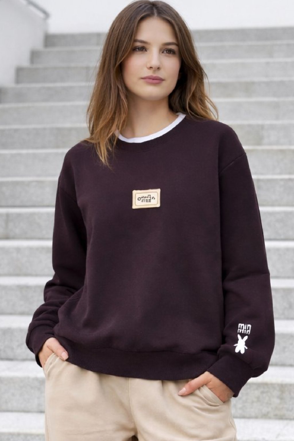 Bavlněná mikina s ozdobou na prsou a výšivkou na rukávu. Výstřih je kulatý a je podšitý i jinou barvou. Rukávy dlouhé ukončené úpletem. Spodní lem také zakončen úpletem. Na prsou ozdobná placka, na jednom z rukávu vyšitý módní detail v podobě králíčka a nápisu min min. Materiál bavlněný, není silný, je ideální na jaro a podzim.